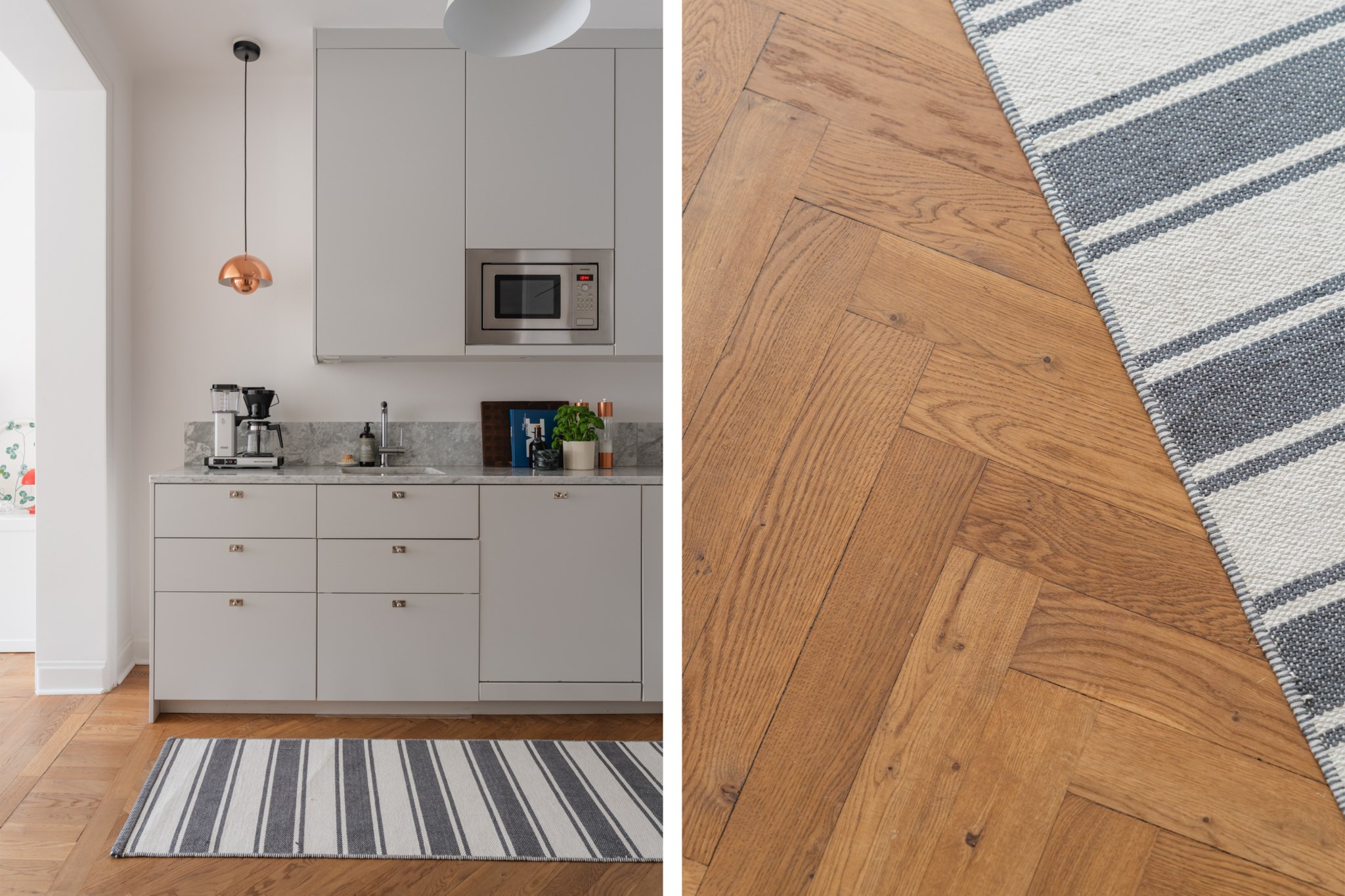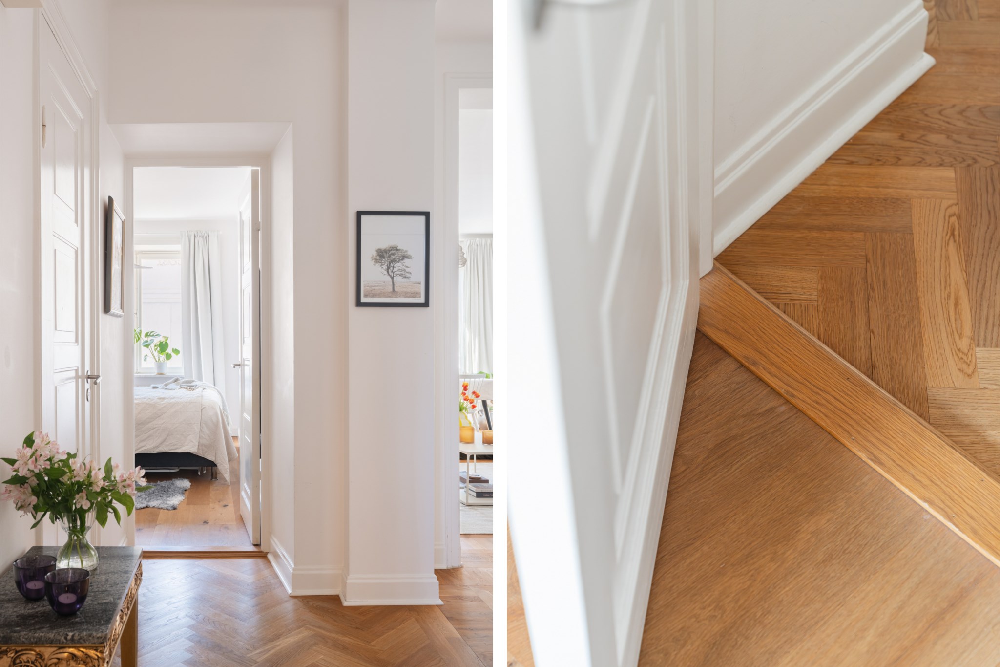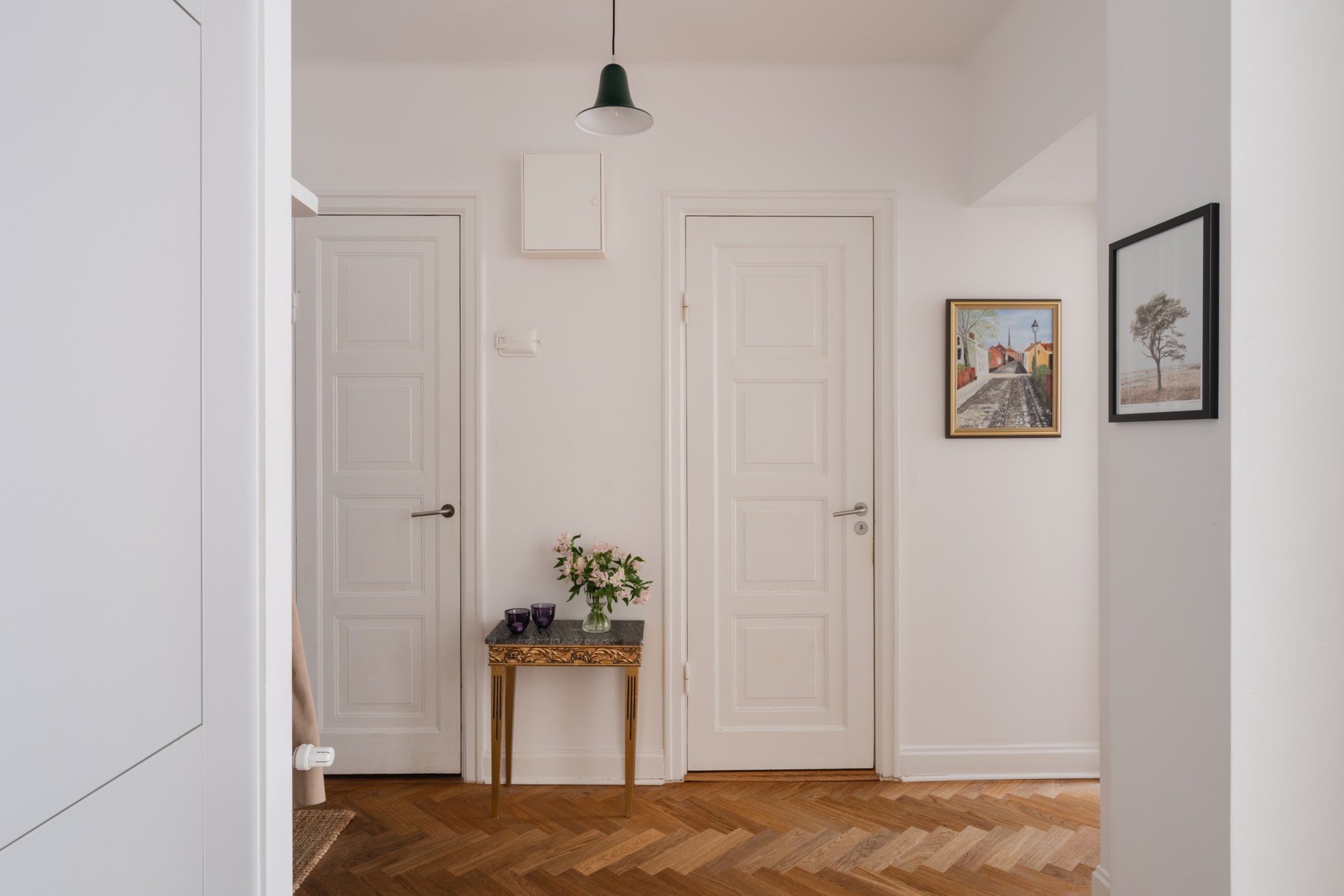 Välkomnande hall med plats för avhängning, skoställ samt mindre avlastningsmöblemang efter smak och behov. Gott om plats för förvaring via intilliggande garderob. Tidlösa ytskikt bestående av ljusa väggar och ljus fiskbensparkett.