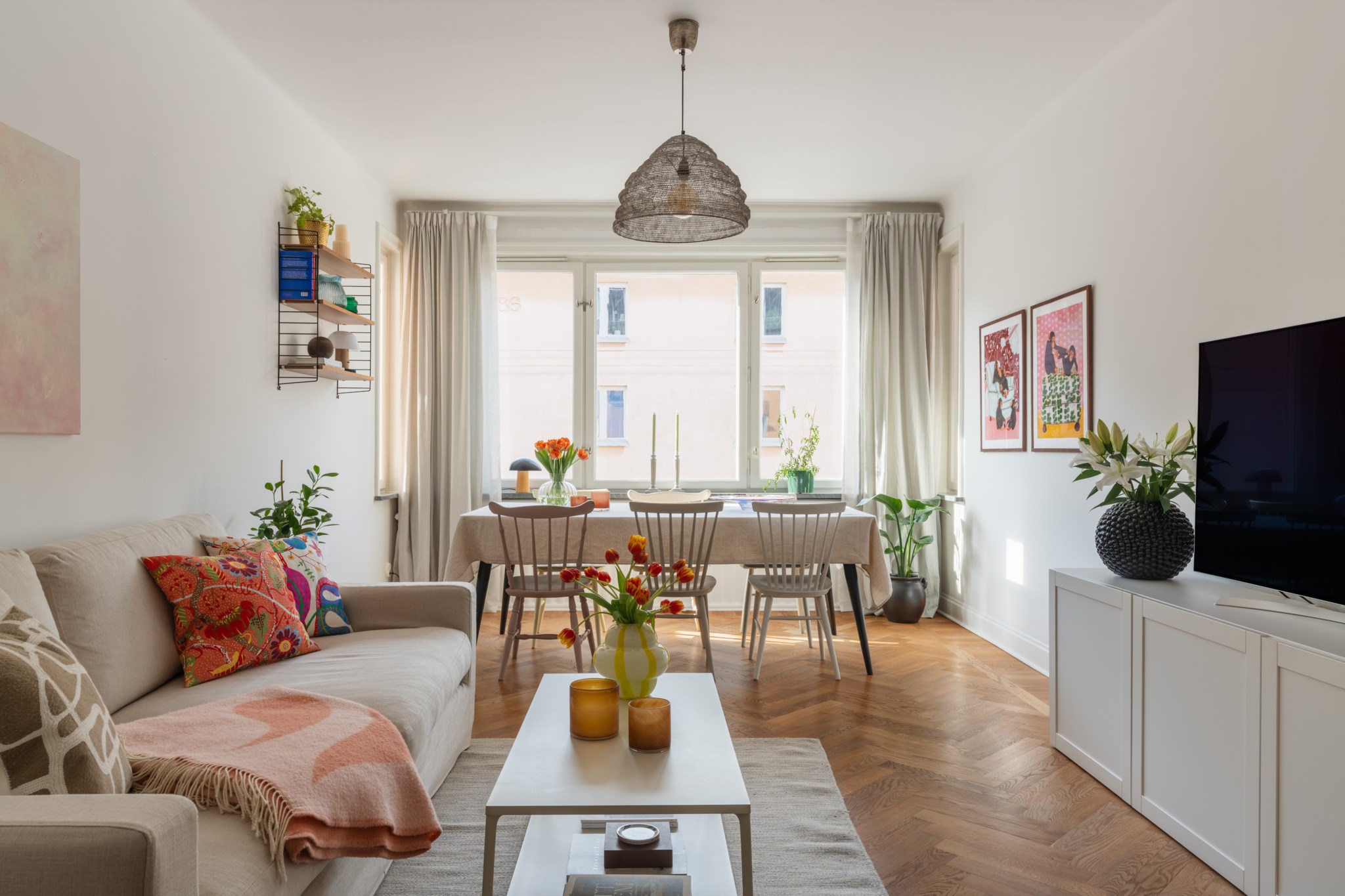 Luftigt vardagsrum med tidlösa ytskikt bestående av ljusa väggar och ljus fiskbensparkett. I vardagsrummet inryms matgrupp, soffa, soffbord, TV-möbel samt annat möblemang efter smak och behov. Här möts du av ett härligt ljusinsläpp via stora fönster.