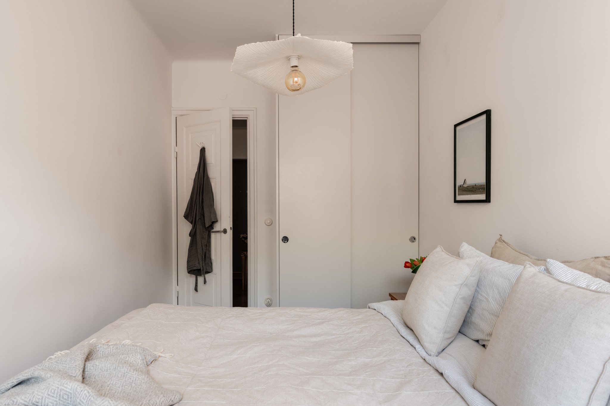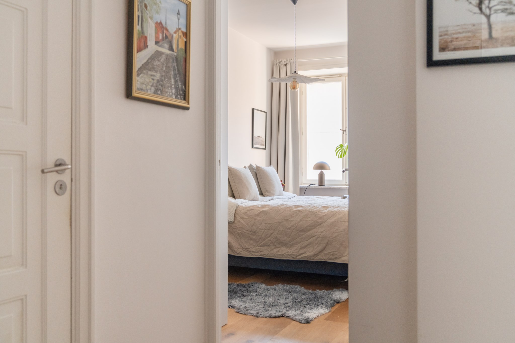 Stort sovrum med plats för dubbelsäng och annat möblemang efter smak och behov. Gott om plats för förvaring via platsbyggda garderober. Ett härligt ljusinsläpp tar sig in via fönster. Tidlösa ytskikt bestående av ljusa väggar och lju stavparkett i ek.