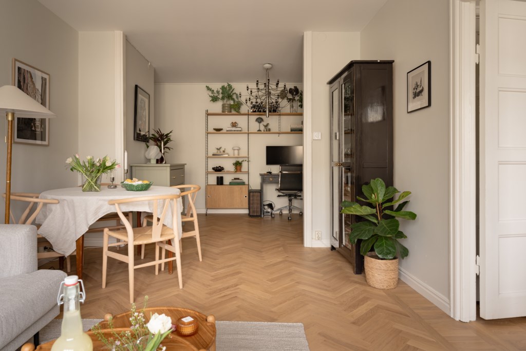 Ljust och luftigt vardagsrum med ljusa väggar och vacker fiskbensparkett. Väl tilltaget fönsterparti förser rummet med ett härligt ljus och här är enkelt att inreda med önskvärd möblering så som soffa, TV-bord och matgrupp samt perfekt yta för hemmakontor.