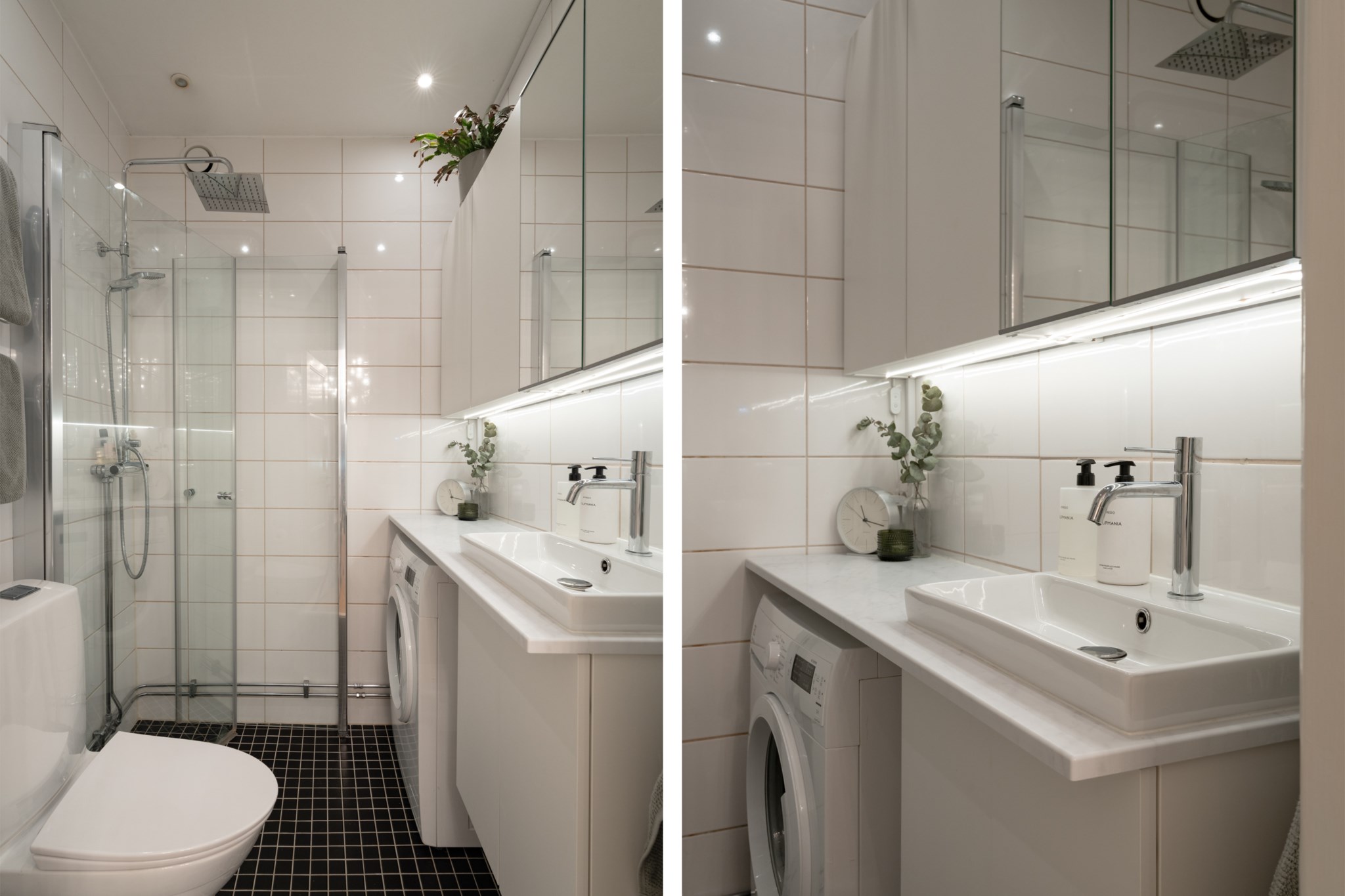 Helkaklat badrum med ljust kakel och mörk klinker. Här finns duschhörna bakom vikbara glasväggar, wc, handfat ovan kommod samt spegelskåp. Spotlights i tak och tvättmaskin.