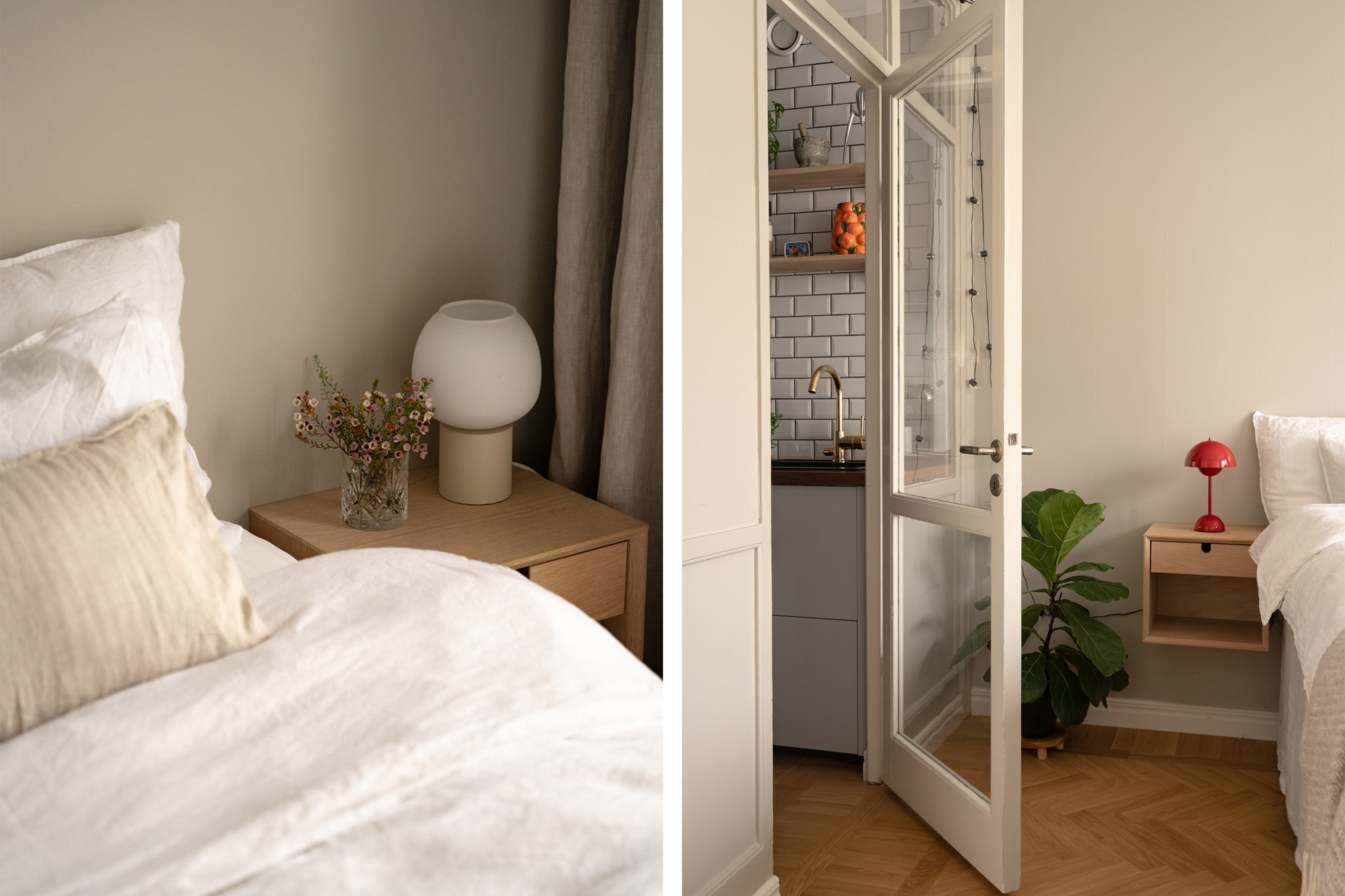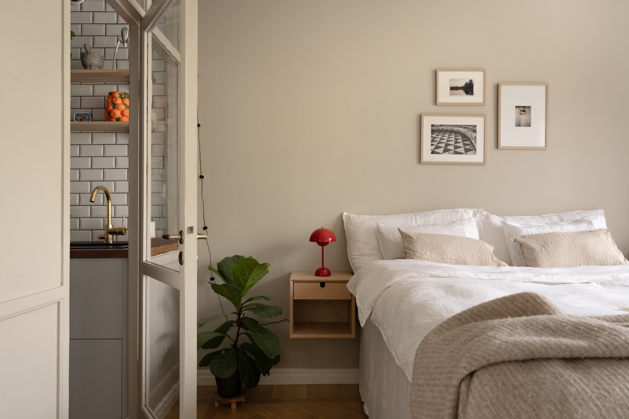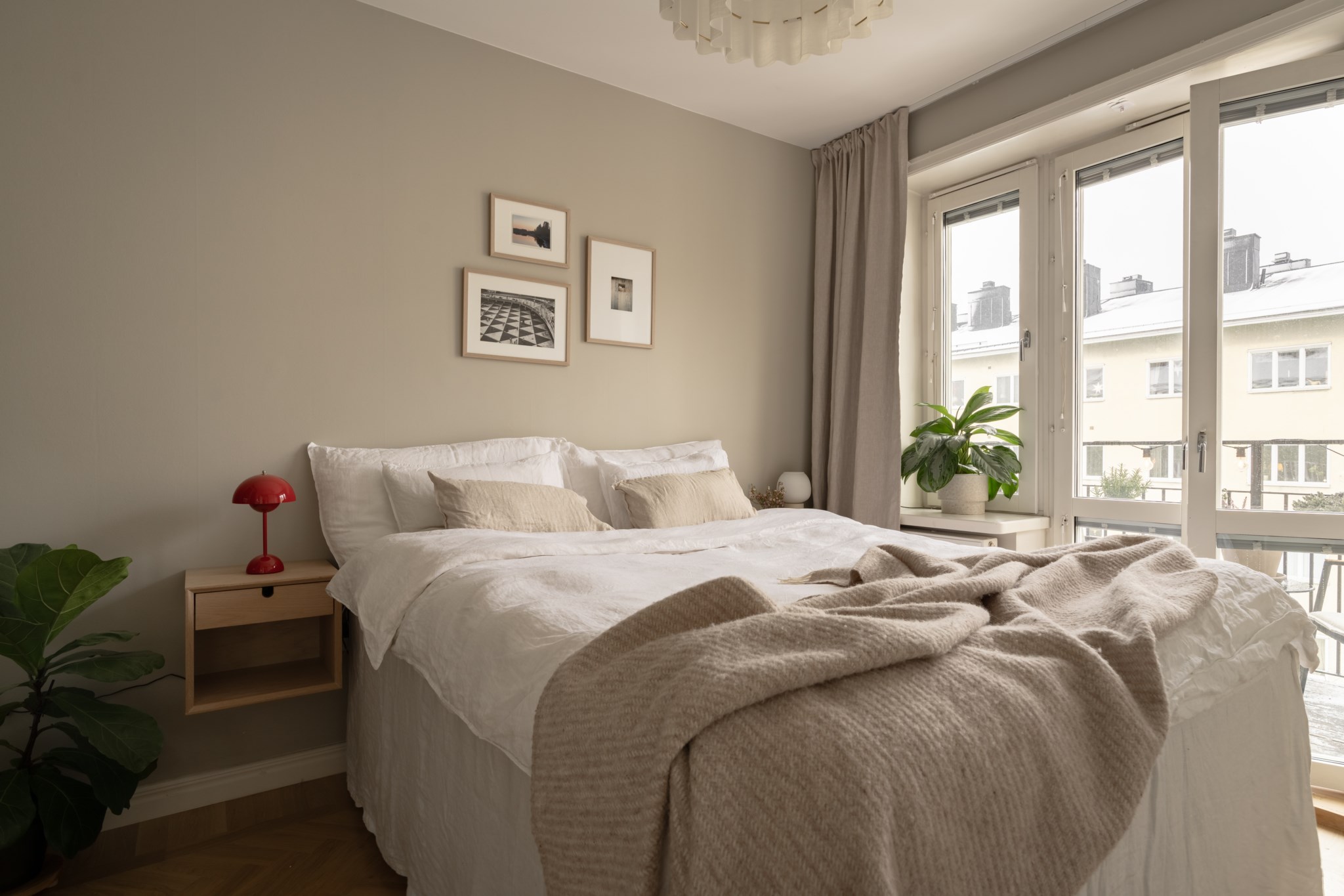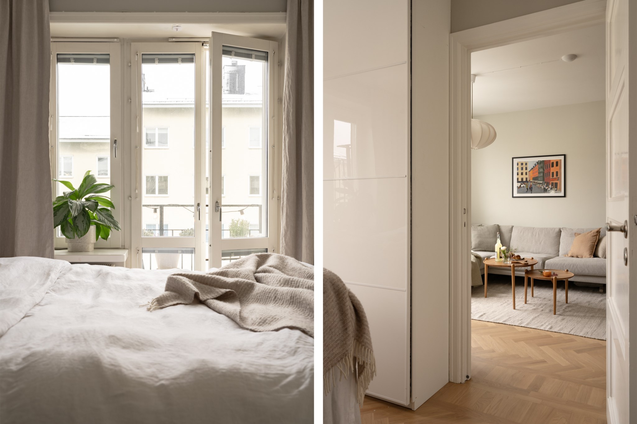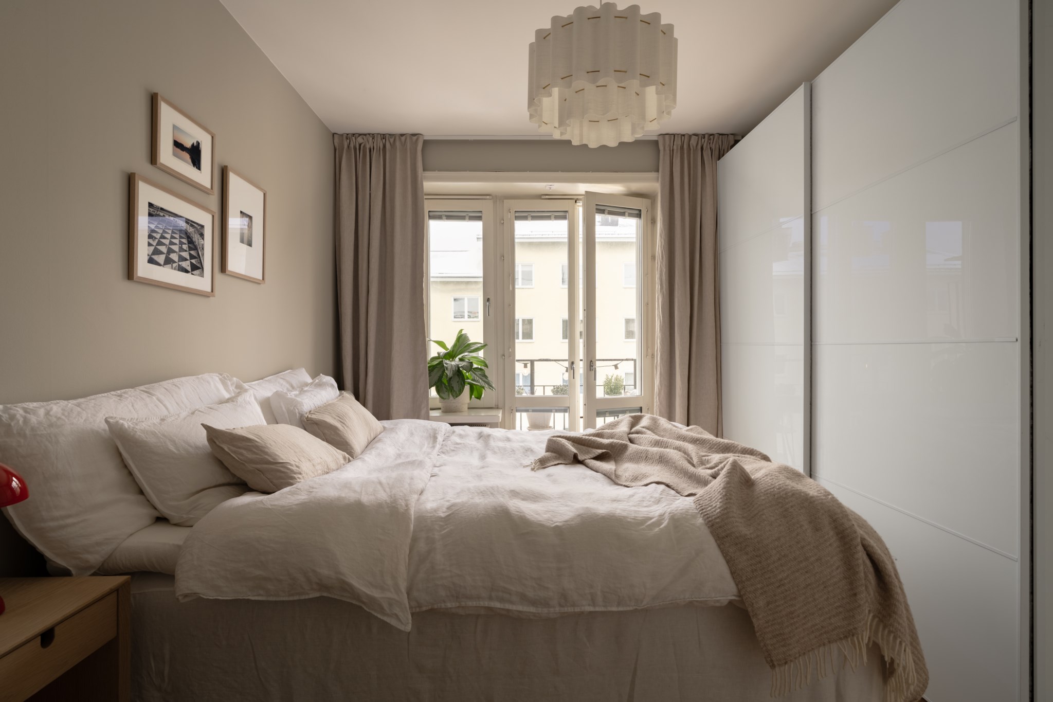 Harmoniskt sovrum med anslutning till bostadens ljuvliga balkong. Självklar plats för säng, nattduksbord och annan inredning om så önskas. Från sovrummet nås en inbyggd garderob plus en stor garderob med skjutdörr. Ljusa väggar och även här den vacker fiskbensparkett.