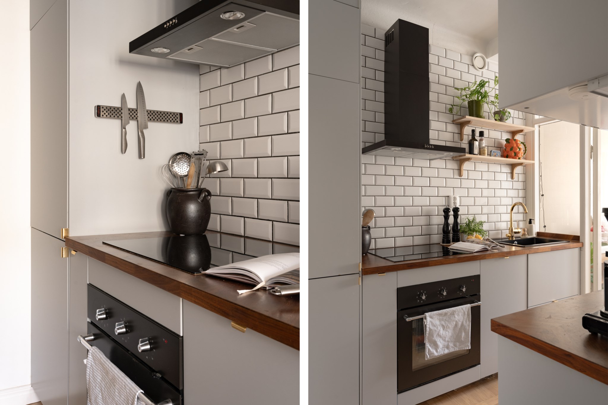 Trevligt kök med förvaring i över- och underskåp bakom ljusgråa fronter. Arbetsyta ovan mörk bänkskiva. Den maskinella utrustningen består av kyl/frys, spishäll, ugn, mikro samt diskmaskin. Ljusa väggar och trägolv.