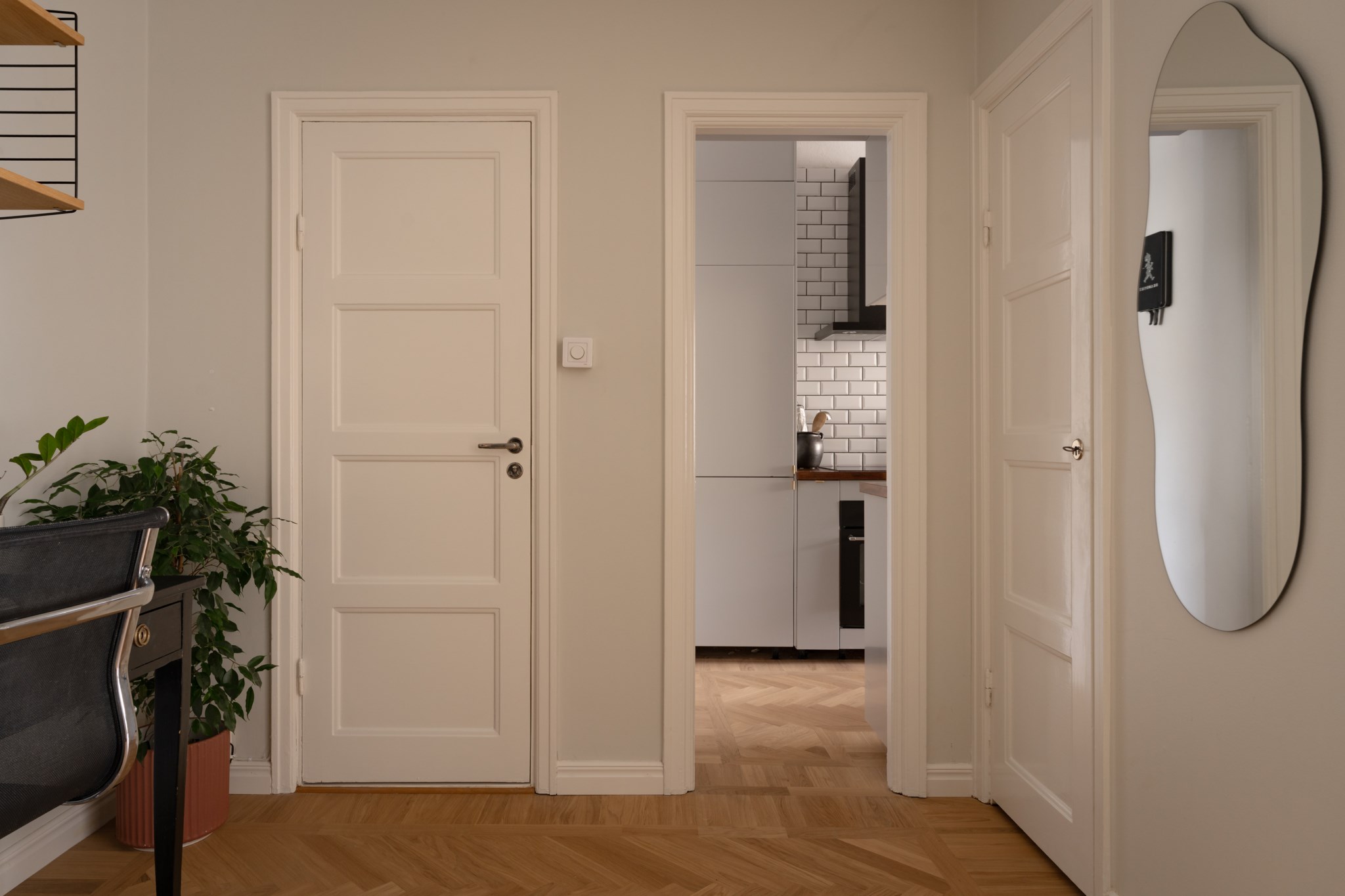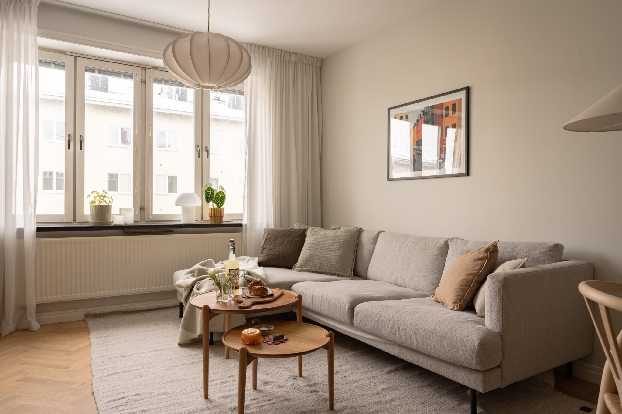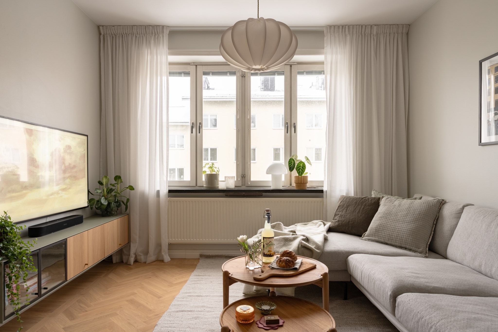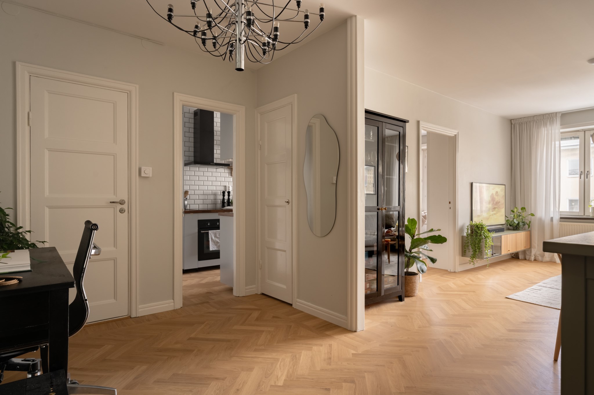 Här kan du flytta in precis som det är, otroligt fina materialval och med vacker fiskbensparkett genomgående i hela lägenheten. Ett stort och pampigt vardagsrum som rymmer både soffgrupp, matplats och kontorsplats. De stora fönstren ger ett vackert ljusinsläpp och skapar en känsla av rymd. Trevligt kök med bra arbetsyta och bra förvaring. Sovrum med plats för dubbelsäng, en garderob med skjutdörr och en platsbyggd gör att det finnns gott om förvaring. Här når du den trevliga balkongen i västläge med otrolig utsikt på våning 4!