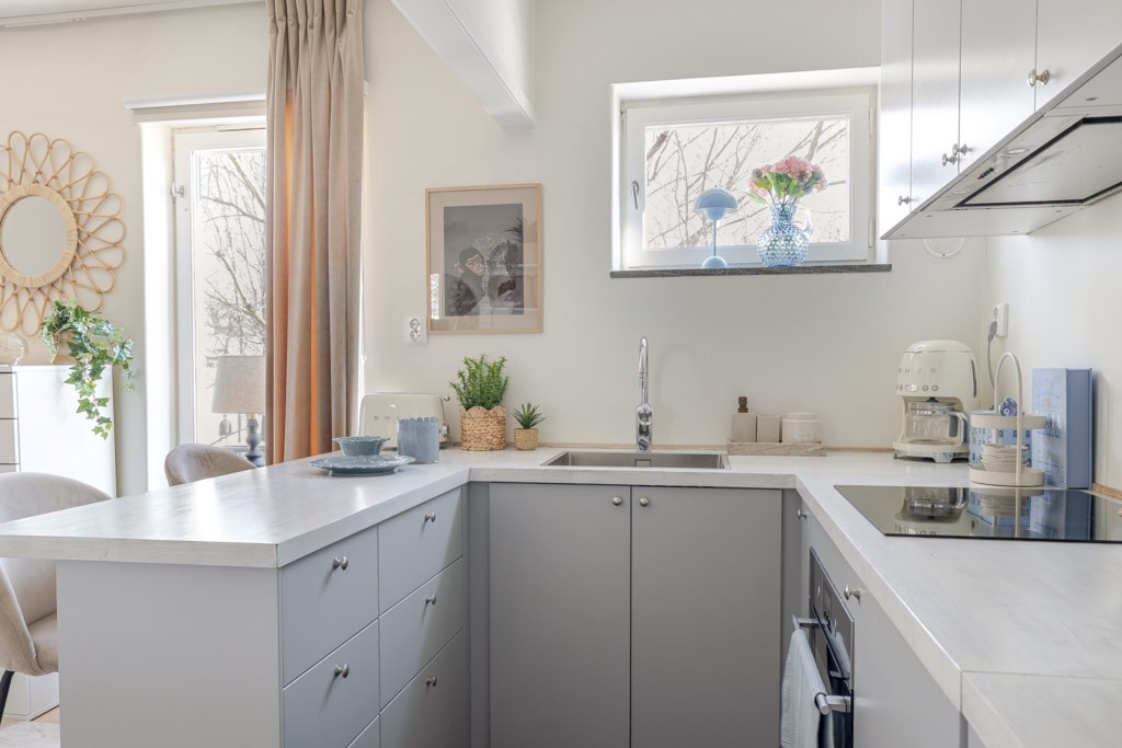 Stilrent och luftigt kök i öppen planlösning mot vardagsrummet vilket skapar en social och trivsam yta. Släta, grå köksluckor kombineras med en ljus bänkskiva som ger ett enhetligt uttryck. Maskinell utrustning i form av kyl/frys, spishäll, fläkt, ugn och diskmaskin. Ljusmålade ytskikt och ljust golv.