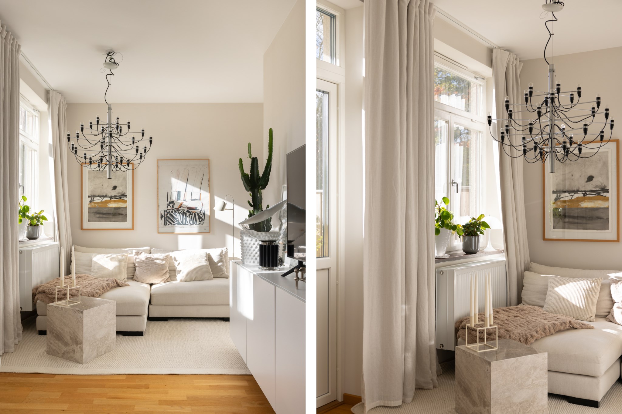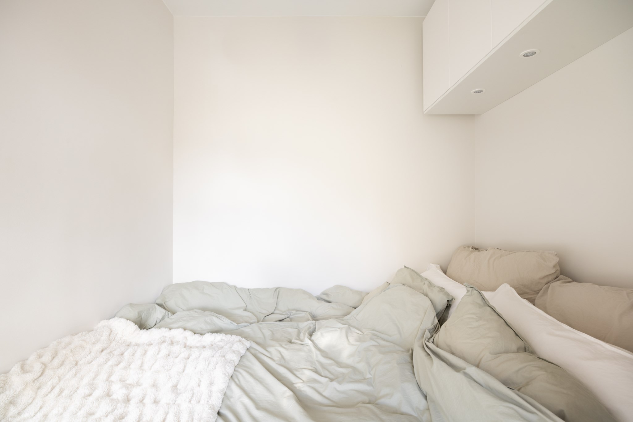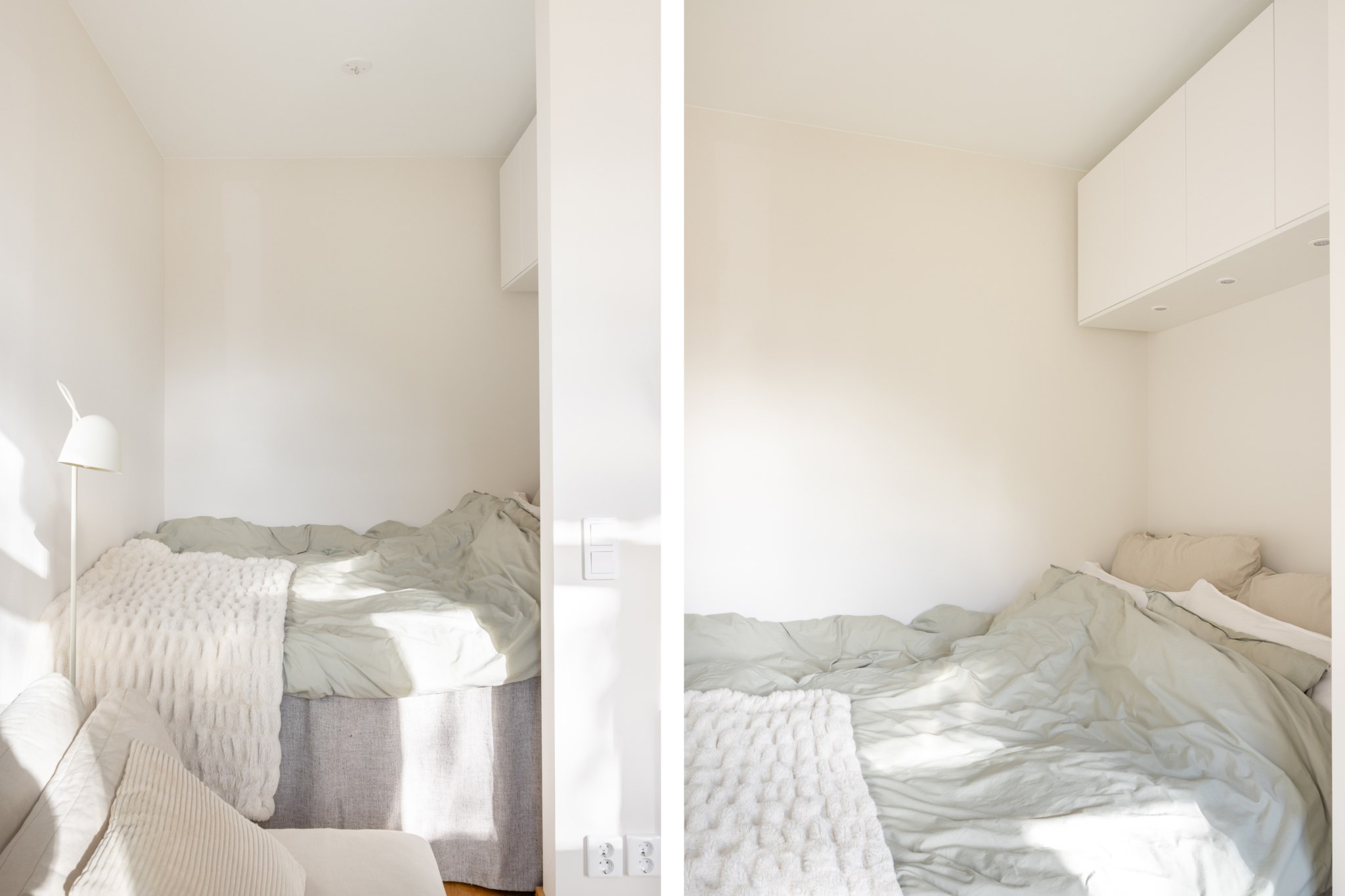I anslutning till vardagsrummet finns en sovalkov. Ytskikten består av ljusa väggar och ljust golv. Här finns perfekt plats för säng.