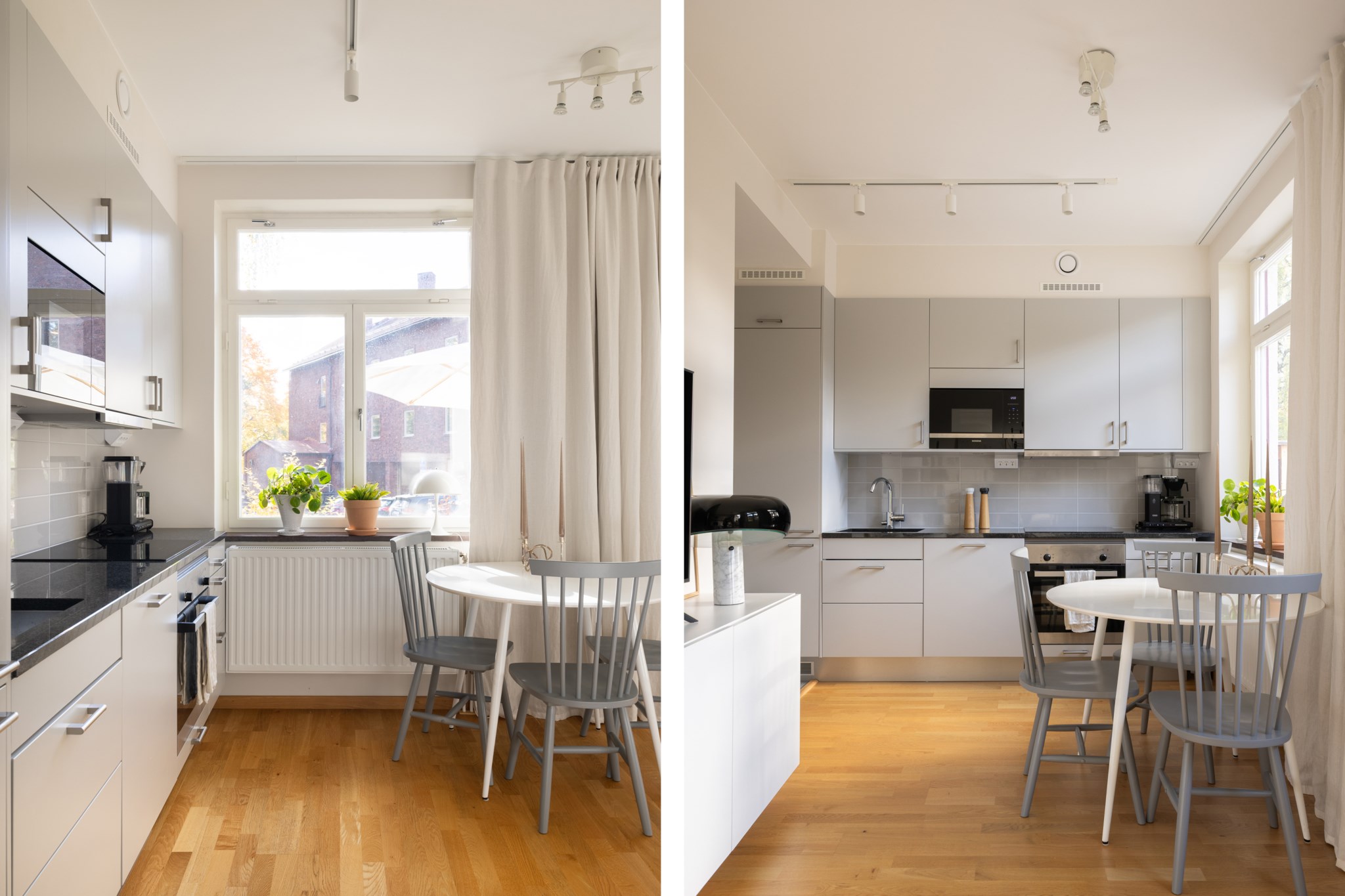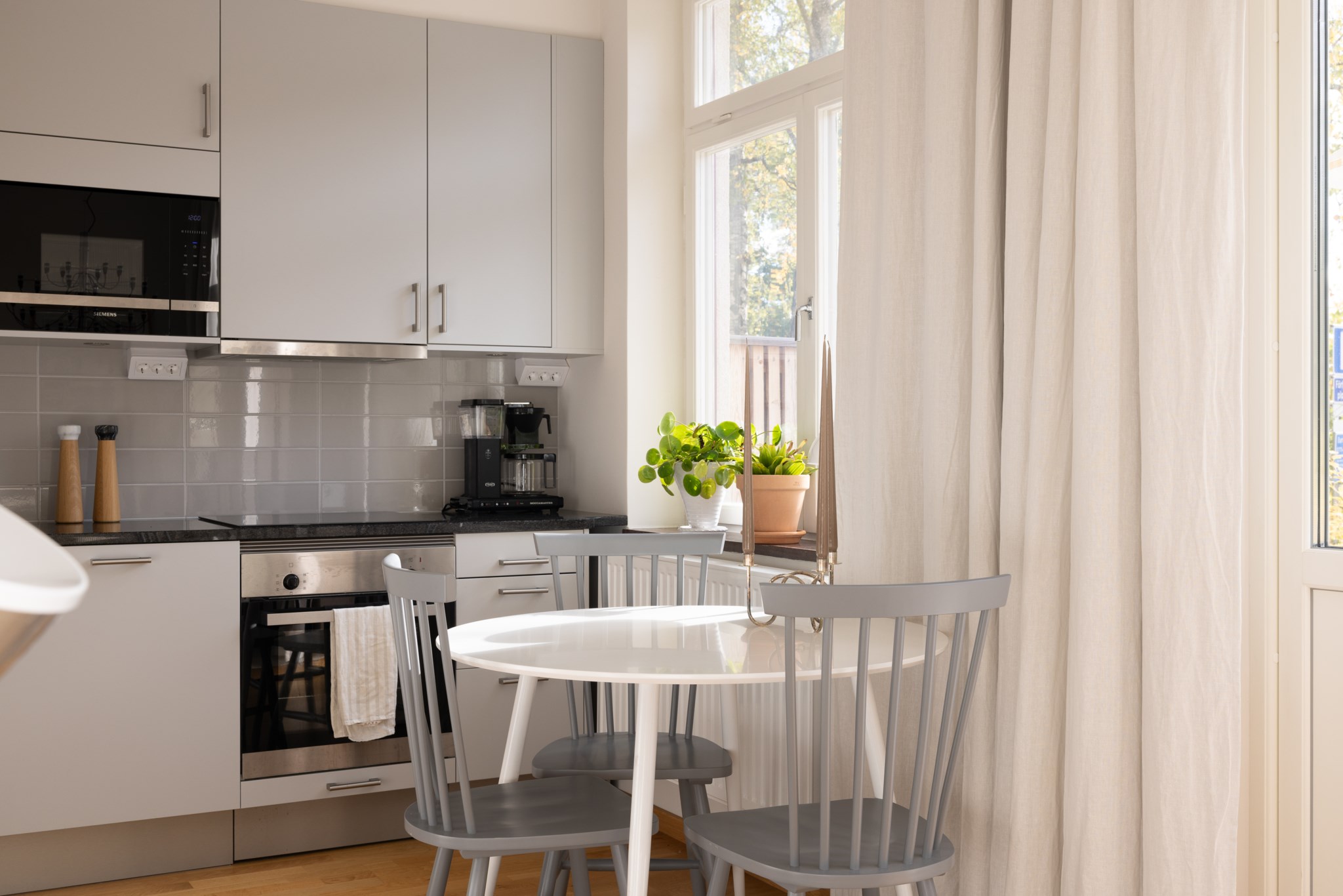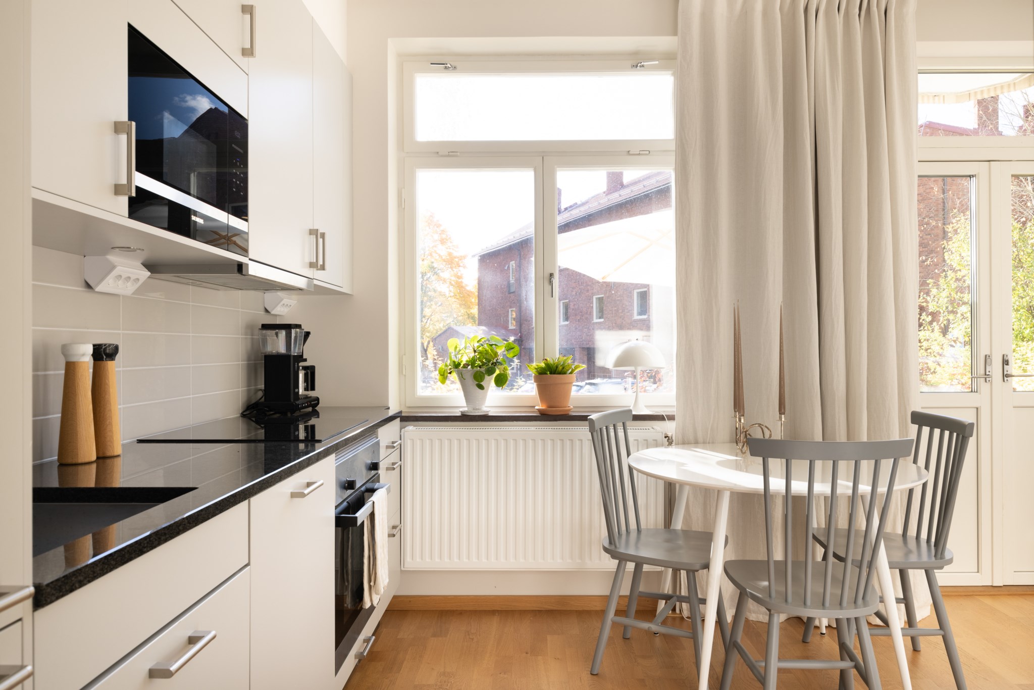 Trevligt kök i öppen och social planlösning med vardagsrum. Tidlösa materialval bestående av köksluckor i ljusgrå nyans, samt mörk bänkskiva i granit. Köket är utrustat med diskho, spis, köksfläkt, ugn (Siemens), inbyggd mikro (Siemens), diskmaskin (Siemens) samt integrerad kyl och frys. Ett härligt ljusinsläpp tar sig in via stort fönster mot uteplatsen.