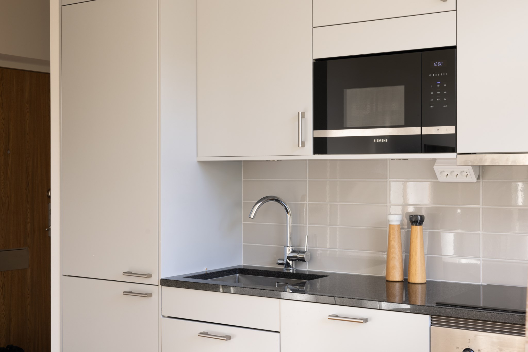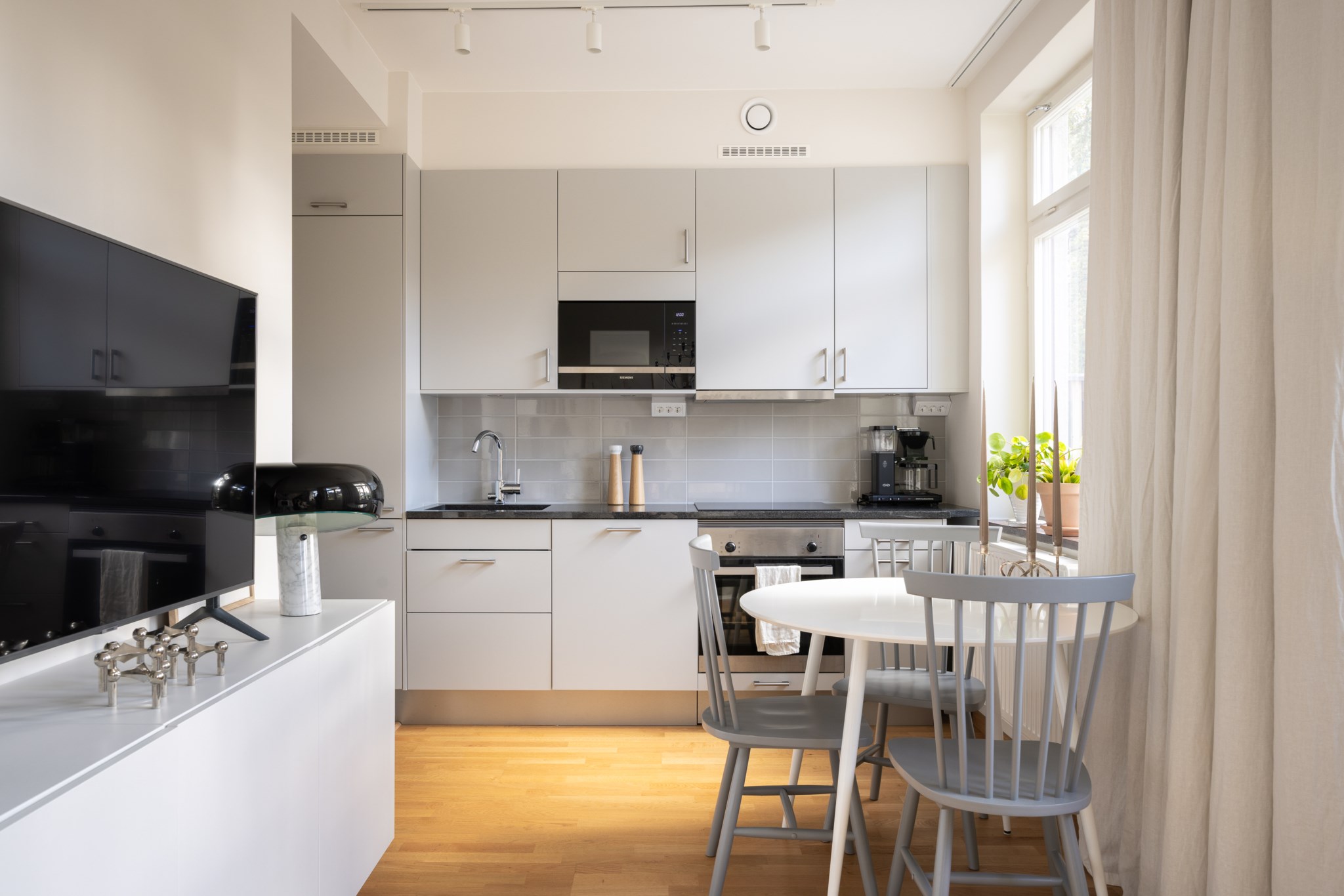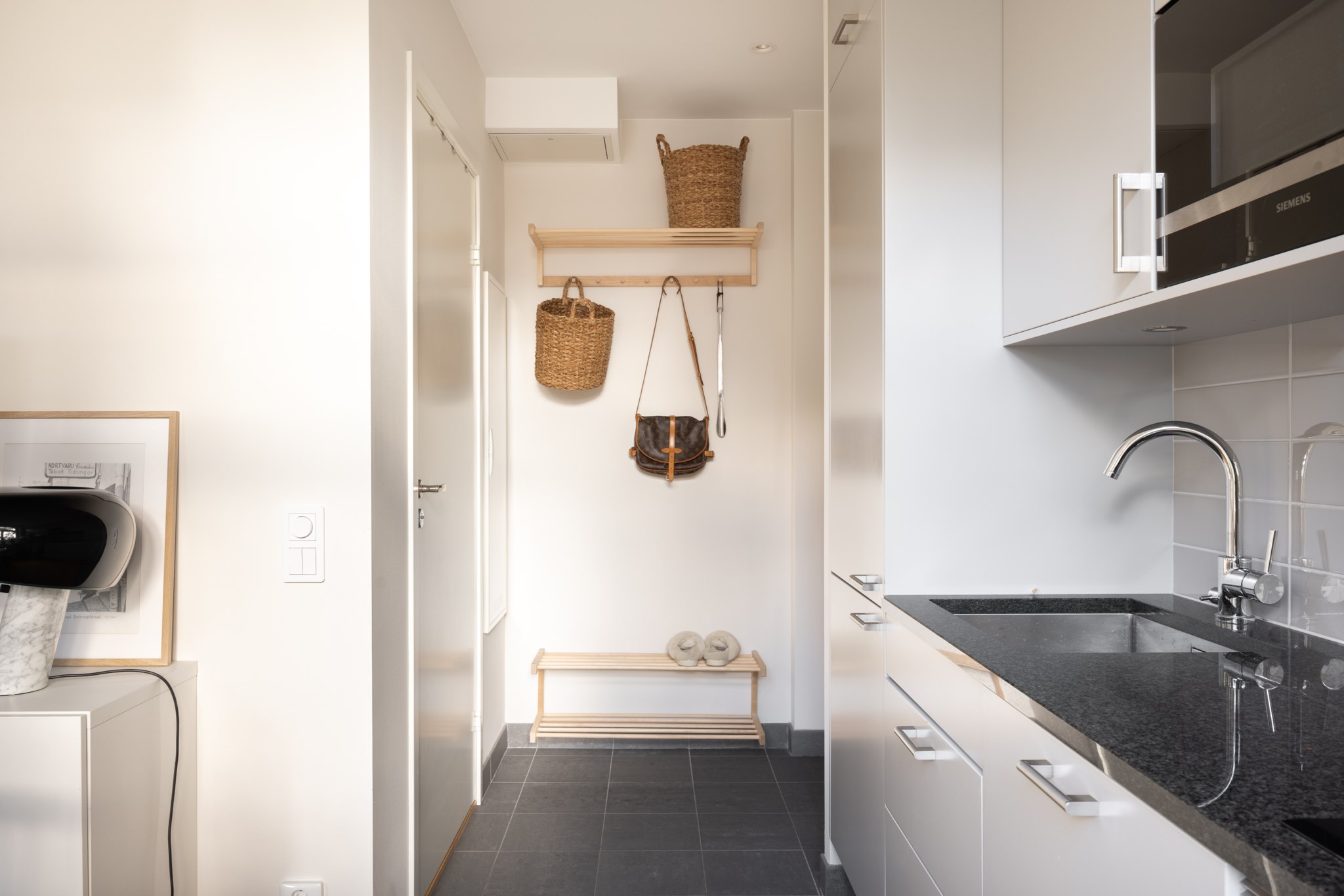 Trevligt kök i öppen och social planlösning med vardagsrum. Tidlösa materialval bestående av köksluckor i ljusgrå nyans, samt mörk bänkskiva i granit. Köket är utrustat med diskho, spis, köksfläkt, ugn (Siemens), inbyggd mikro (Siemens), diskmaskin (Siemens) samt integrerad kyl och frys. Ett härligt ljusinsläpp tar sig in via stort fönster mot uteplatsen.