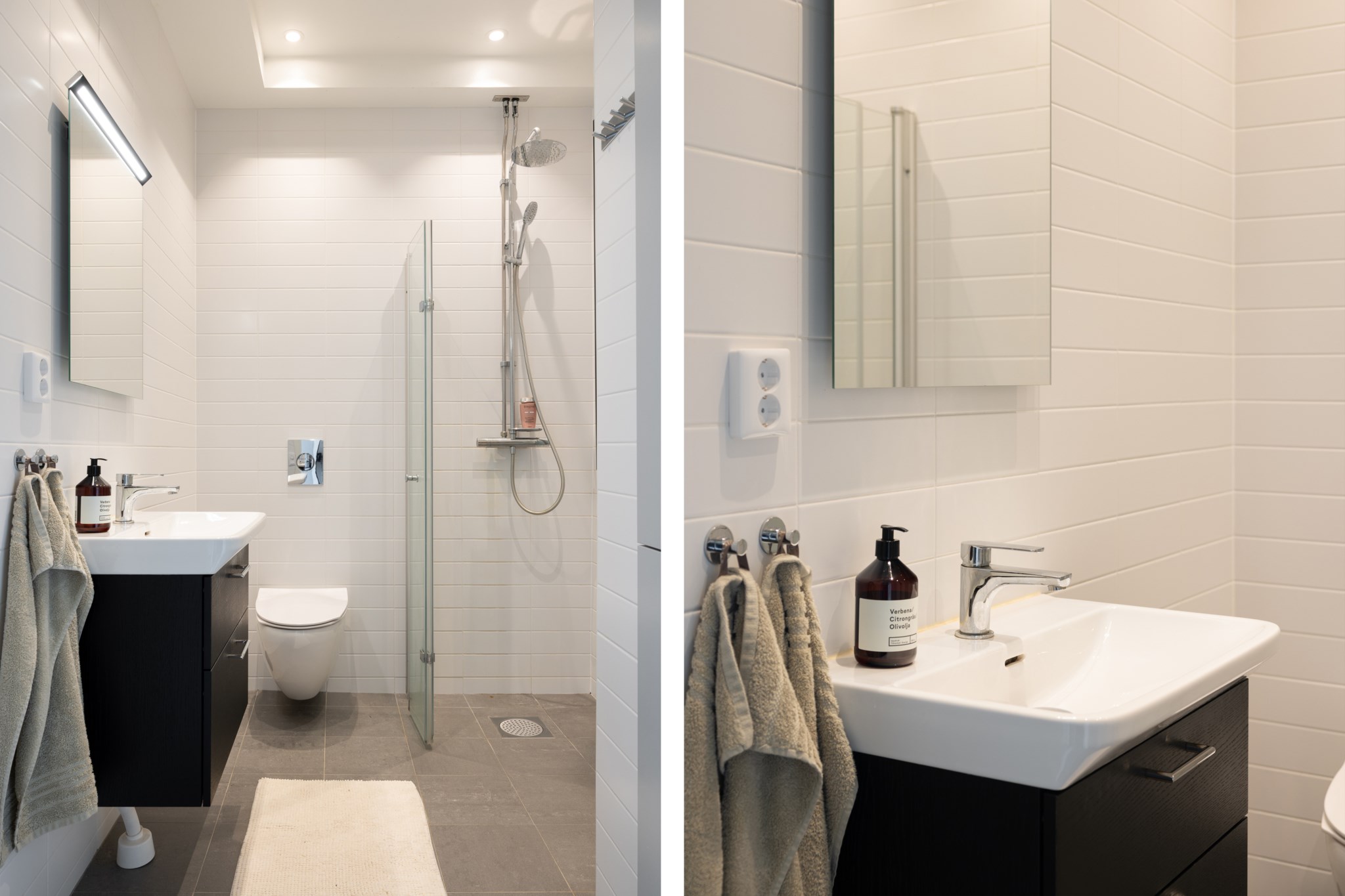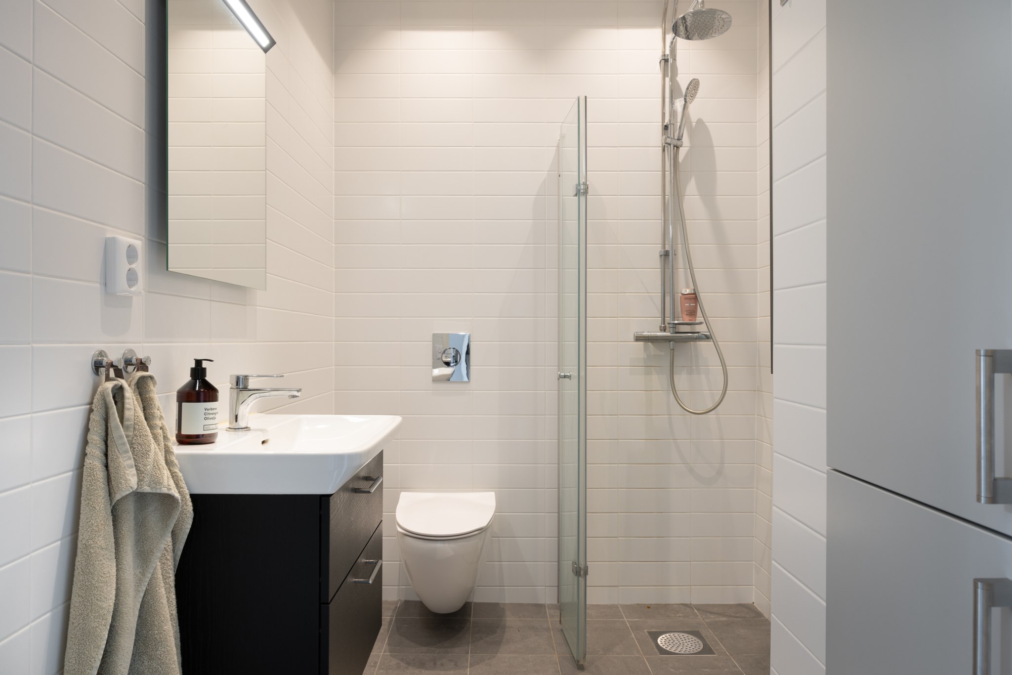 Rymligt badrum med tidlösa materialval bestående av vitt kakel och klinker i grå nyans. Badrummet är utrustat med golvvärme, vägghängd WC, handfat med kommod, takdusch med glasvägg. Perfekt belysning via spotlights i tak samt gott om förvaringsmöjligheter via städskåp.