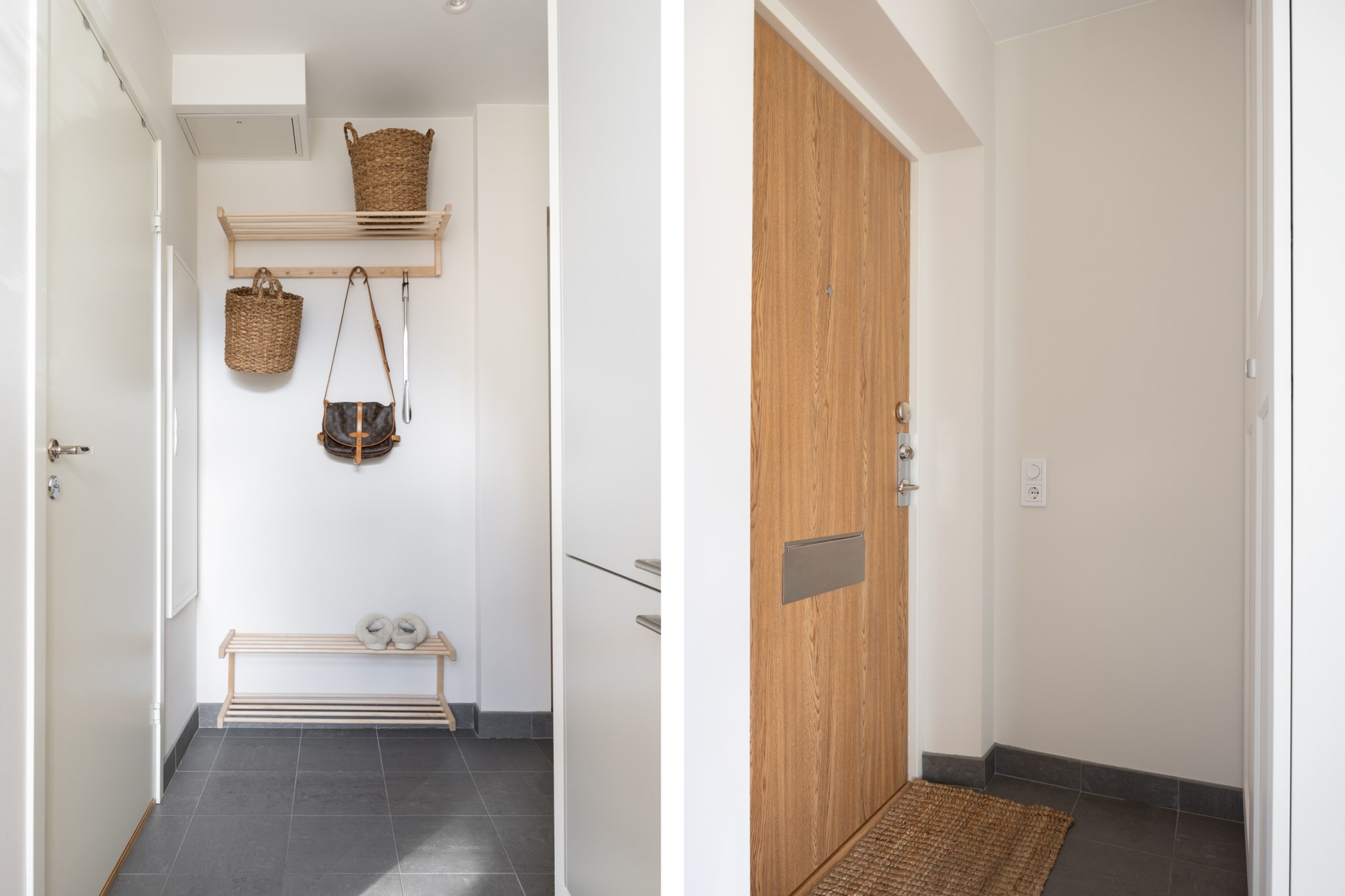 Välkomnande hall med gott om plats för avhängning och skoställ. Ytskikten består av ljusa väggar och mörkt, praktisk klinkergolv. Hallen erbjuder gott om förvaringsmöjligheter via garderob.