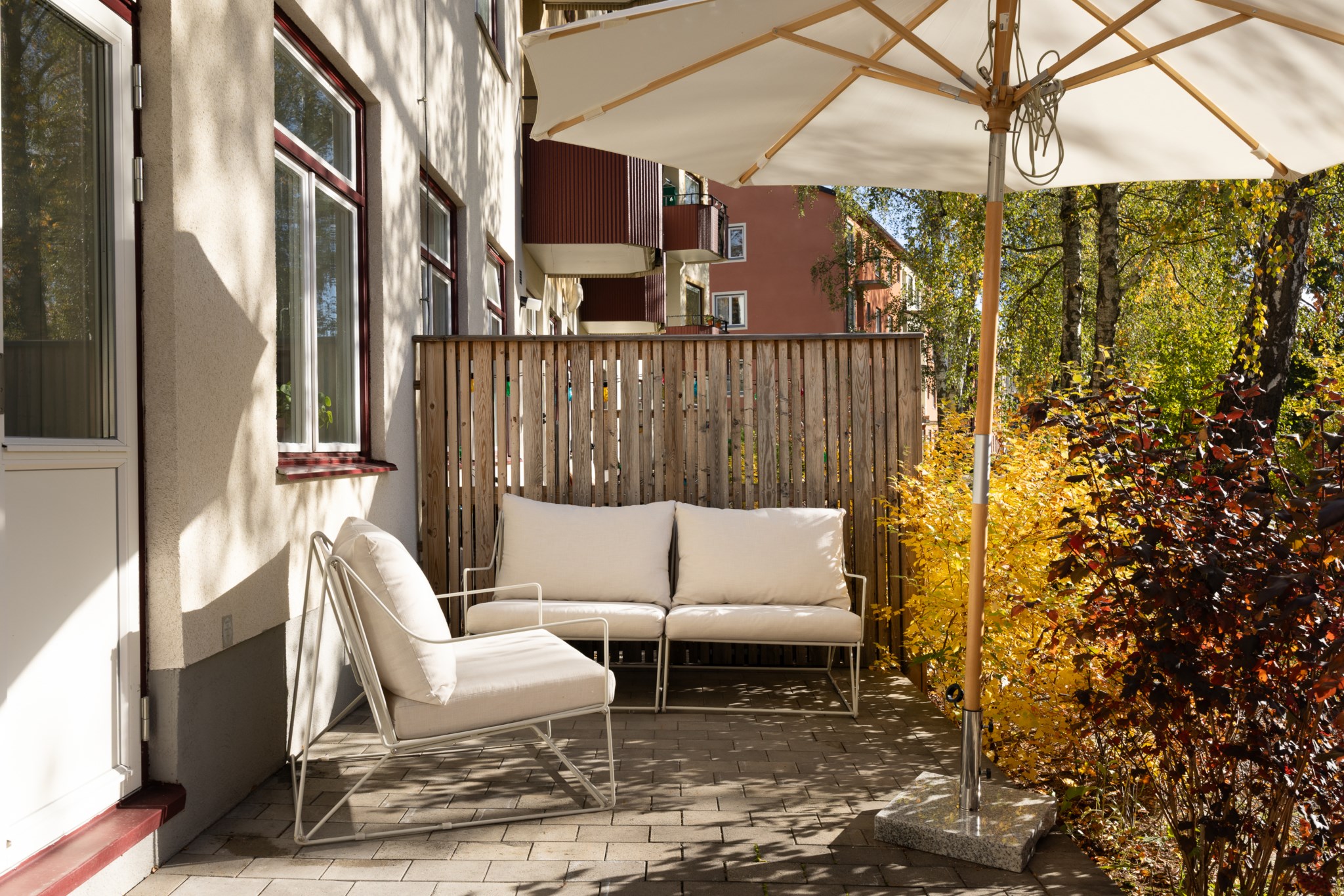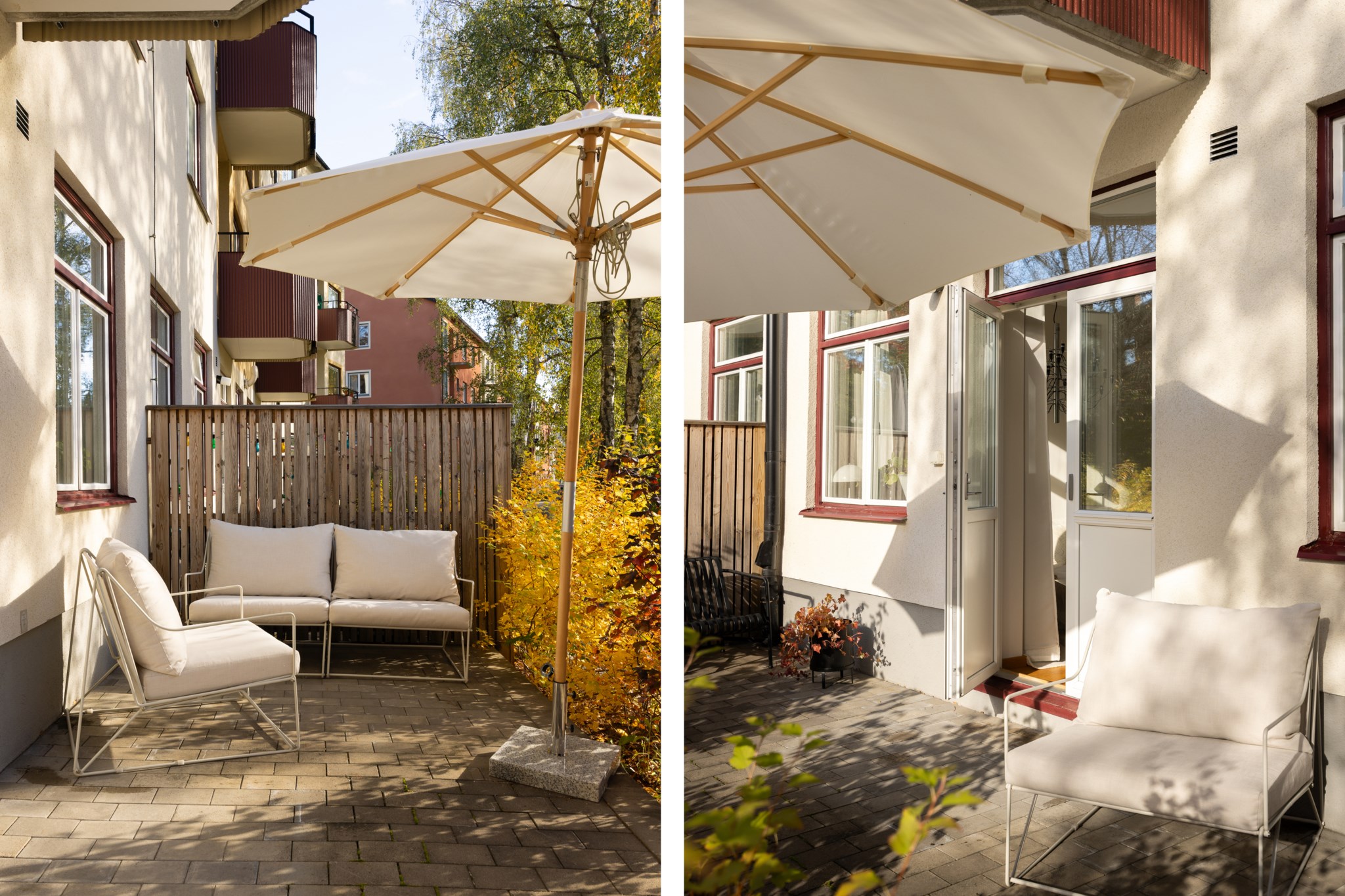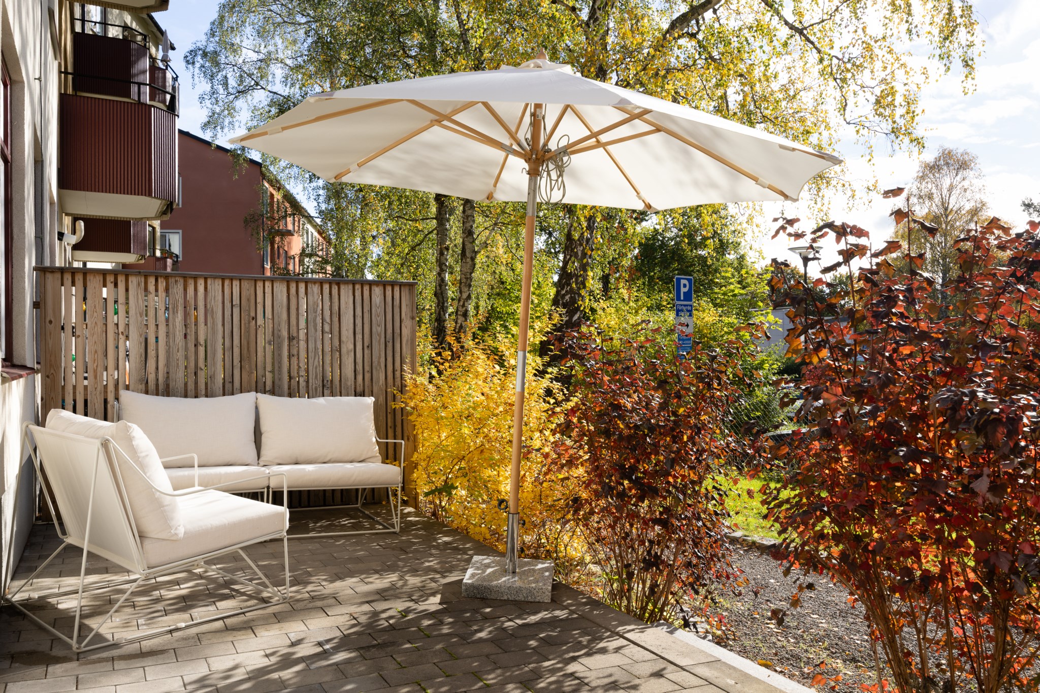 Från vardagsrummet nås den stora och mysiga uteplatsen om ca 16 kvm i söderläge och omgiven av grönska. Här finns plats för matbord, soffgrupp och annat efter önskemål.