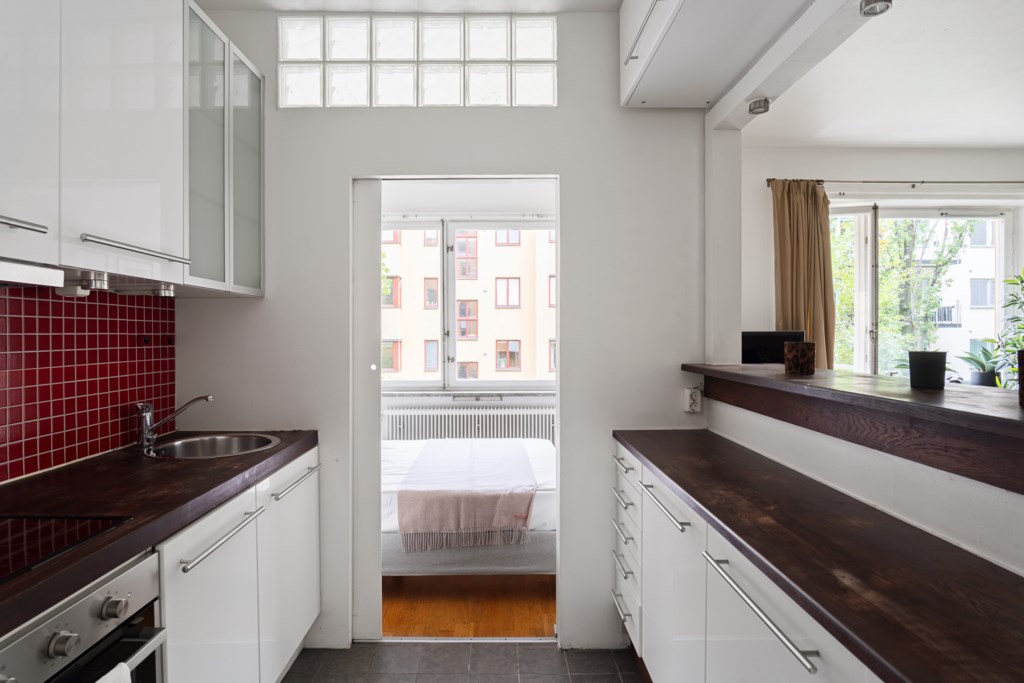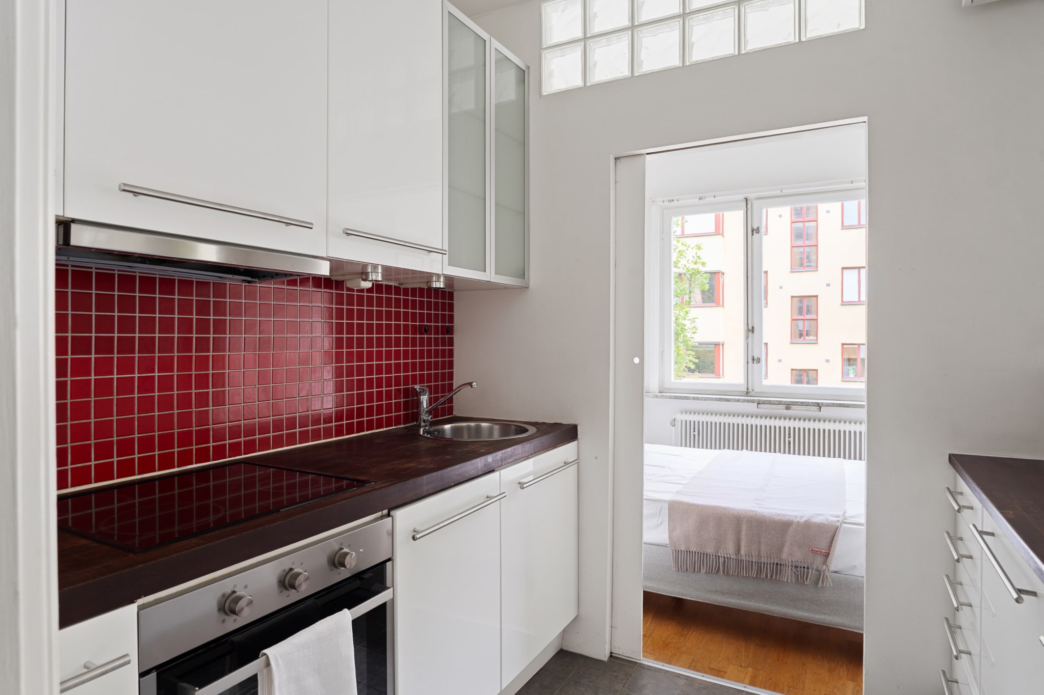Stilrent och modernt kök med vita köksluckor, mörk bänkskiva och rött kakel ovan. Den maskinella utrustningen består av spishäll, ugn, fläkt, integrerad diskmaskin samt kombinerad kyl och frys. En praktisk bardisk med sittplatser vetter mot vardagsrummet och skapar en social och öppen känsla.