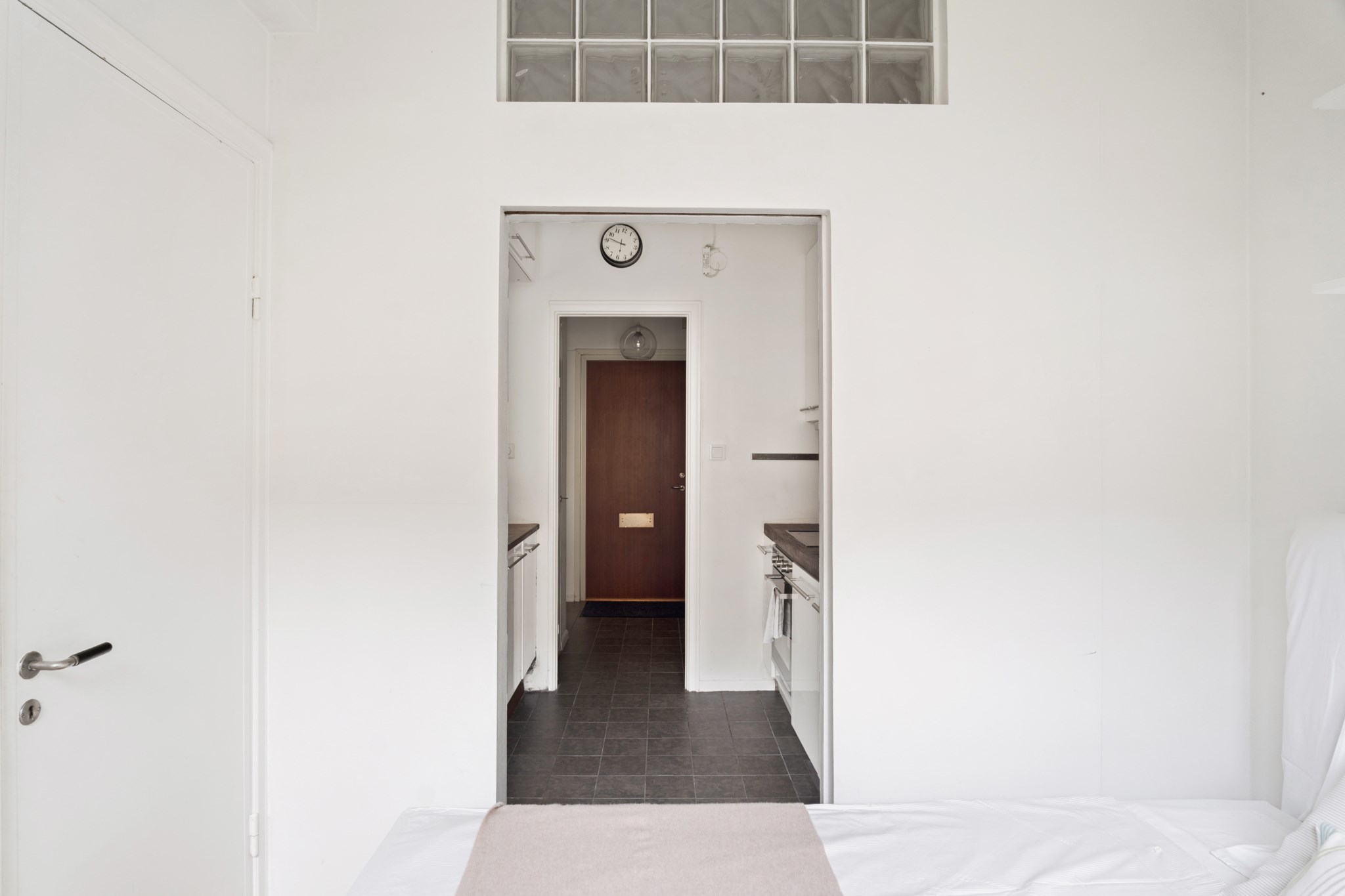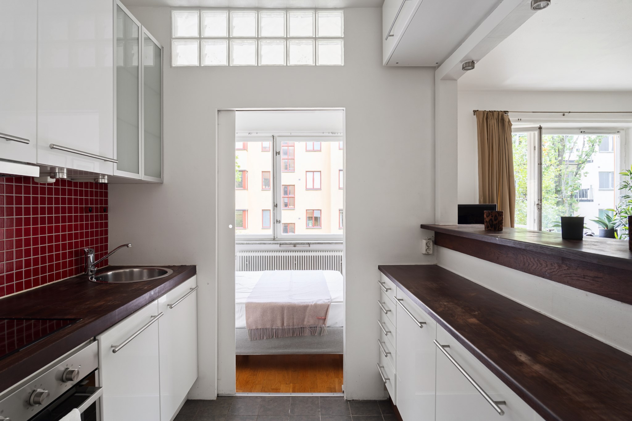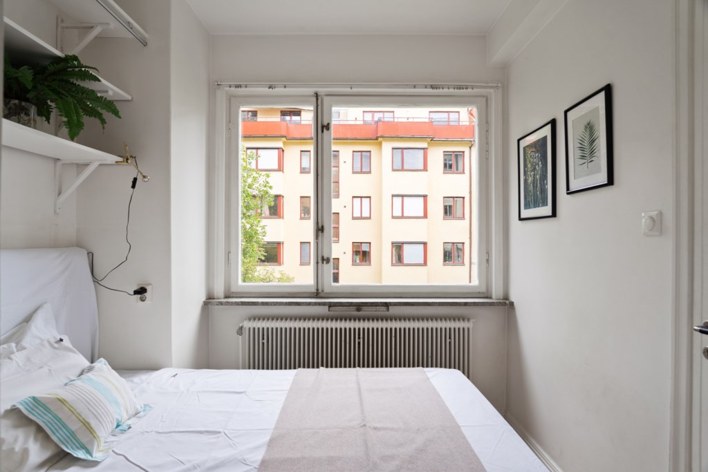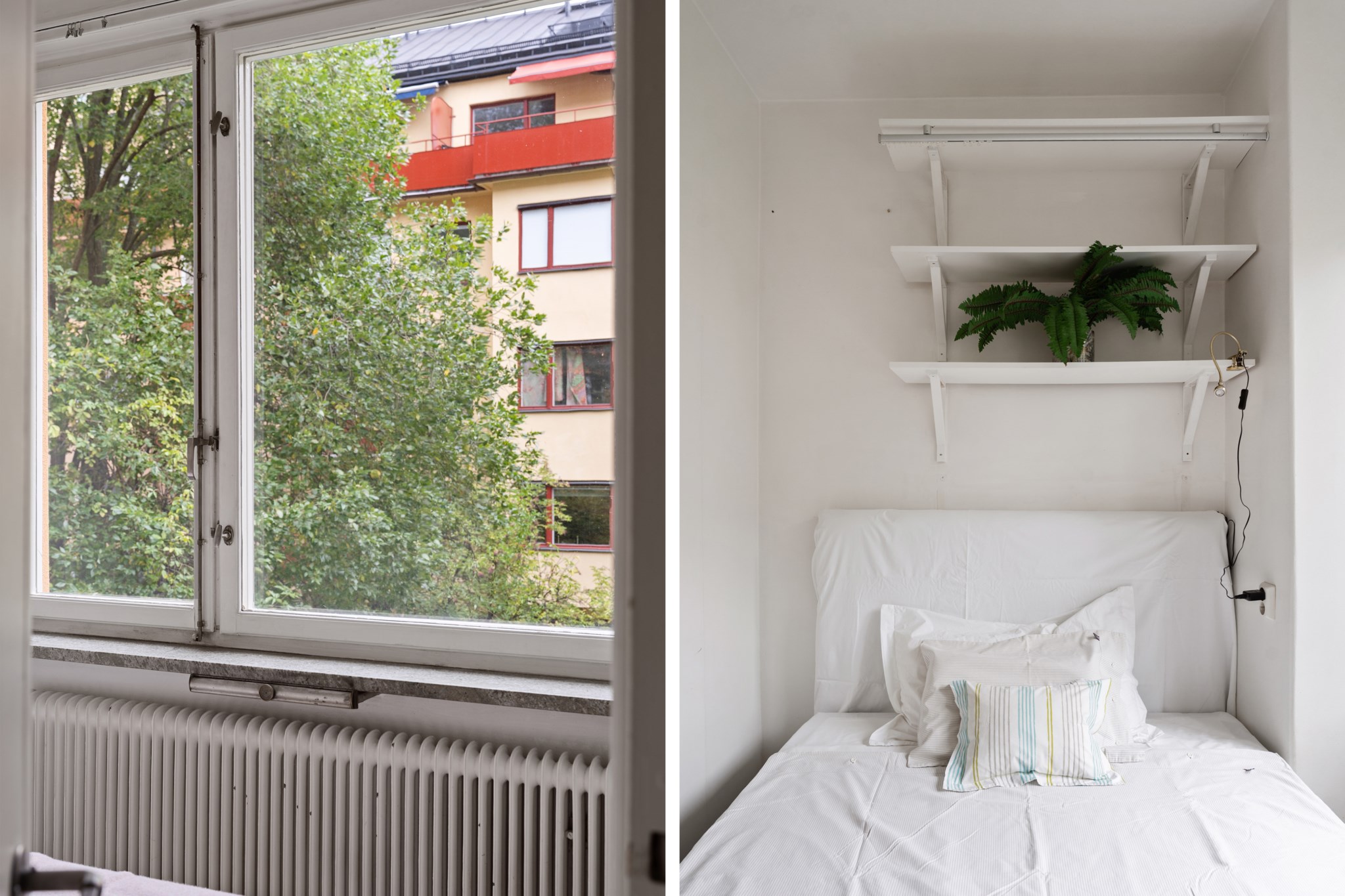 Det mysiga sovrummet har plats för mindre säng och tack vare läget mot gården sover du ostört. Badrummet är fräscht och helkaklat, utrustat med dusch och egen tvättmaskin.
