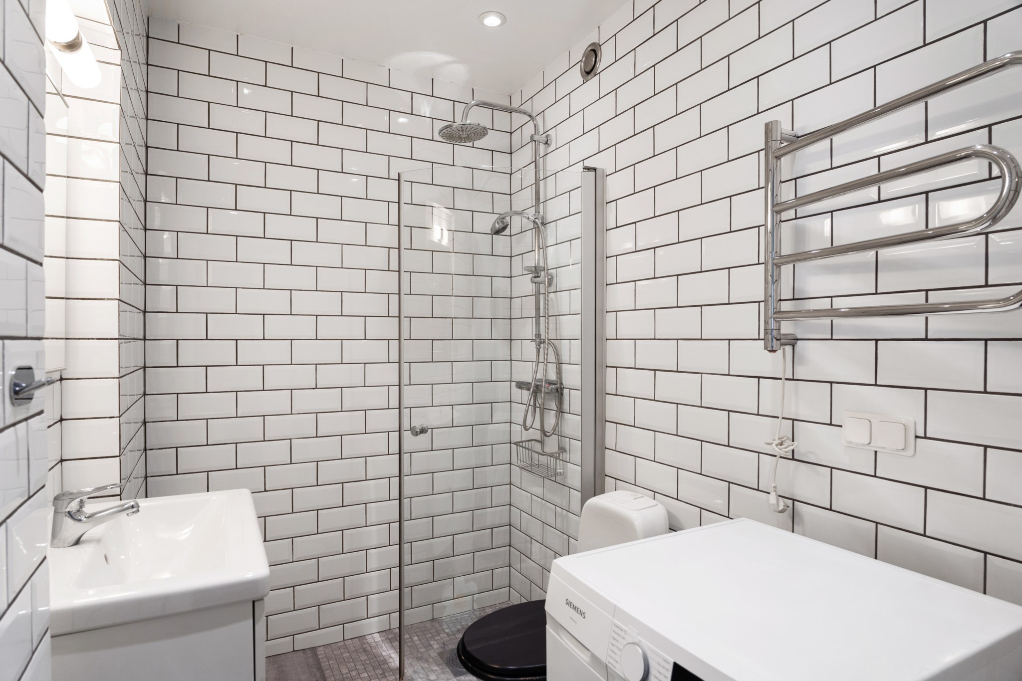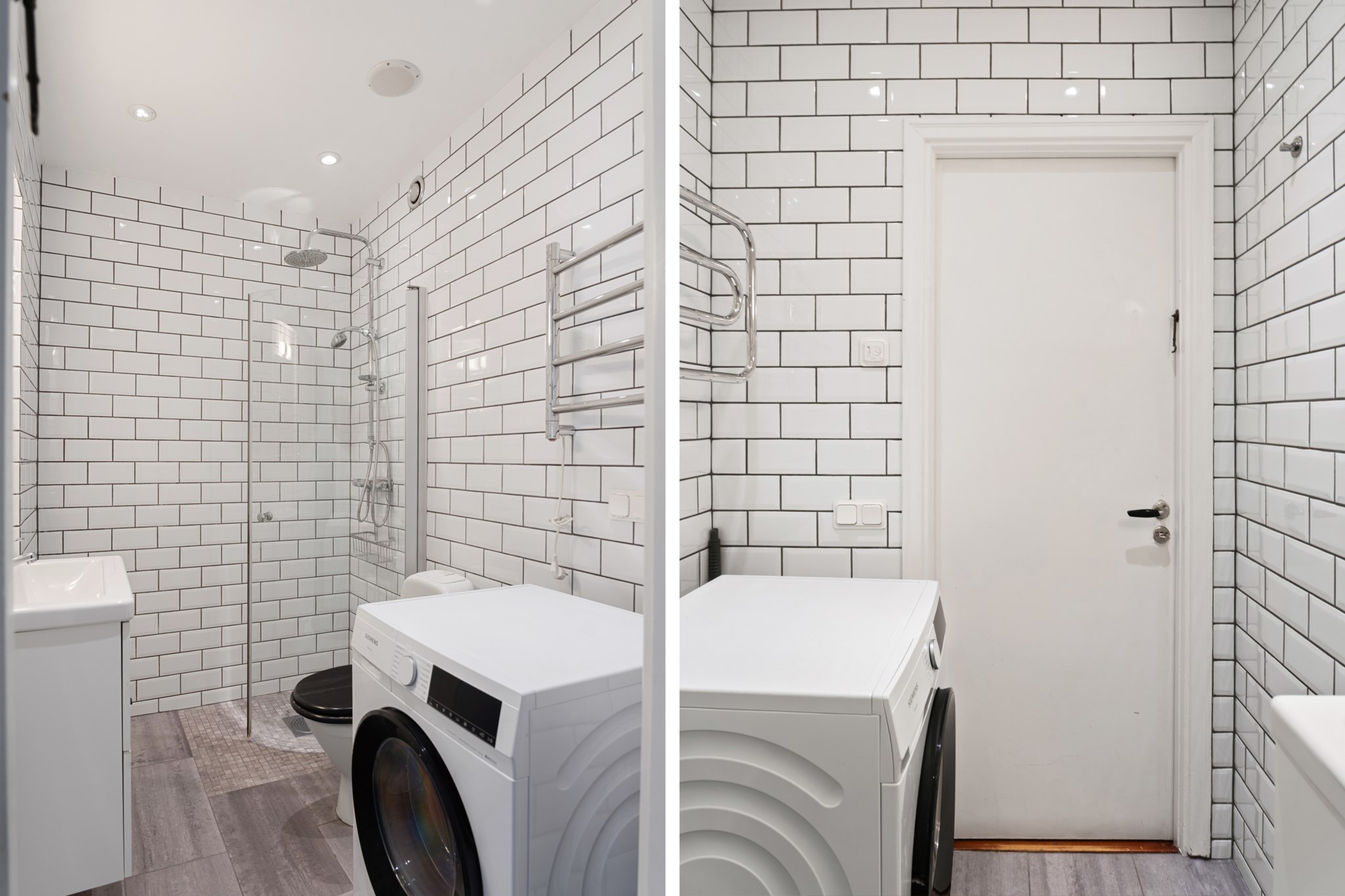 Fräscht badrum med vita helkaklade väggar och ljust klinkergolv. Utrustat med WC-stol, handfat med vit kommod, spegel samt takdusch med glasvägg. Förhöjd komfort erbjuds genom både golvvärme, handdukstork och tvättmaskin.