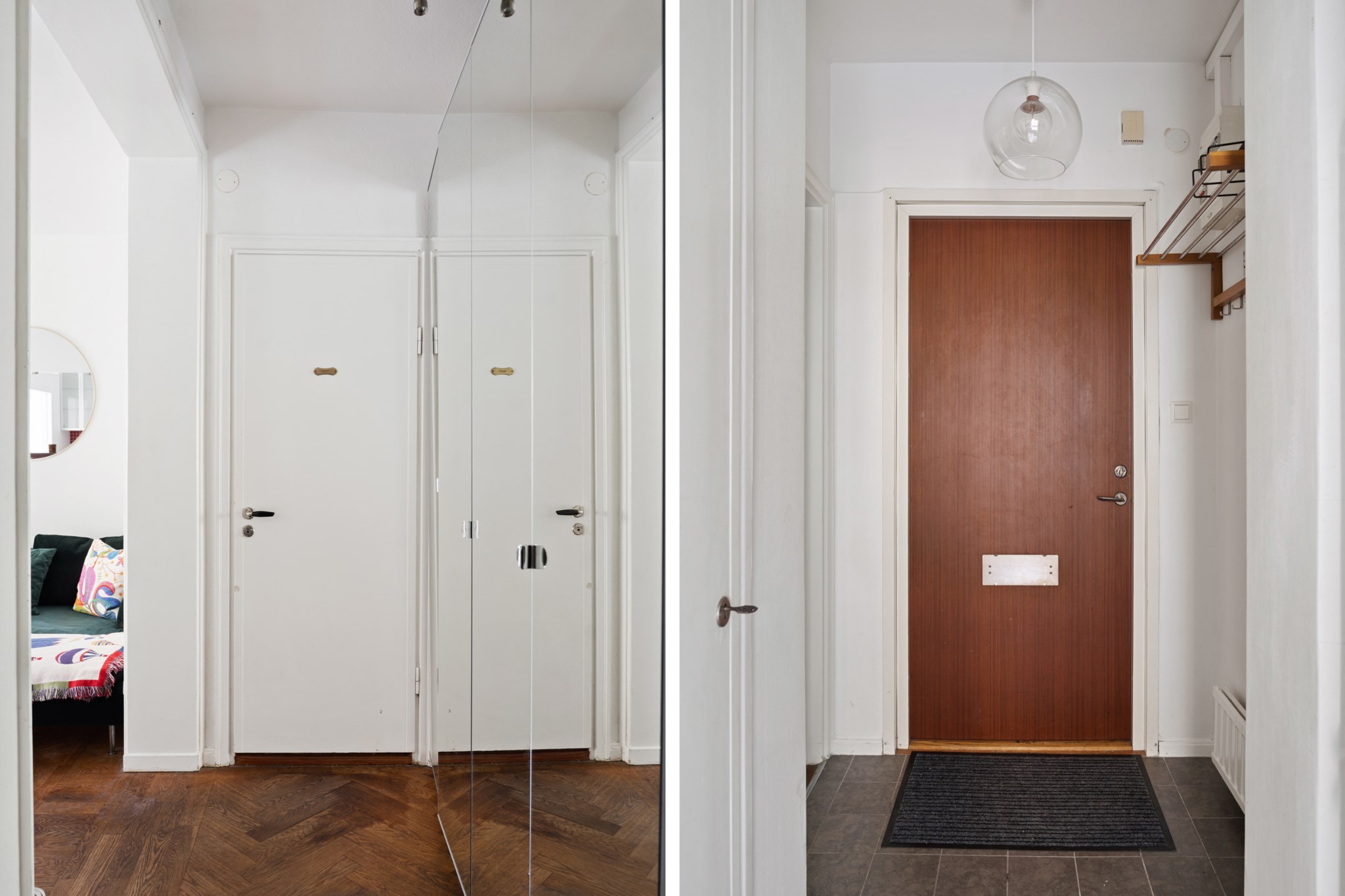 Ljus och välkomnande hall med ljus kulör på väggarna och mörka klinkergolvet som övergår till fiskbensparkett. Praktisk förvaring erbjuds i form av garderober längst väggen samt avhängningsmöjligheter via hatthylla.