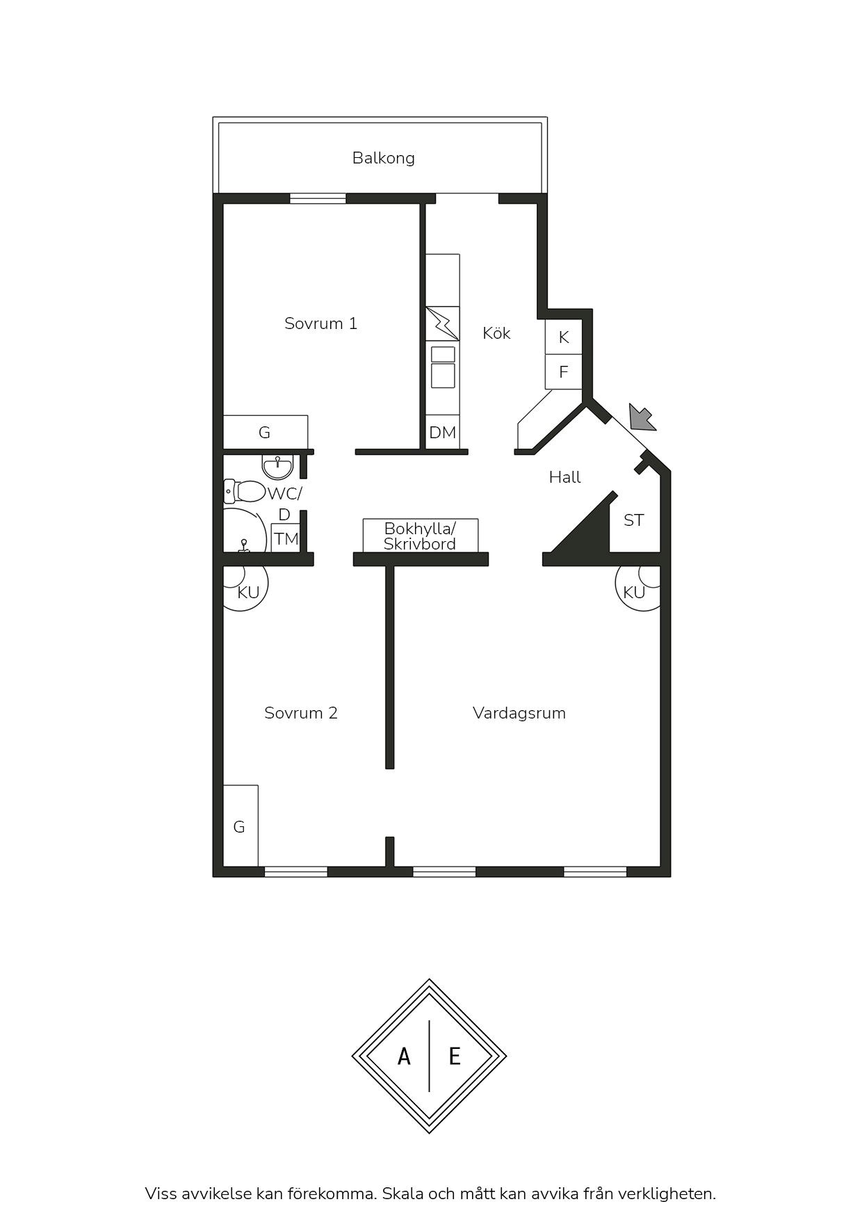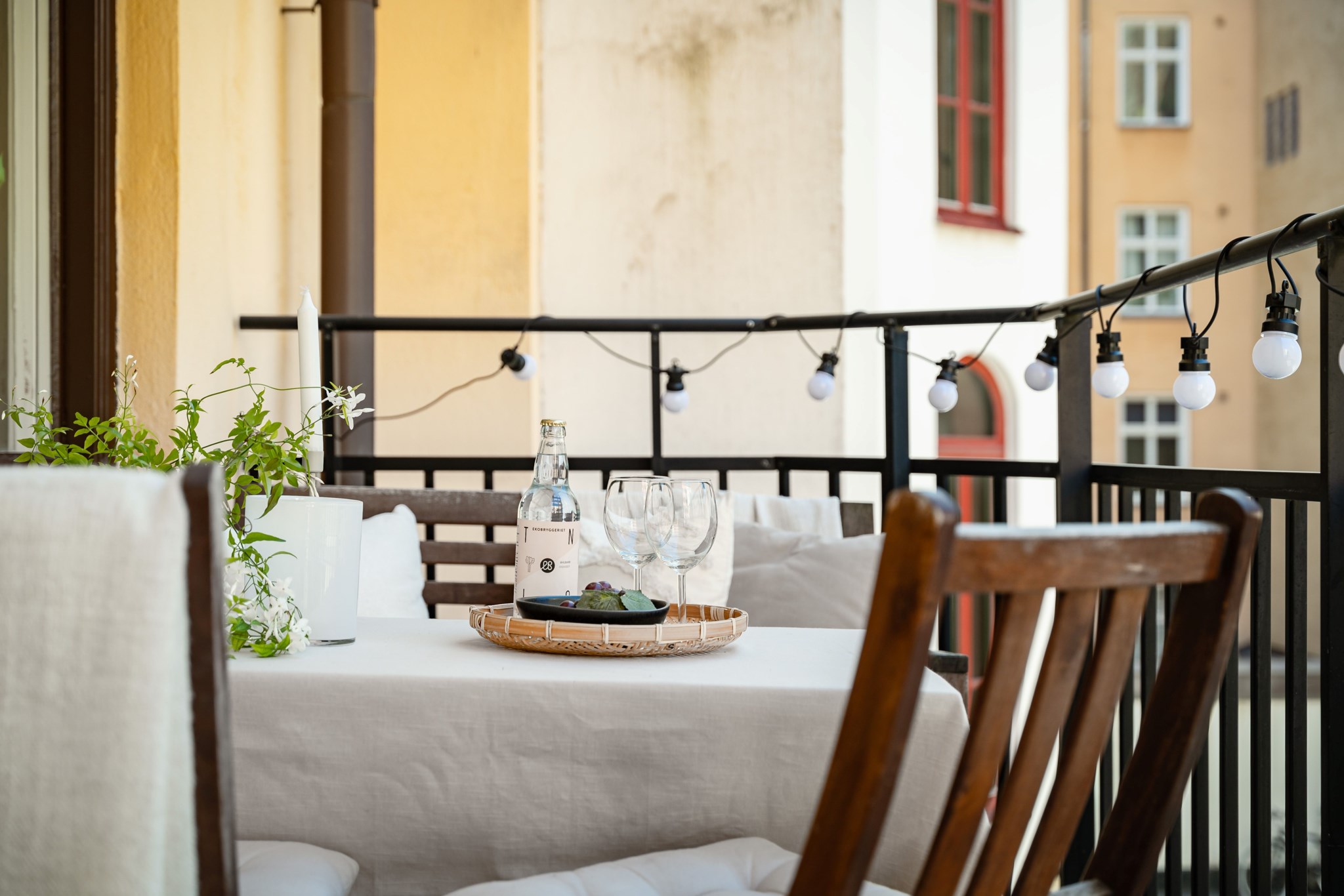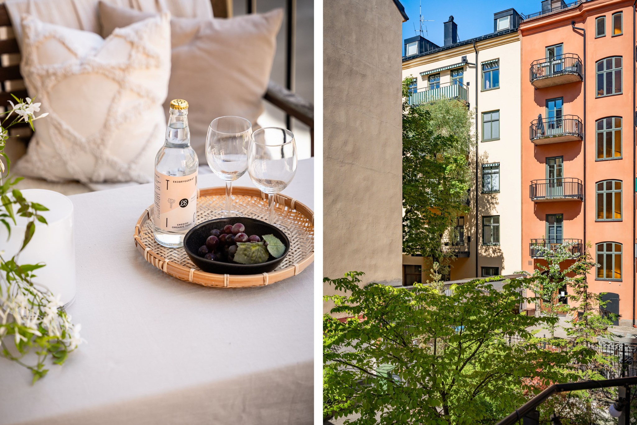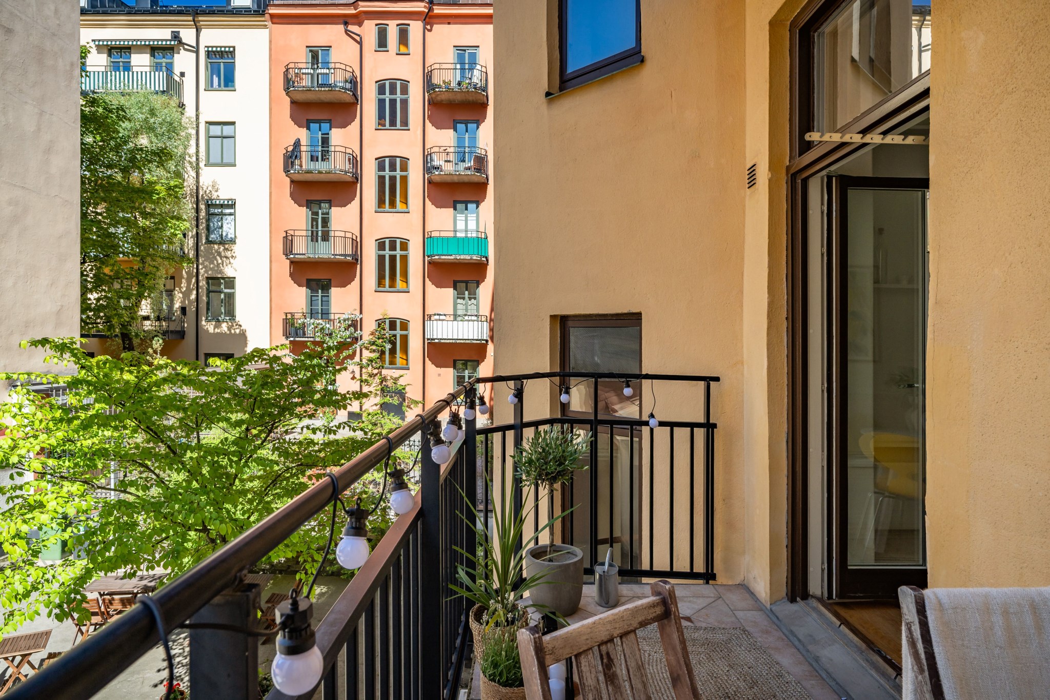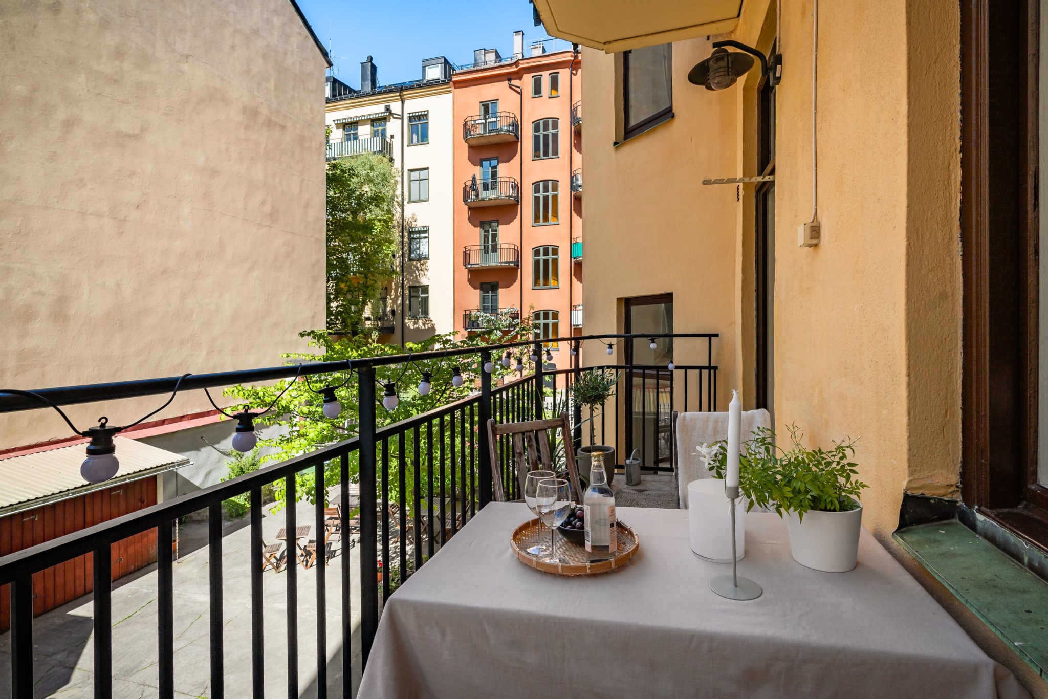 Till lägenheten hör en balkong mot innergård som nås via bostadens kök. Plats att möblera med soff- eller sittgrupp efter smak.