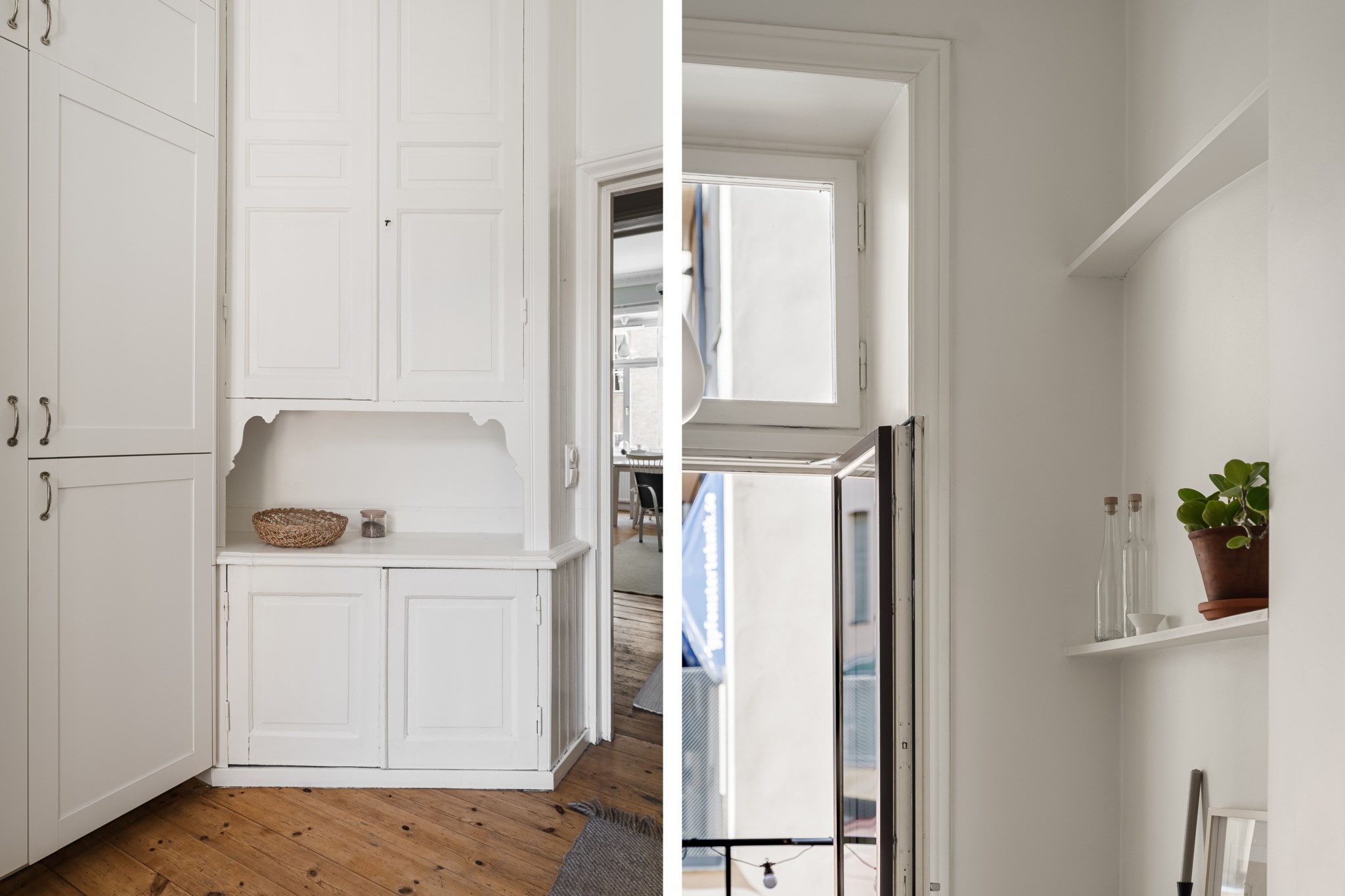 Stilrent kök med generöst ljusinsläpp från dubbla balkongdörrar som vetter mot innergård och bostadens balkong. Genomgående skåpsluckor i vit kulör och svart bänkskiva. Utrustat med induktionshäll, ugn, kolfilterfläkt, diskmaskin, mikrovågsugn samt kyl- och frys. Plats för mindre matgrupp. Väggar i vit kulör och fiskbensparkett.