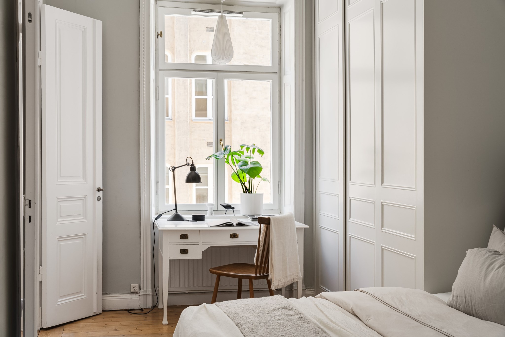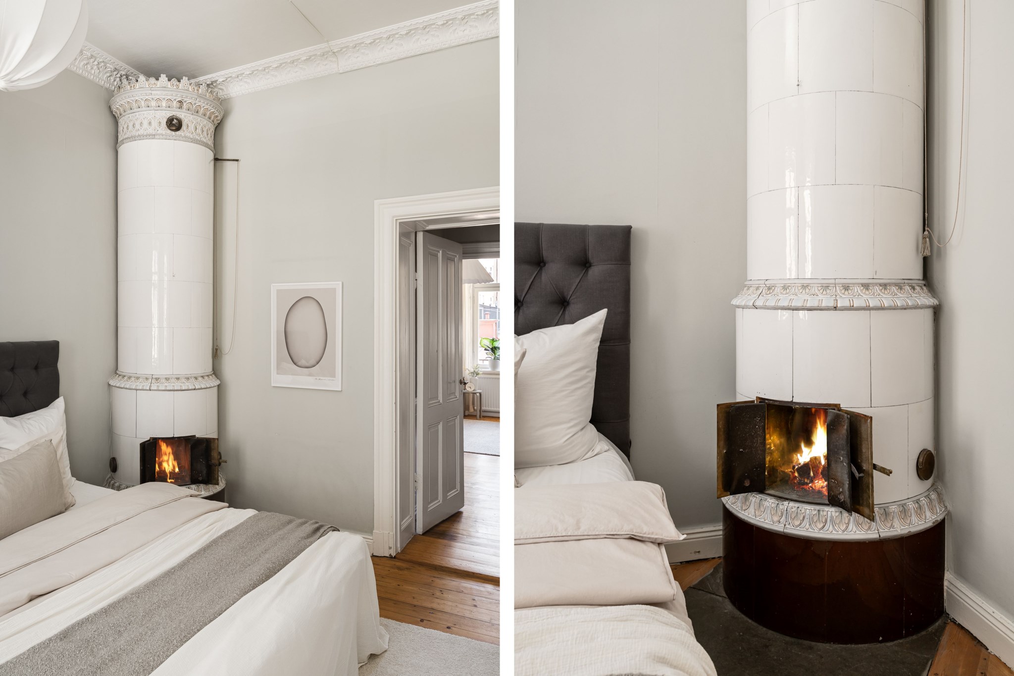 Rogivande sovrum som pryds av generöst ljusinsläpp, vacker fungerande kakelugn och stuckatur. Här finns plats för dubbelsäng, sängbord och skrivbord. Klädförvaring i garderober. Väggar i ljusgrå nyans och fiskbensparkett.