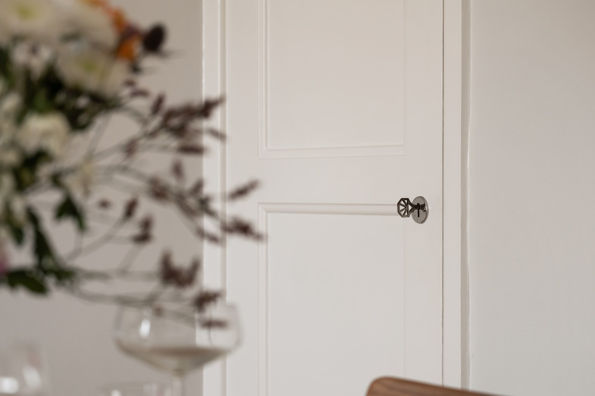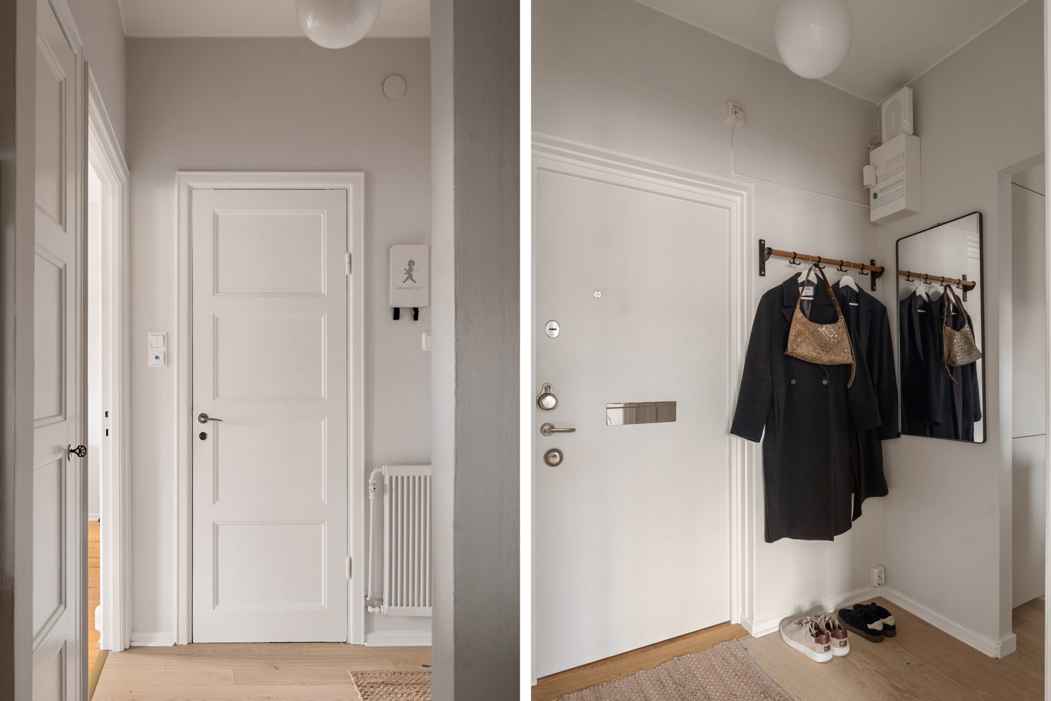 Välkomnande hall med ljusa väggar som skapar en neutral och trivsam entré till bostaden. Här finns praktisk avhängning i form av hatthylla samt spegel som bidrar till både funktion och rymd. Hallen fungerar som en naturlig knutpunkt med access till bostadens samtliga rum, vilket ger en smidig och välplanerad planlösning.