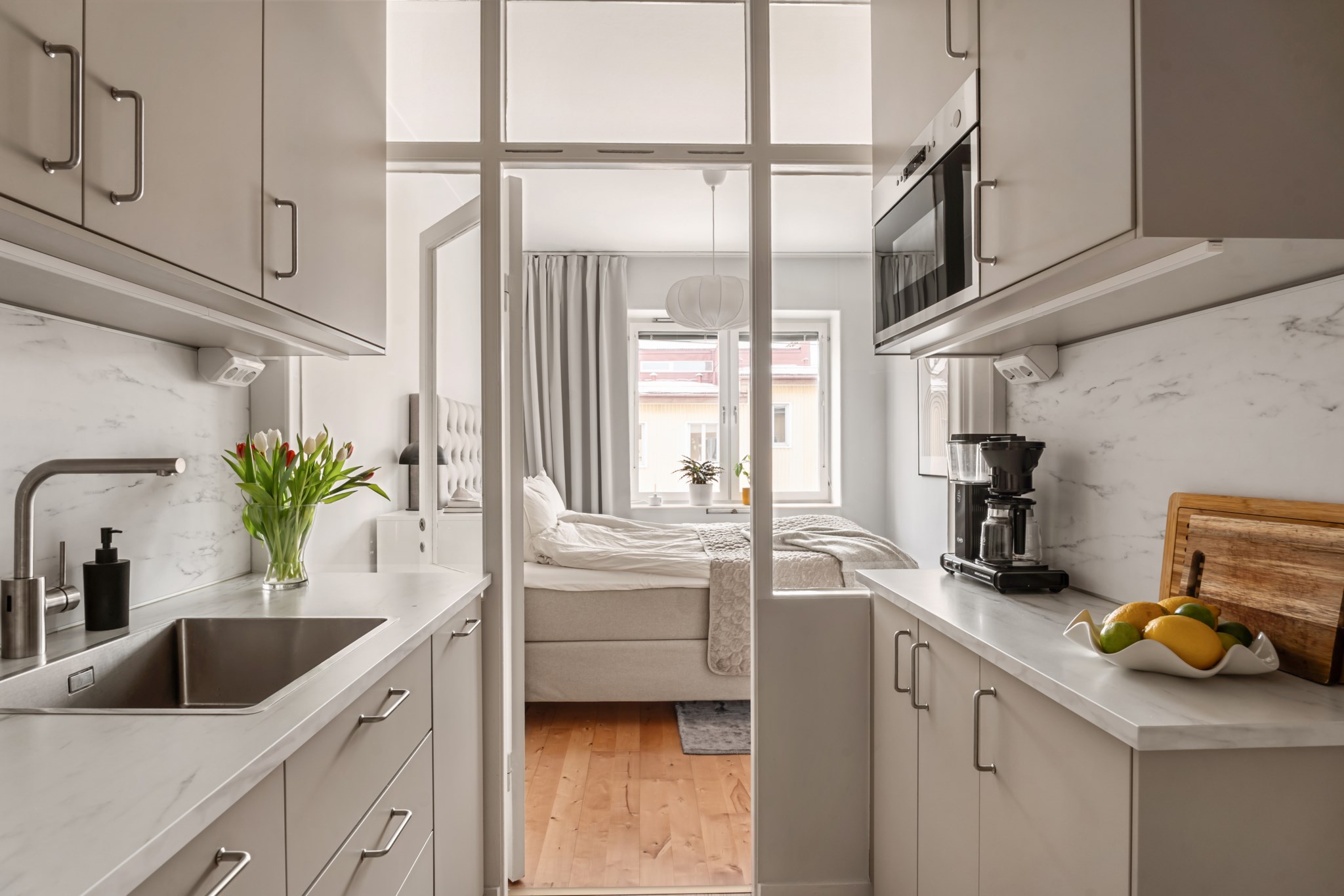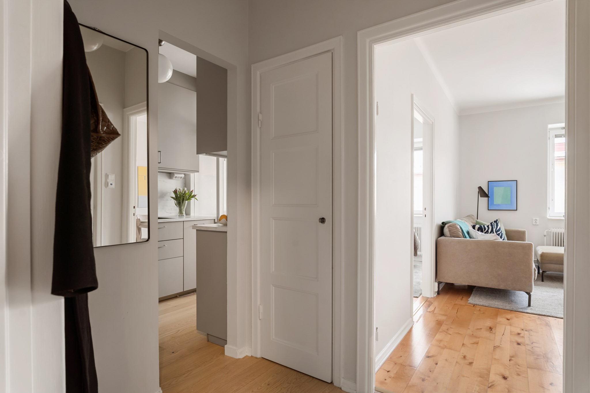 Välplanerad och smakfull bostad med genomgående ljus färgsättning och en harmonisk känsla. Här erbjuds ett hem där varje kvadratmeter är väl utnyttjad, med trivsamma sällskapsytor, ett stilrent renoverat kök och ett rofyllt sovrum. Planlösningen är både funktionell och inbjudande och skapar en naturlig balans mellan sociala ytor och privata rum. Generösa fönsterpartier bidrar till ett fint ljusinsläpp och ger bostaden en luftig och behaglig atmosfär.