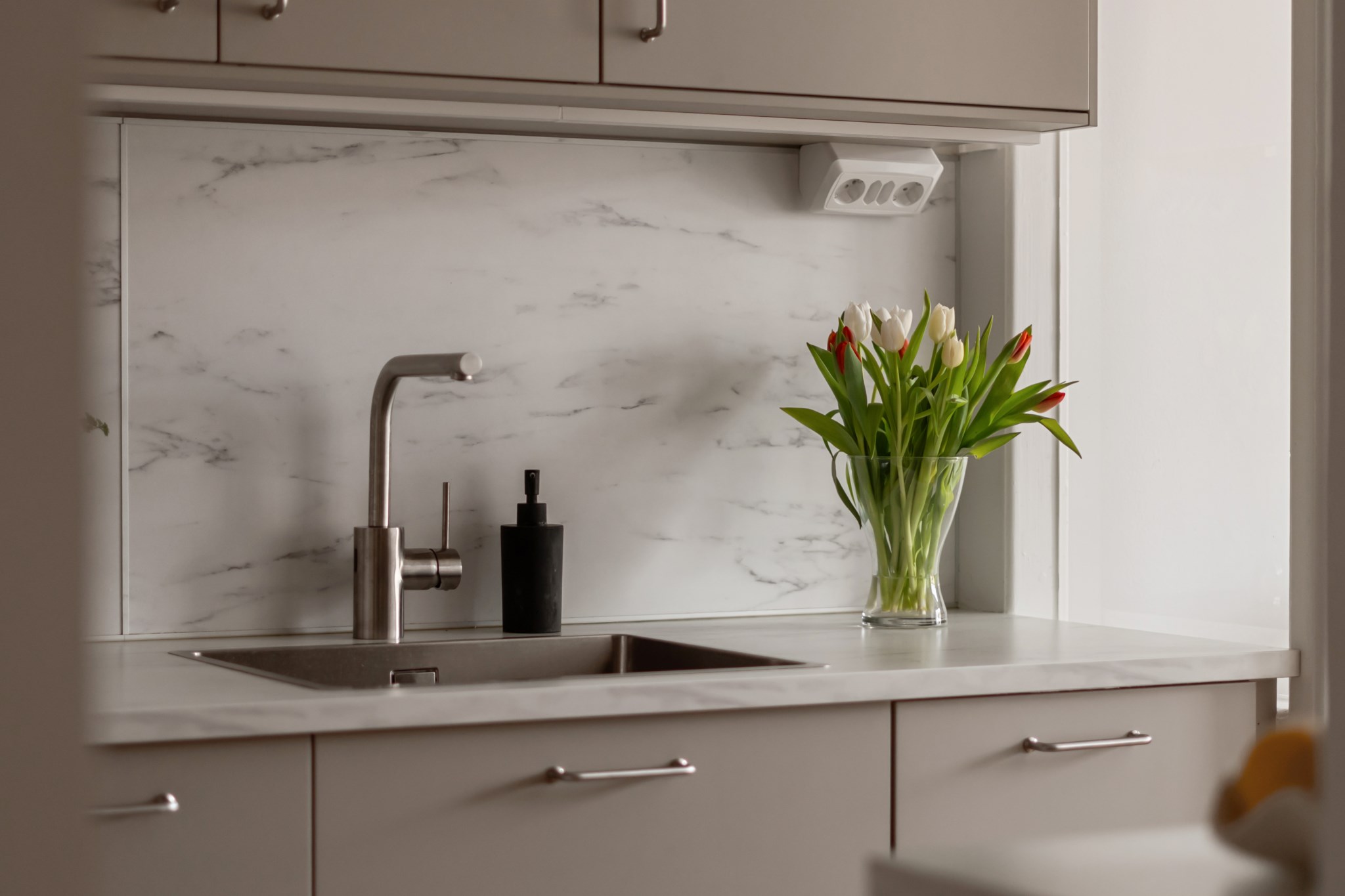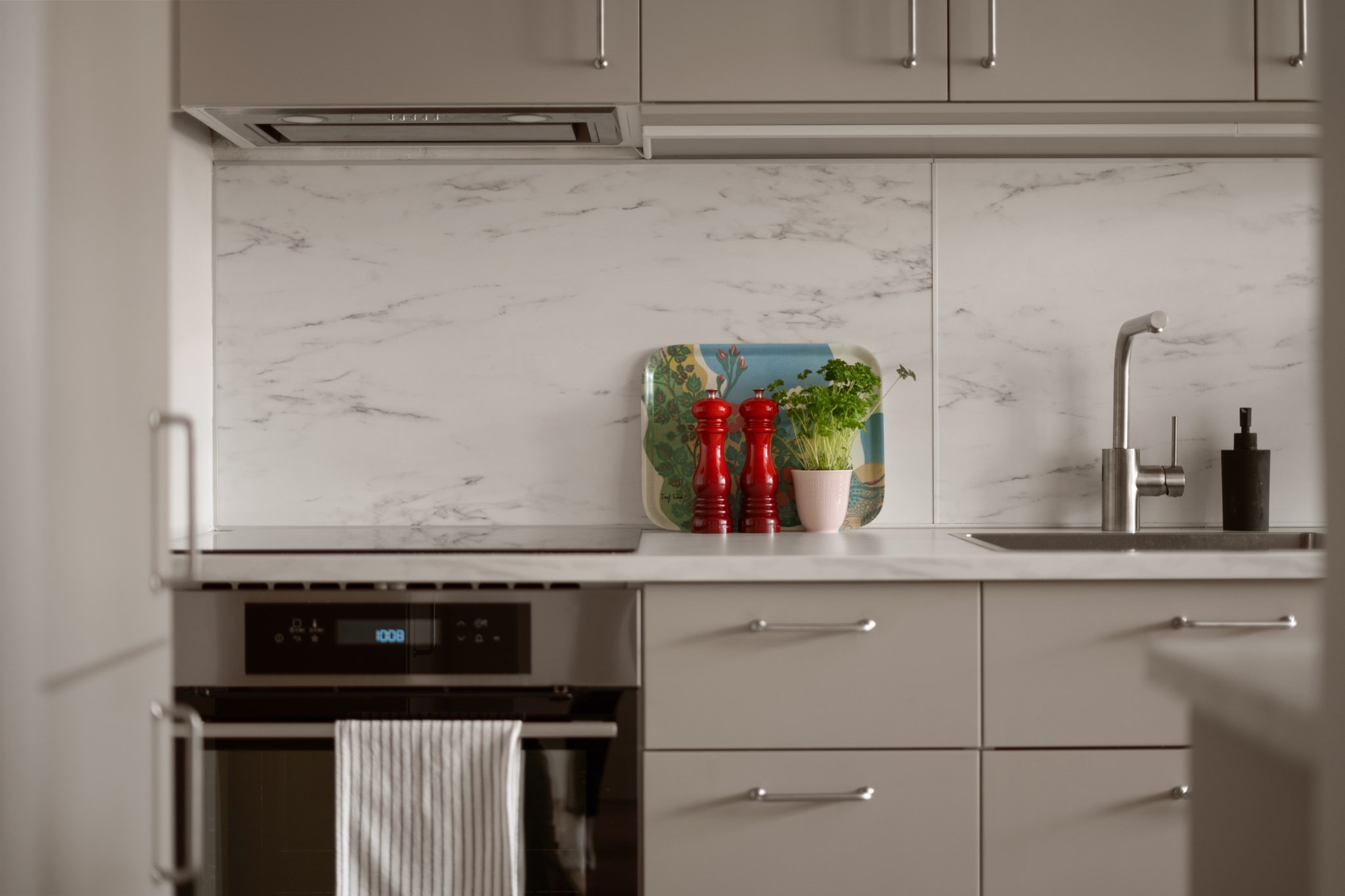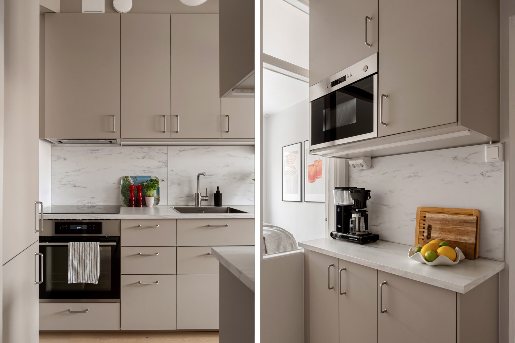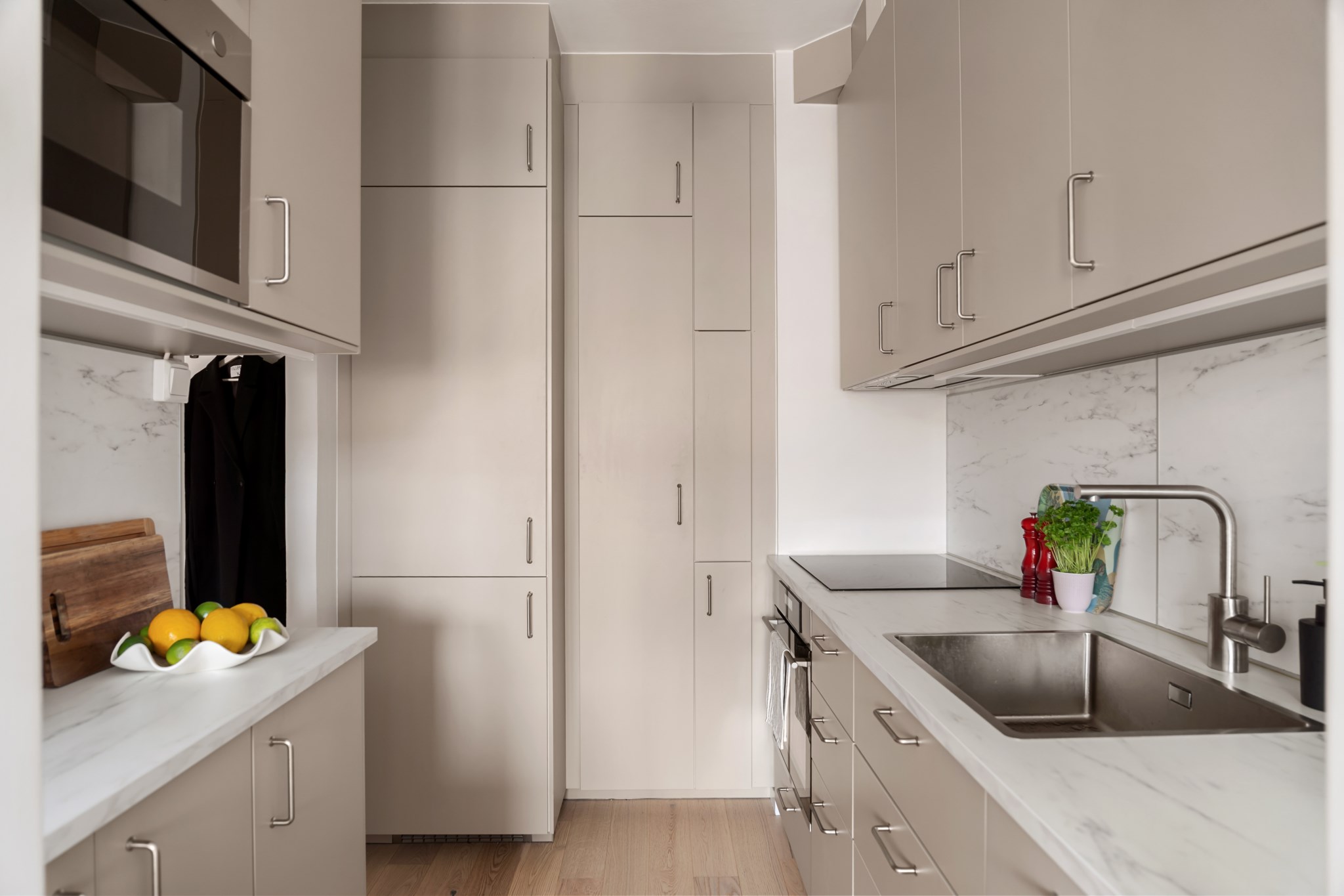 Stilrent och välplanerat kök, renoverat år XX, med generösa arbetsytor och gott om förvaring bakom ljusa skåpluckor. Den smarta dispositionen med arbetsbänkar på båda sidor skapar en praktisk och effektiv arbetsmiljö. Köket är utrustat med spishäll, ugn, mikro, diskmaskin samt kyl och frys. Den tidlösa färgsättningen ger ett ljust och harmoniskt uttryck, och glaspartiet mot intilliggande rum förstärker rymden samt släpper igenom ett behagligt ljusflöde.