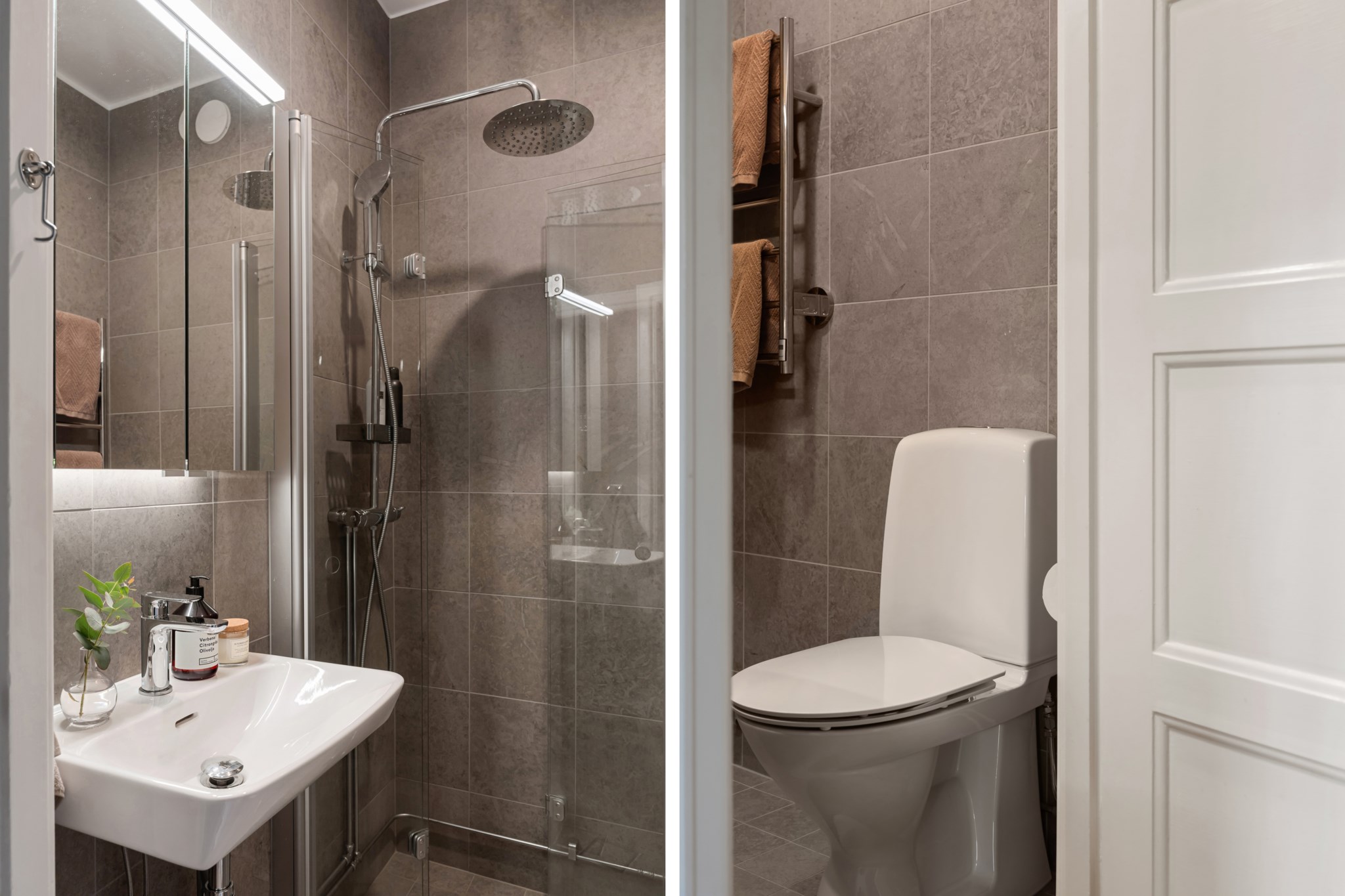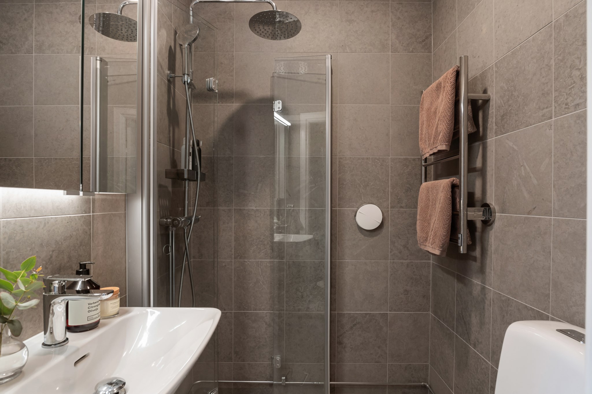 Helkaklat badrum, renoverat år XX, i stilrena och tidlösa färgval. Badrummet är utrustat med dusch med glasvägg, wc samt handfat med spegelskåp ovan. Praktisk handdukstork bidrar till både komfort och funktion. Ett välplanerat badrum med en modern och genomtänkt utformning.