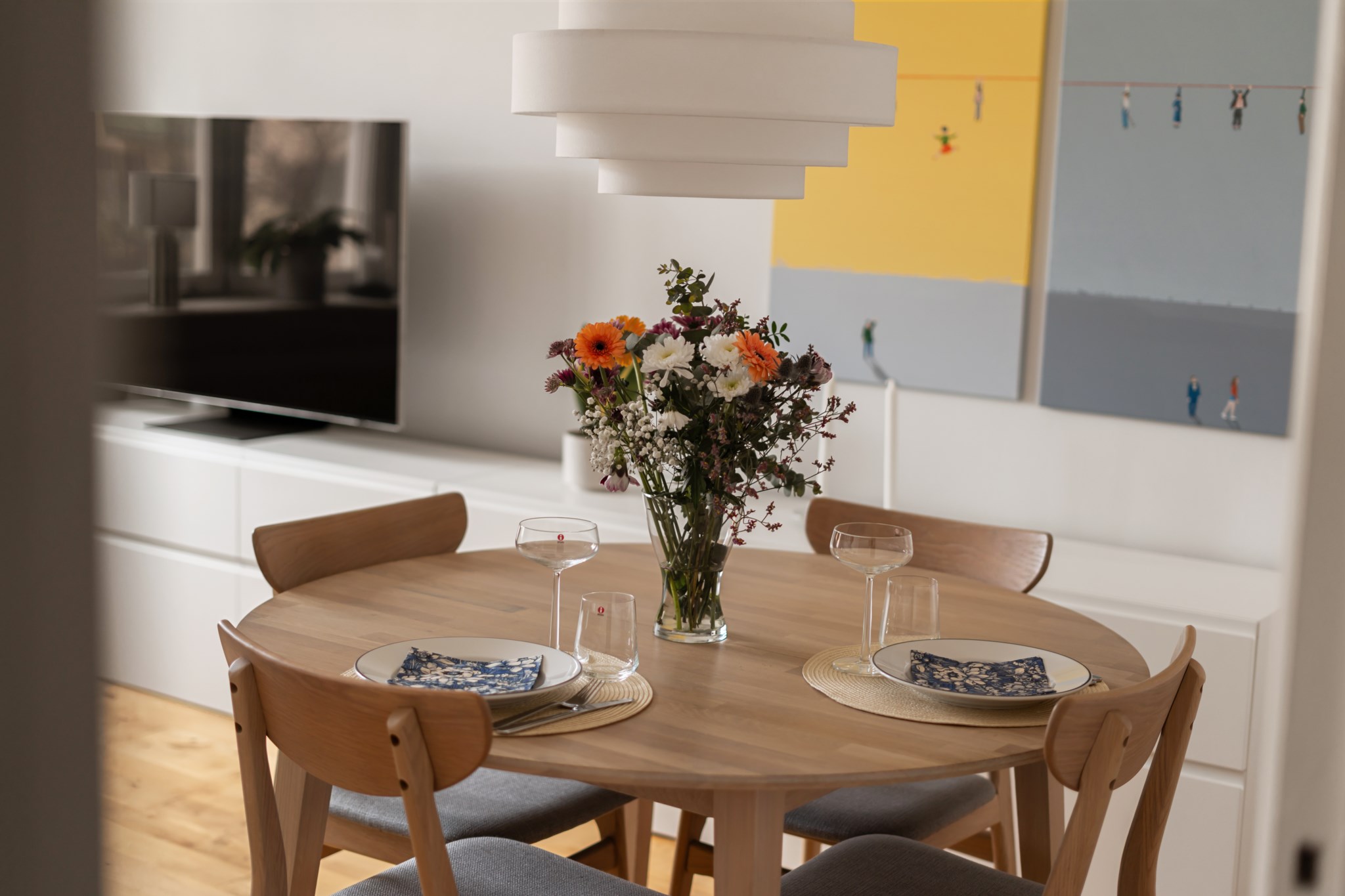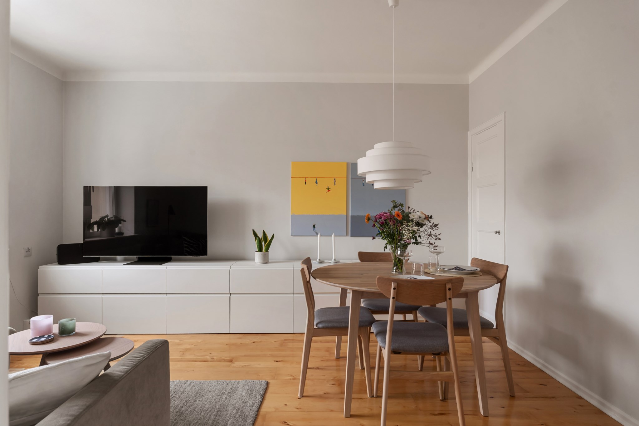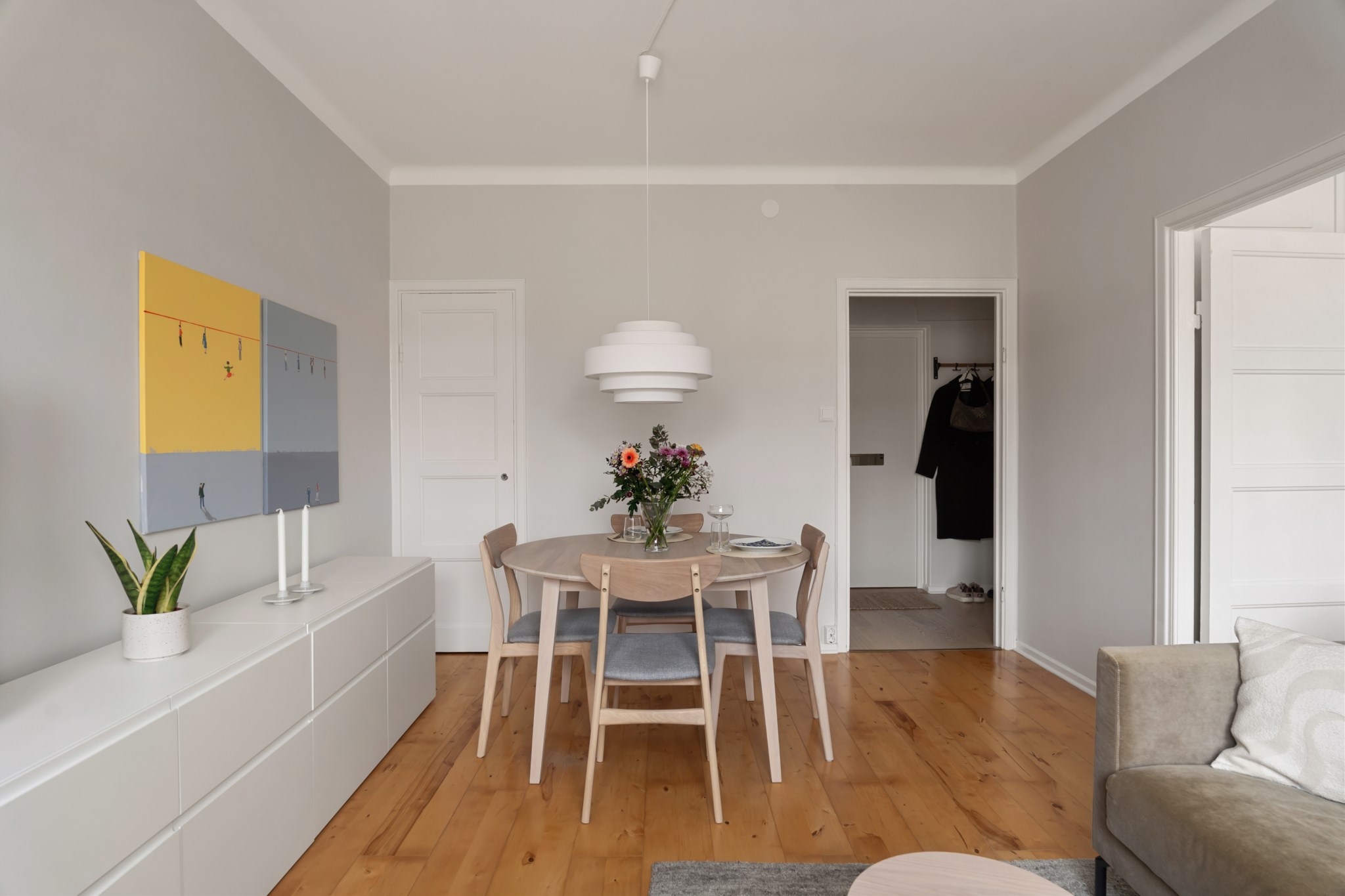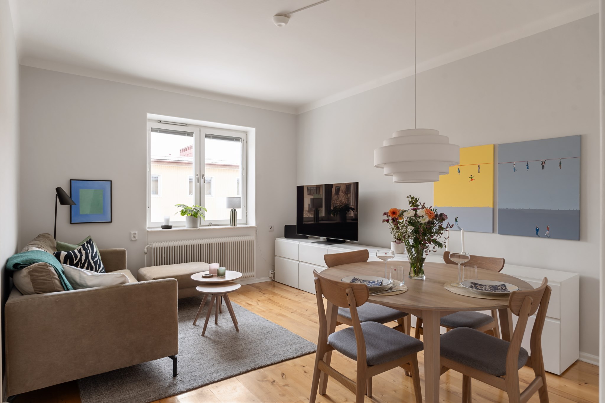 Ljust och trivsamt vardagsrum med generösa ytor som enkelt rymmer både soffgrupp och matplats. De ljusa väggarna tillsammans med fönsterpartiet skapar en luftig och inbjudande atmosfär. Rummet erbjuder flexibla möbleringsmöjligheter och passar lika bra för sociala tillställningar som för avkopplande hemmakvällar. Ett harmoniskt sällskapsrum med gott om plats för både umgänge och vardagsliv.