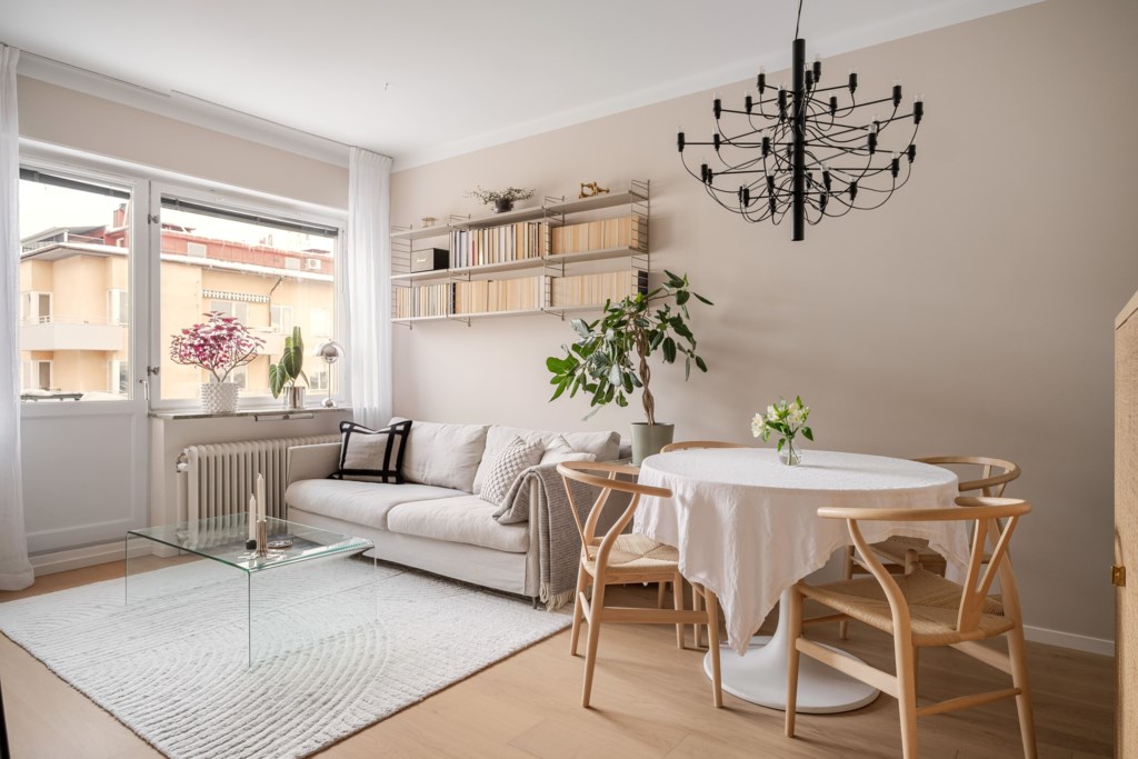 Rymligt vardagsrum med magiskt ljus från stora fönster. I vardagsrummet finns plats för varierad möblering med soffa, soffbord, mediebänk och margrupp. Det finns en fungerande öppen spis som är sotad och provtryckt under slutet av 2023 samt utgång till bostadens balkong. Väggar i en beige nyans och fiskbensparkett.