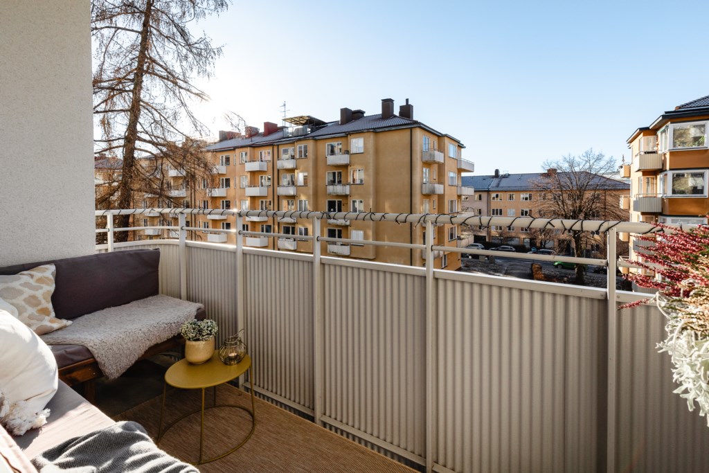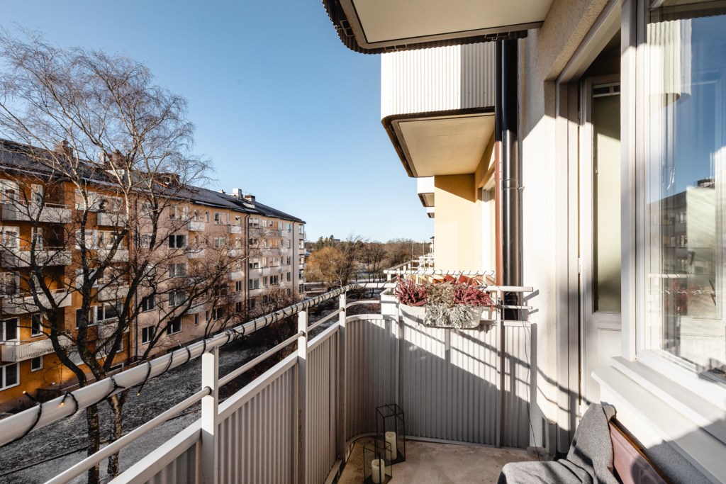 Till bostaden hör en solig balkong i söderläge med plats för utemöbler, växtlighet och planteringar.