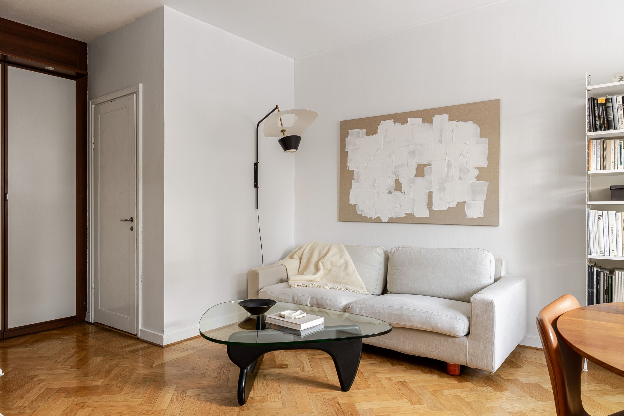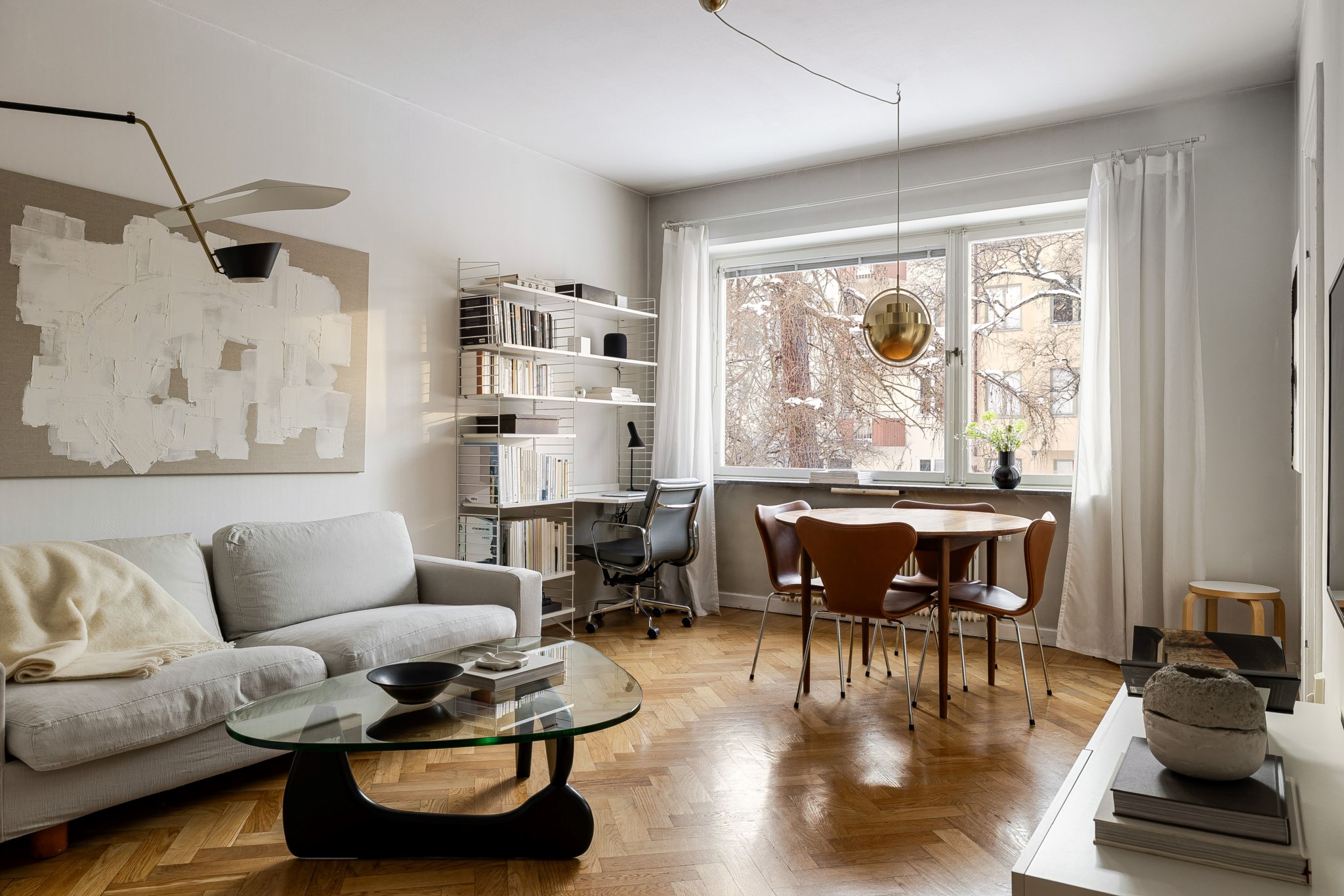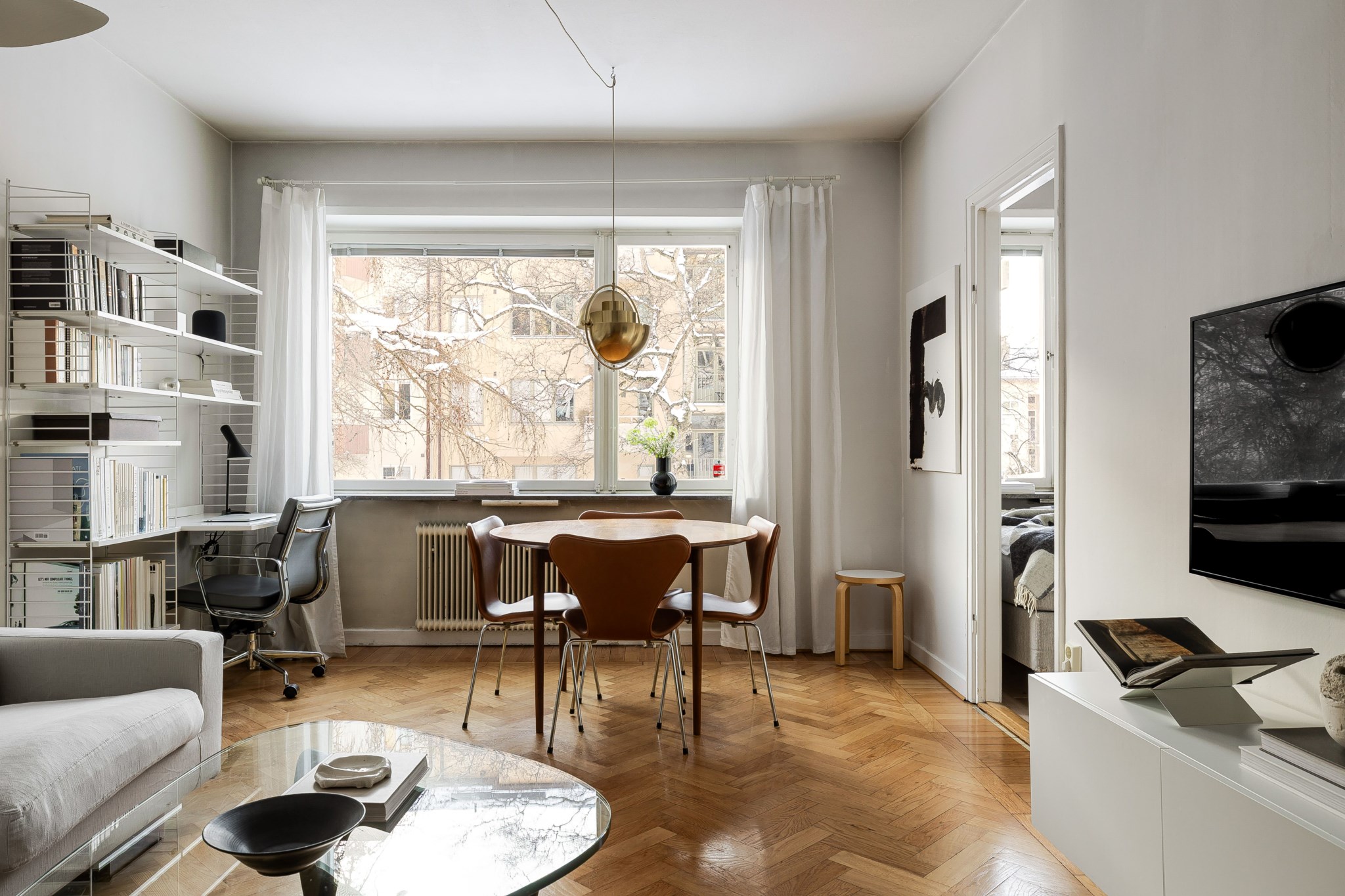 Trivsamt och socialt vardagsrum med ett fantastiskt fönsterparti som släpper in rikligt med naturligt ljus. Rummet erbjuder gott om plats för både soffgrupp och matgrupp samt utrymme för annat möblemang och personlig inredning efter behov. Ljusa ytskikt och vacker fiskbensparkett.
