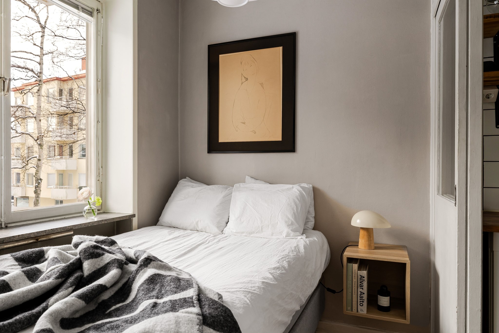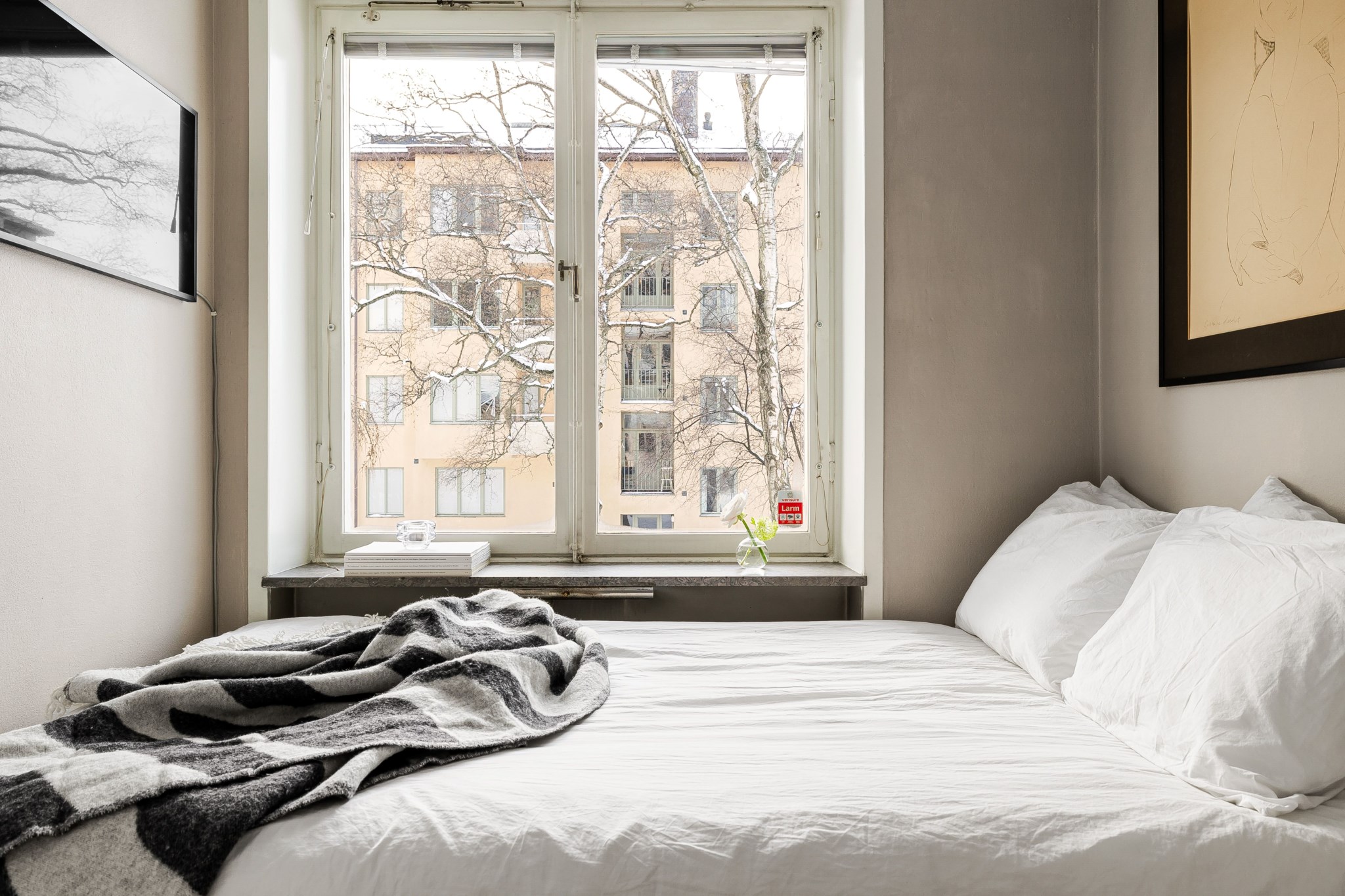 Mysigt sovrum med plats för säng och tillhörande sängbord. Fönster ger ett fint naturligt ljusinsläpp som bidrar till en trivsam och rogivande känsla. Ljusa ytskikt och ljust golv.