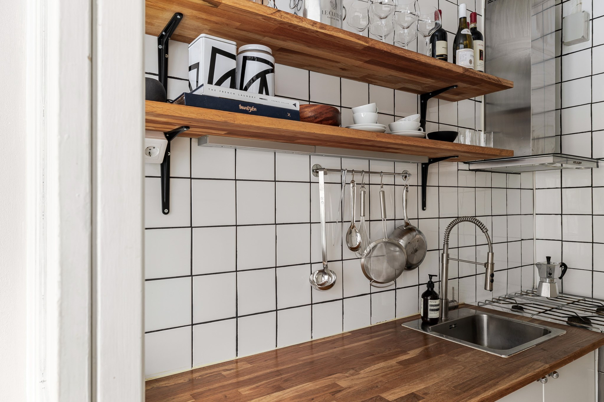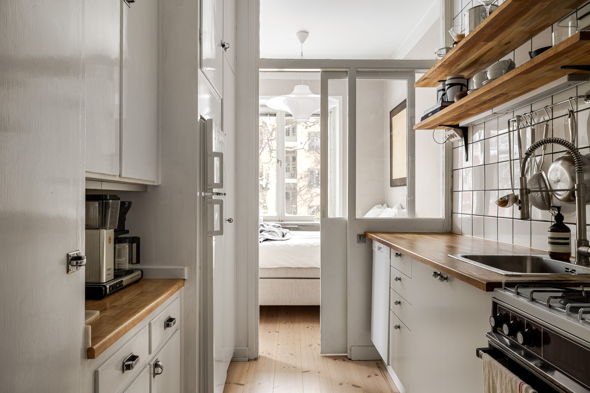 Klassiskt kök med flera bevarade originaldetaljer som ger rummet en tidlös och ombonad karaktär. Ljusa skåpsfronter samspelar med vit kaklad väggpanel som sträcker sig hela vägen upp till tak och en matchande bänkskiva i trä. Öppna trähyllor bidrar både till funktion och charm. Köket är utrustat med kyl/frys, gasspis, ugn och fläkt. Ljusa ytskikt och ljust golv.