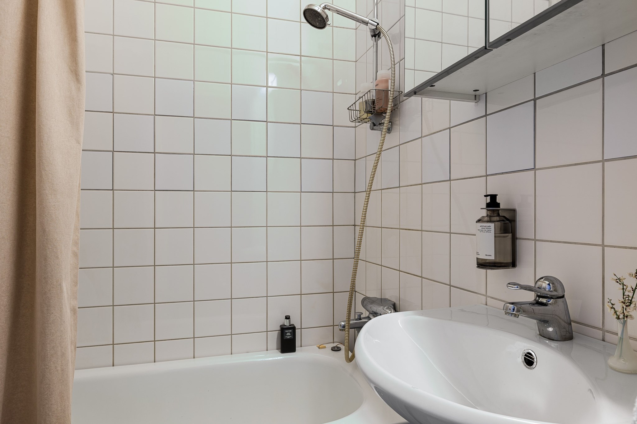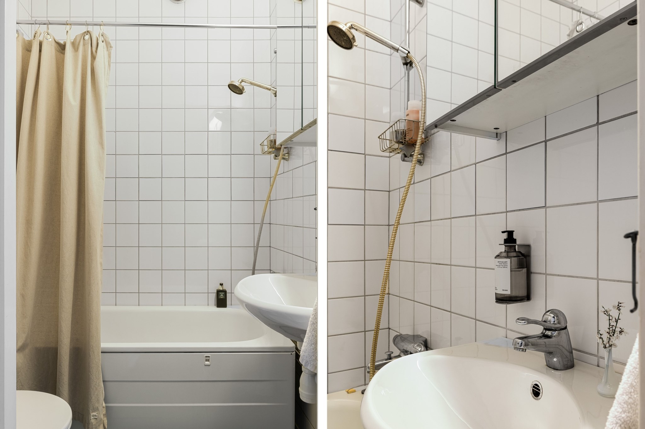 Ljust badrum med kaklade väggar som är inrett med WC, handfat, spegelskåp samt både badkar och dusch.