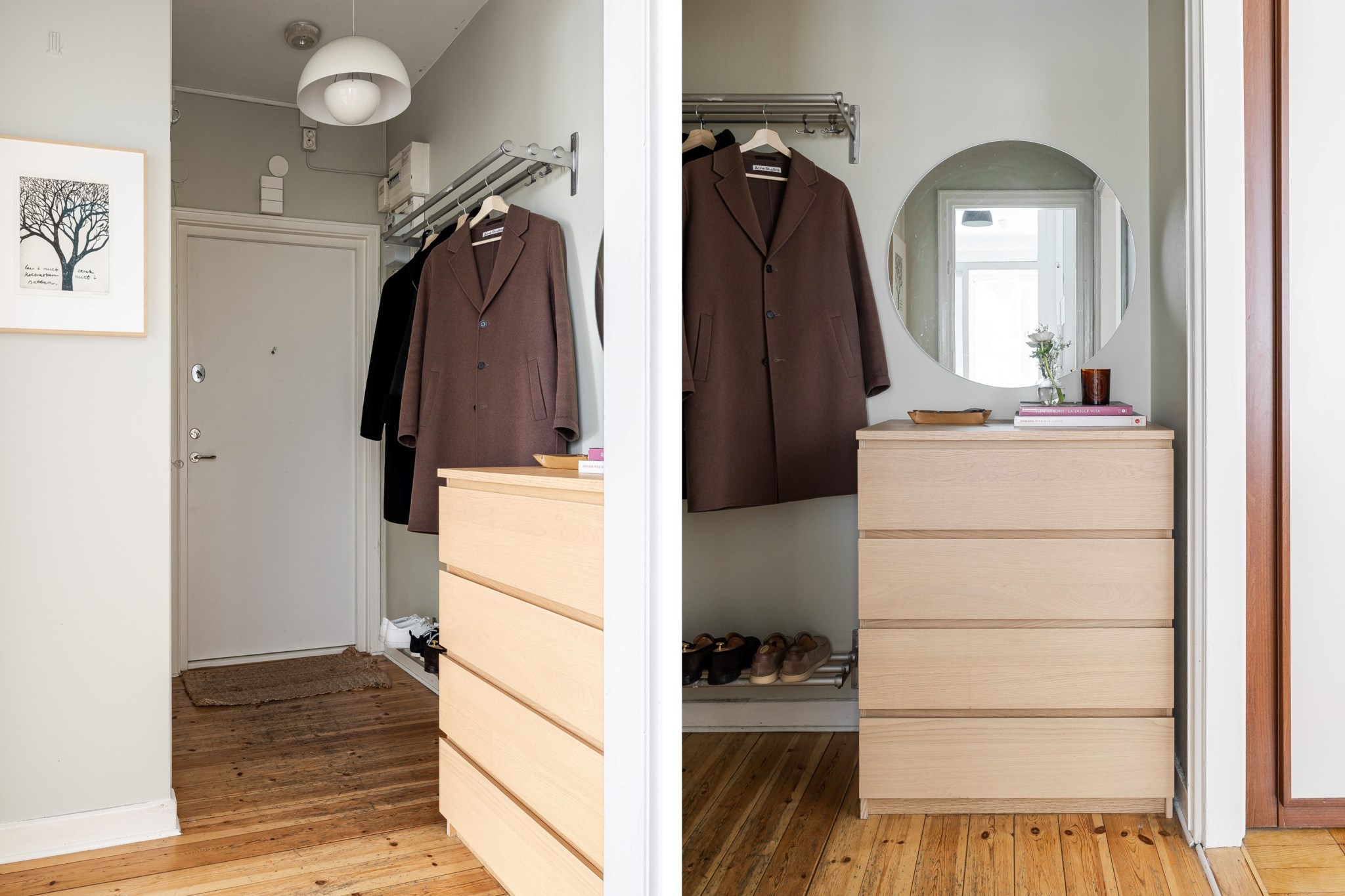 Välkomnande hall med neutralt målade ytskikt och charmigt originalgolv. Här finns plats för enkel avhängning av ytterkläder på hatthylla och i garderober samt möjlighet till ytterligare förvarings- eller avställningsmöbel vid behov.