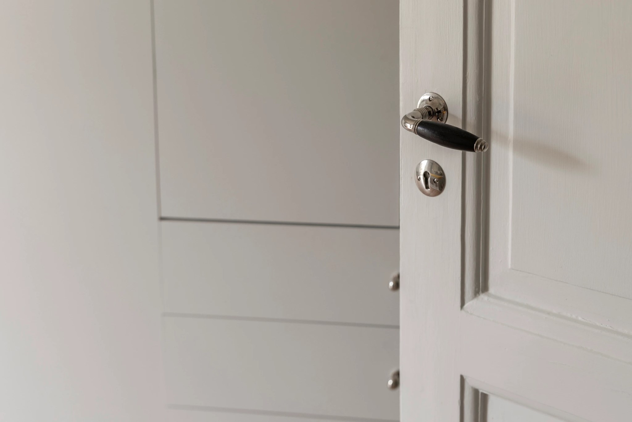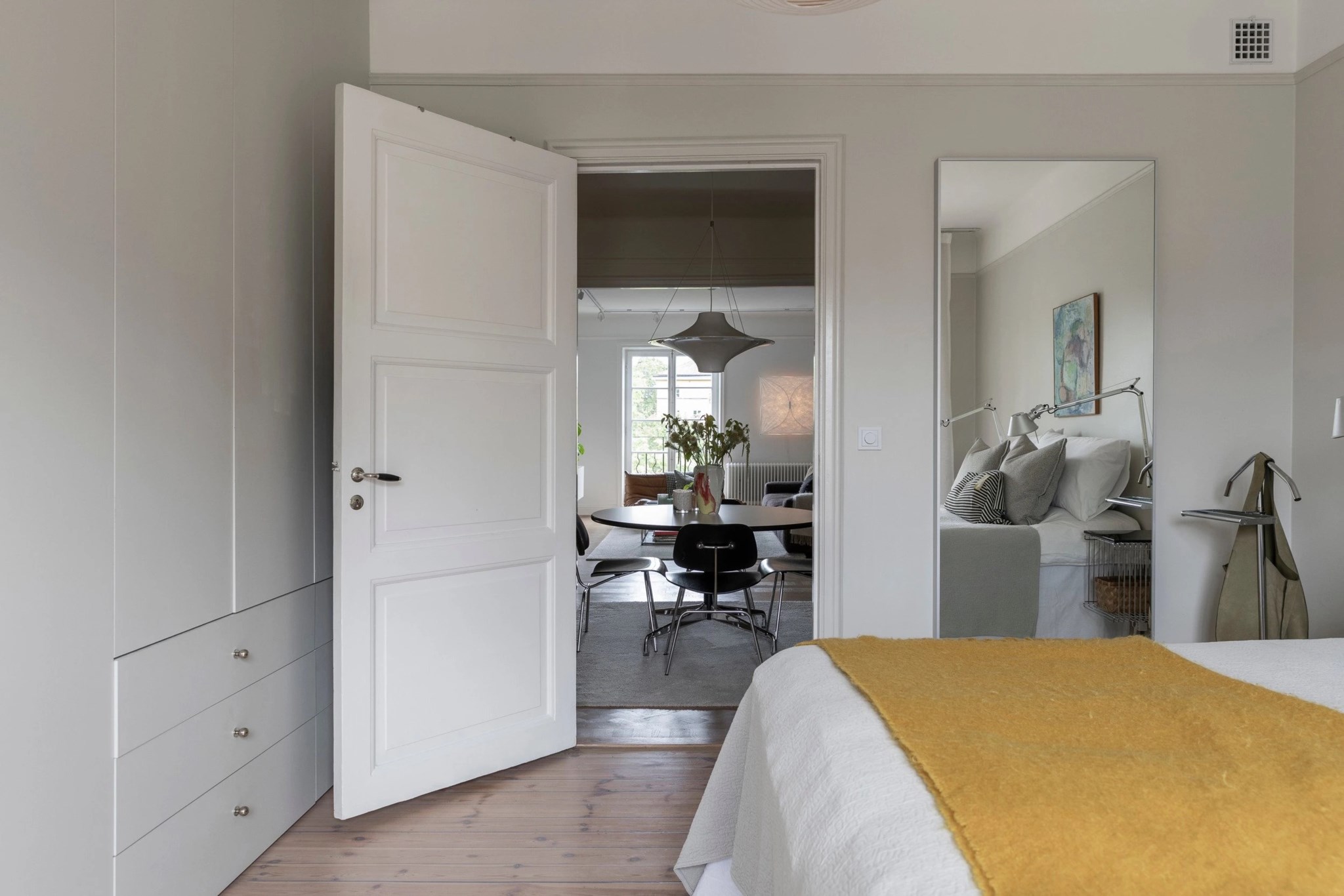 Det stora sovrummet vetter mot den lugna innergården och har utgång till balkong i västerläge med utsikt över takåsar och grönska. Här finns gott om plats för dubbelsäng samt en hel garderobsvägg med generös förvaring. Det andra sovrummet är ljust och rogivande med garderob, inbyggda hyllor och utsikt över takåsar – perfekt som barnrum, gästrum eller arbetsrum.