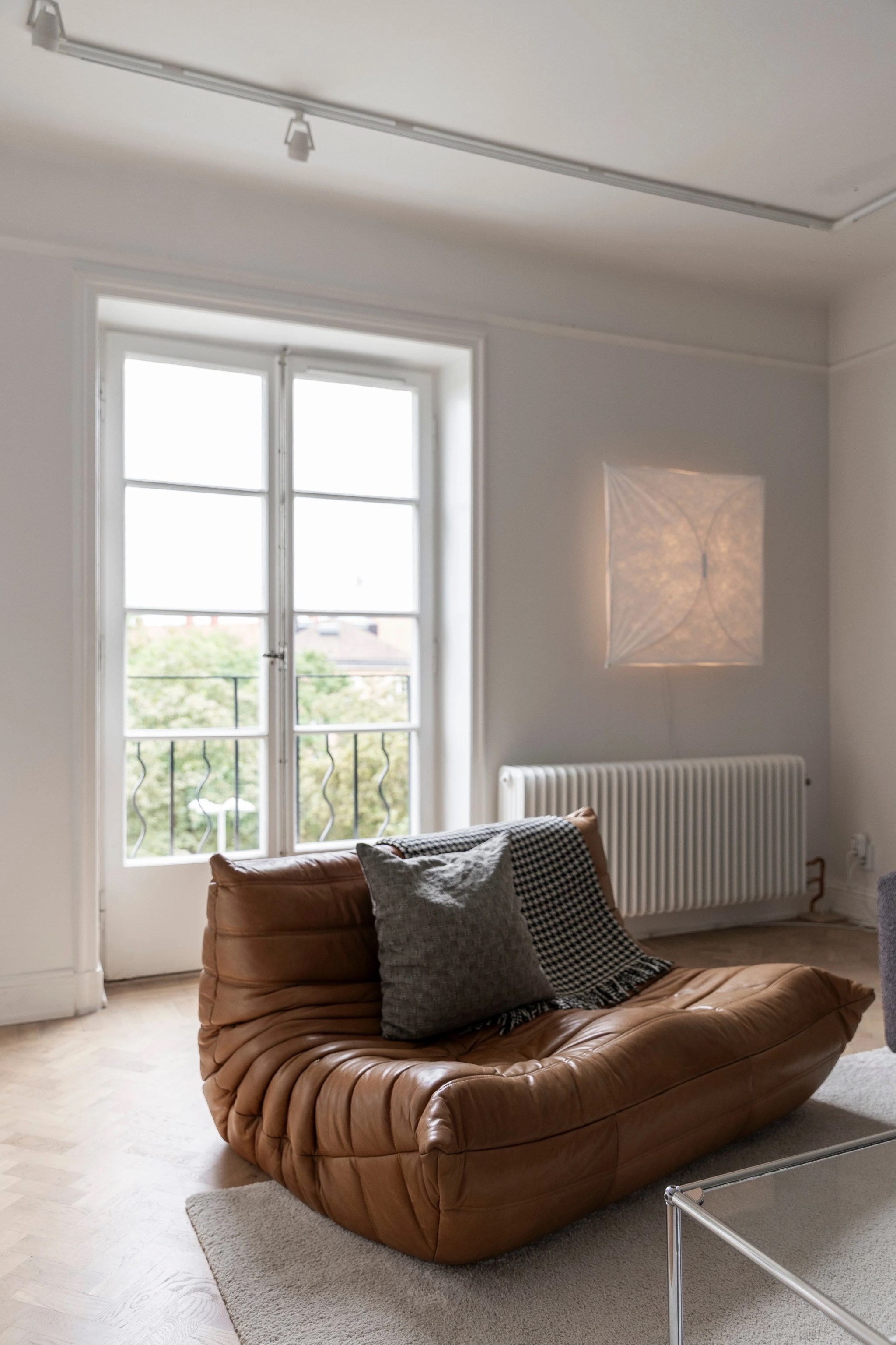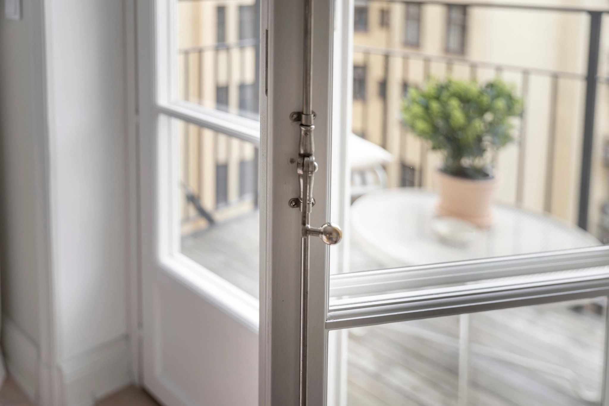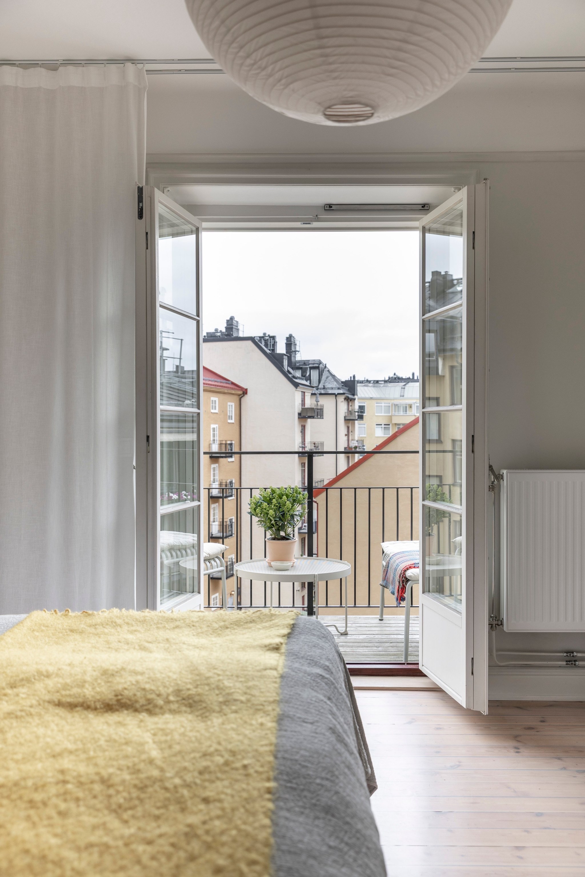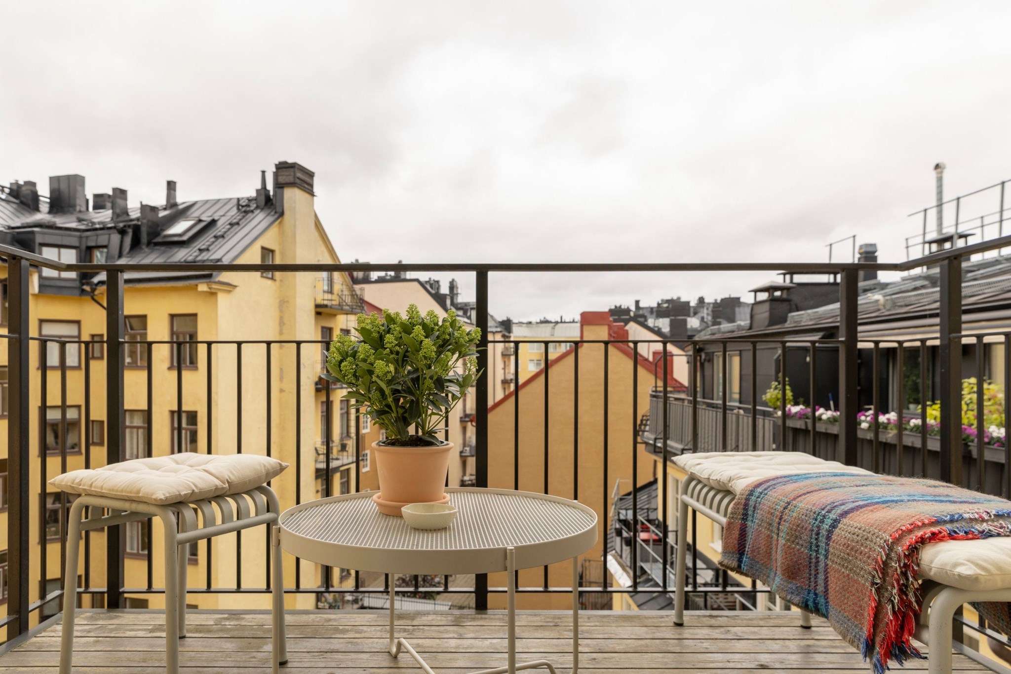 Härlig balkong mot den lugna innergården med utsikt över takåsar i västerläge. Plats för mindre bord och stolar, perfekt för morgonkaffet eller avkoppling i solen.