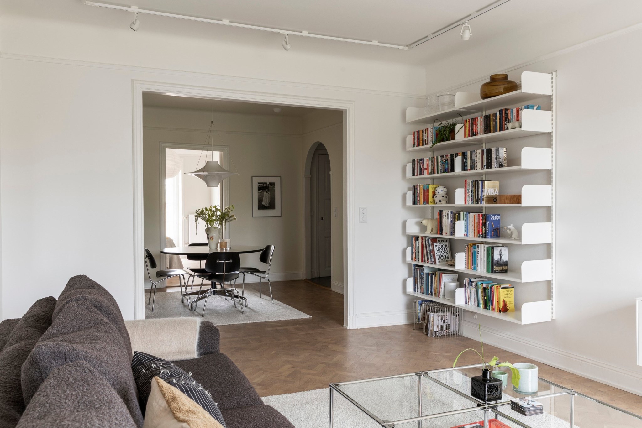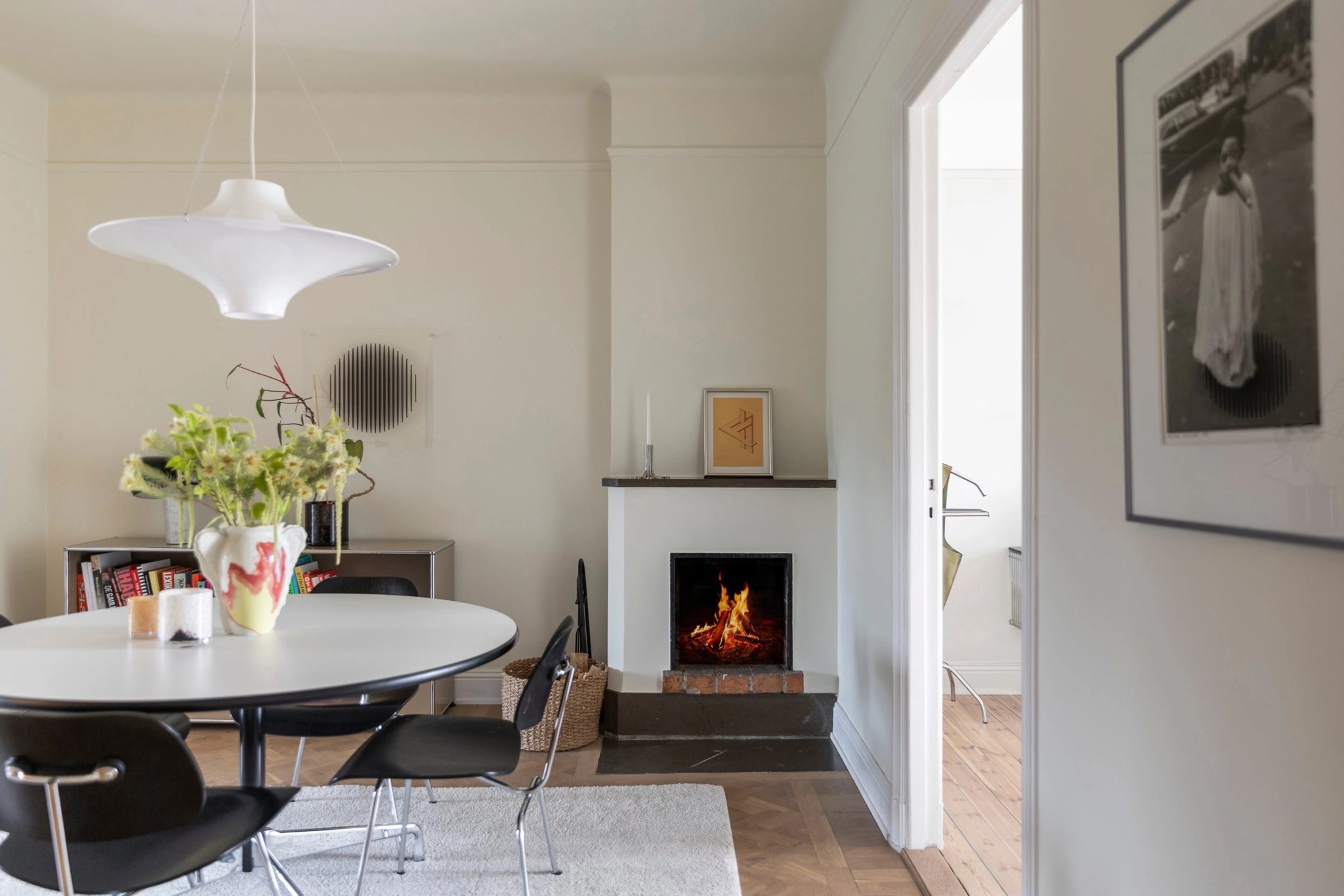 Stilfullt rum med fungerande öppen spis och plats för större matbord eller läshörna. Genomgående ljusa väggar och vacker fiskbensparkett. Den öppna planlösningen mot vardagsrummet skapar en härlig rymd och ett naturligt flöde mellan sällskapsytorna. En tidlös detalj som den välvda öppningen förstärker känslan av karaktär och charm.