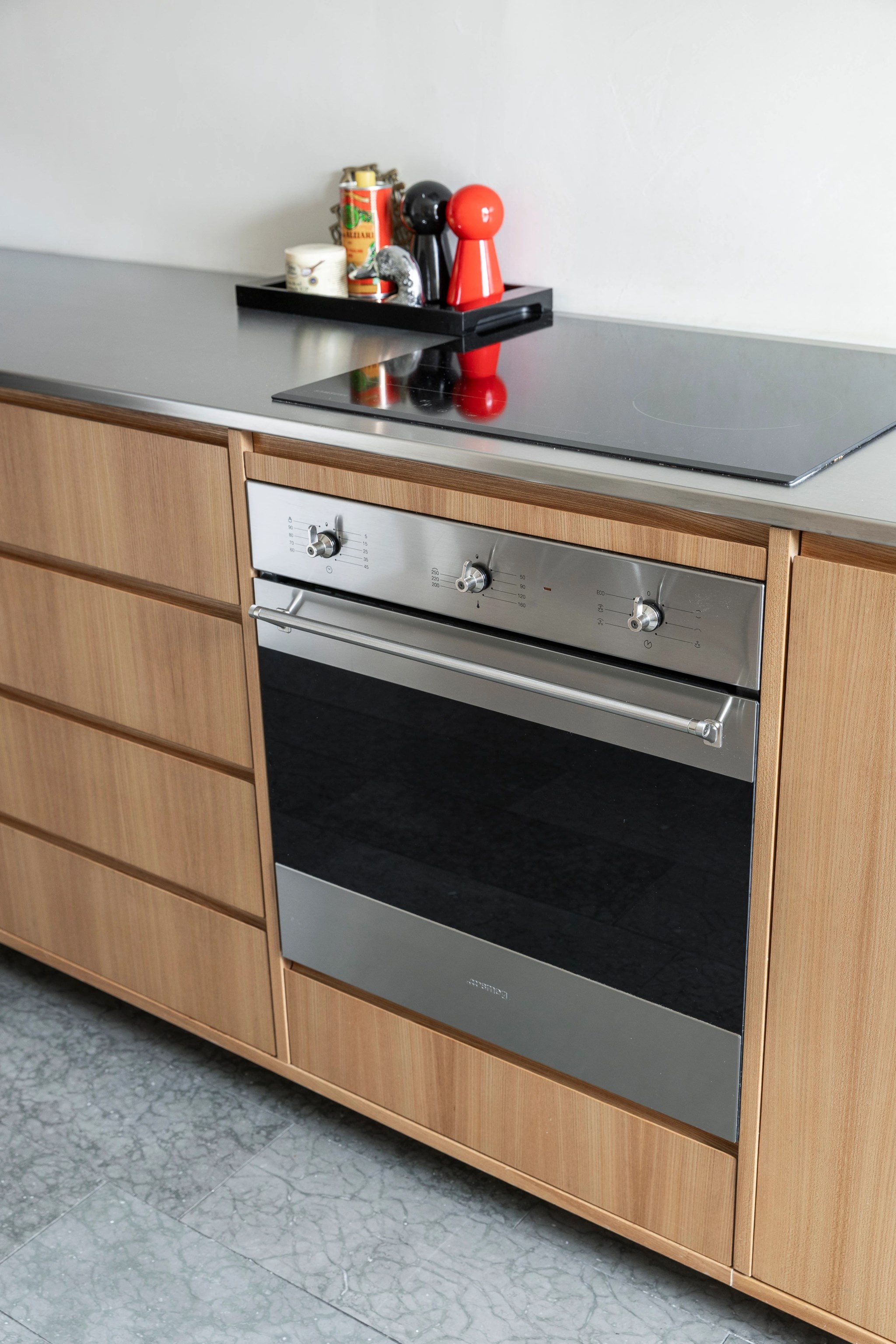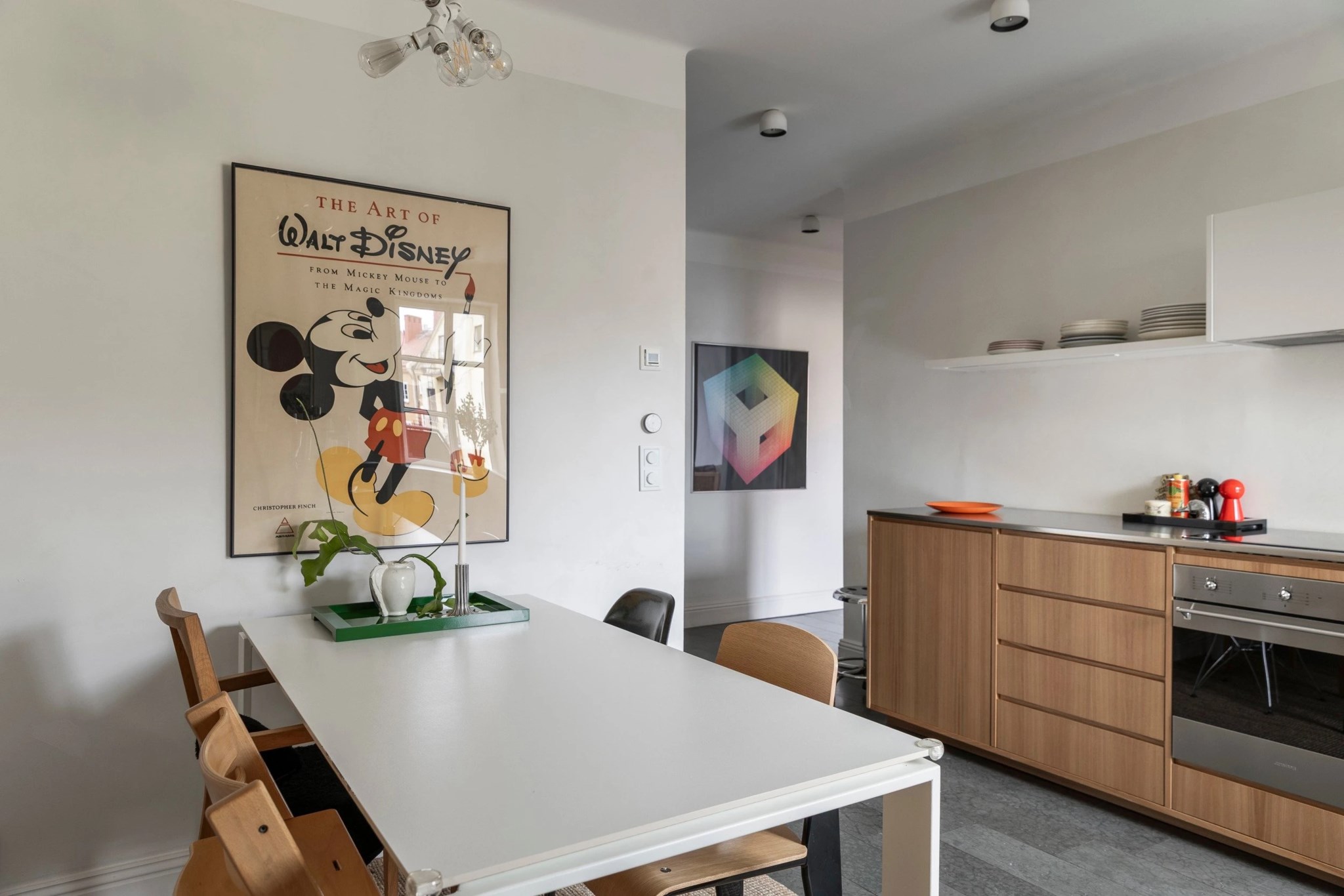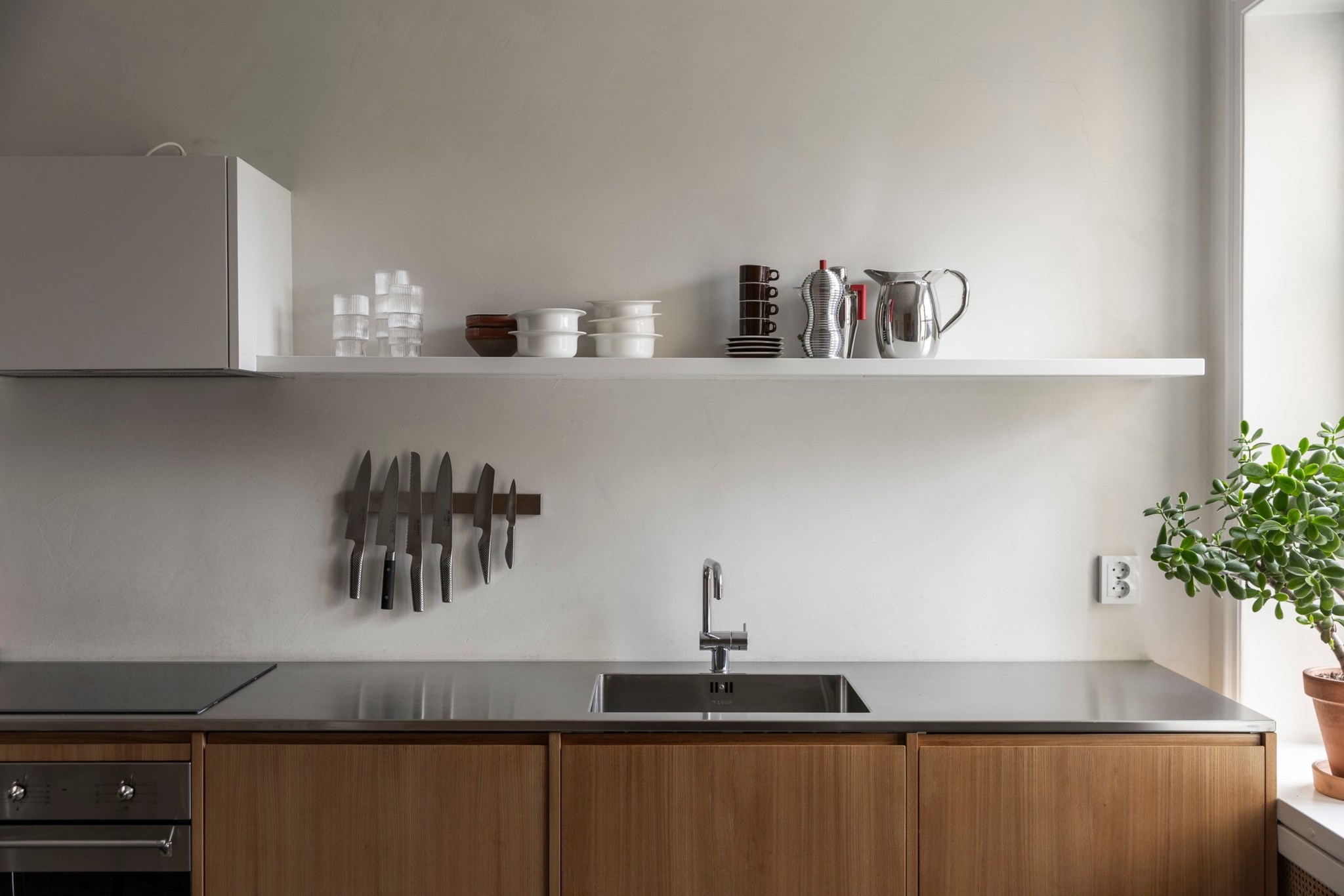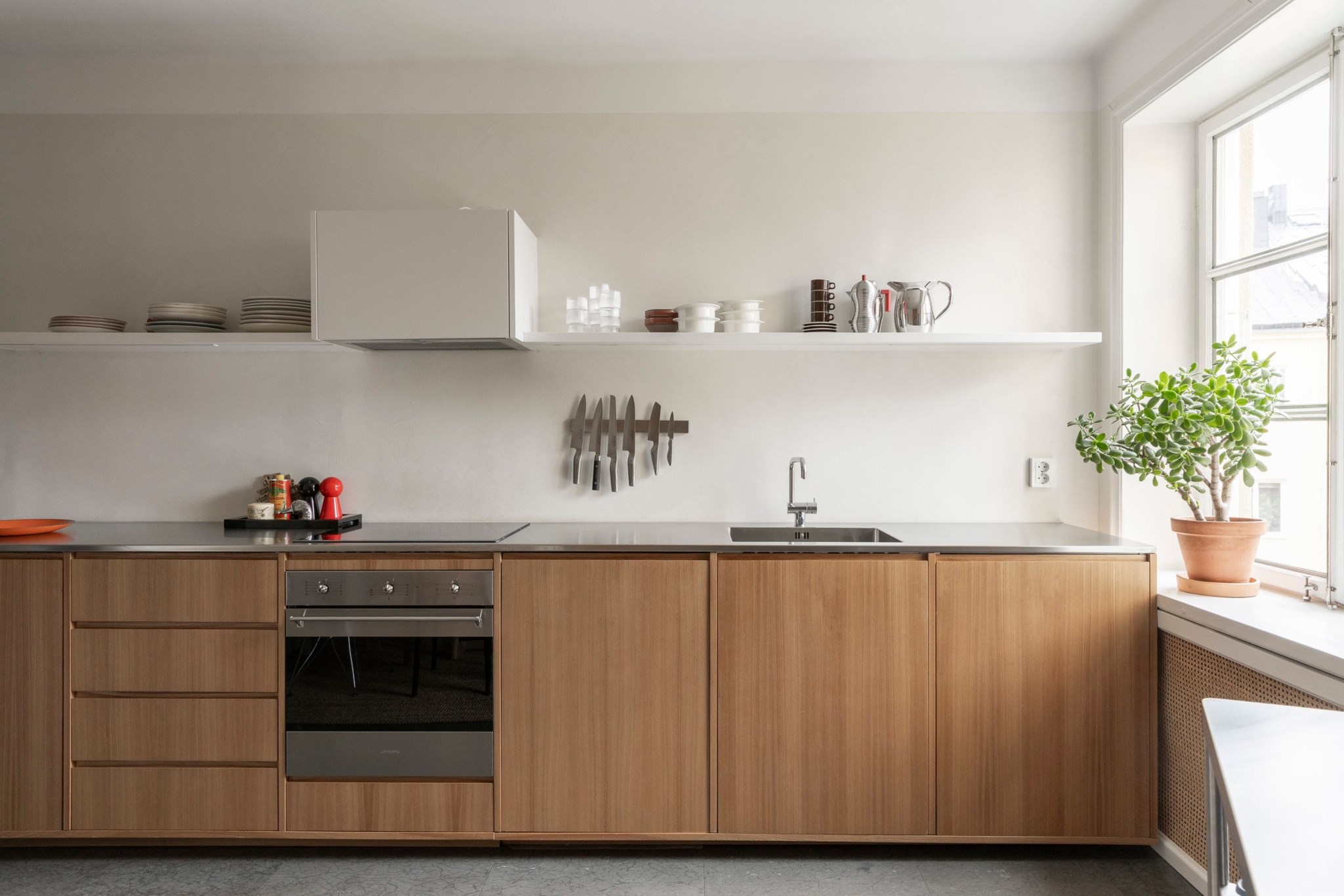 Köket är stilfullt och genomtänkt med träfanérade luckor, grå bänkskiva och öppna hyllor som bidrar till en luftig känsla. Fullt utrustat med moderna vitvaror och plats för matbord för flera personer.