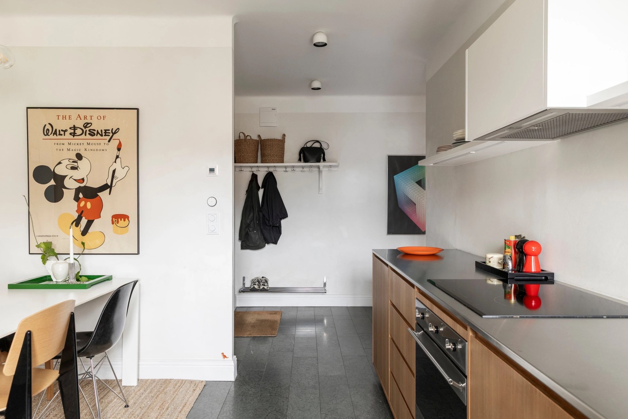 Lägenheten välkomnar med en inbjudande hall med plats för förvaring. Mörkt stengolv och ljusa väggar skapar ett stilrent första intryck. Här finns även en praktiskt placerad tvättmaskin och säkerhetsdörr för ökad trygghet.