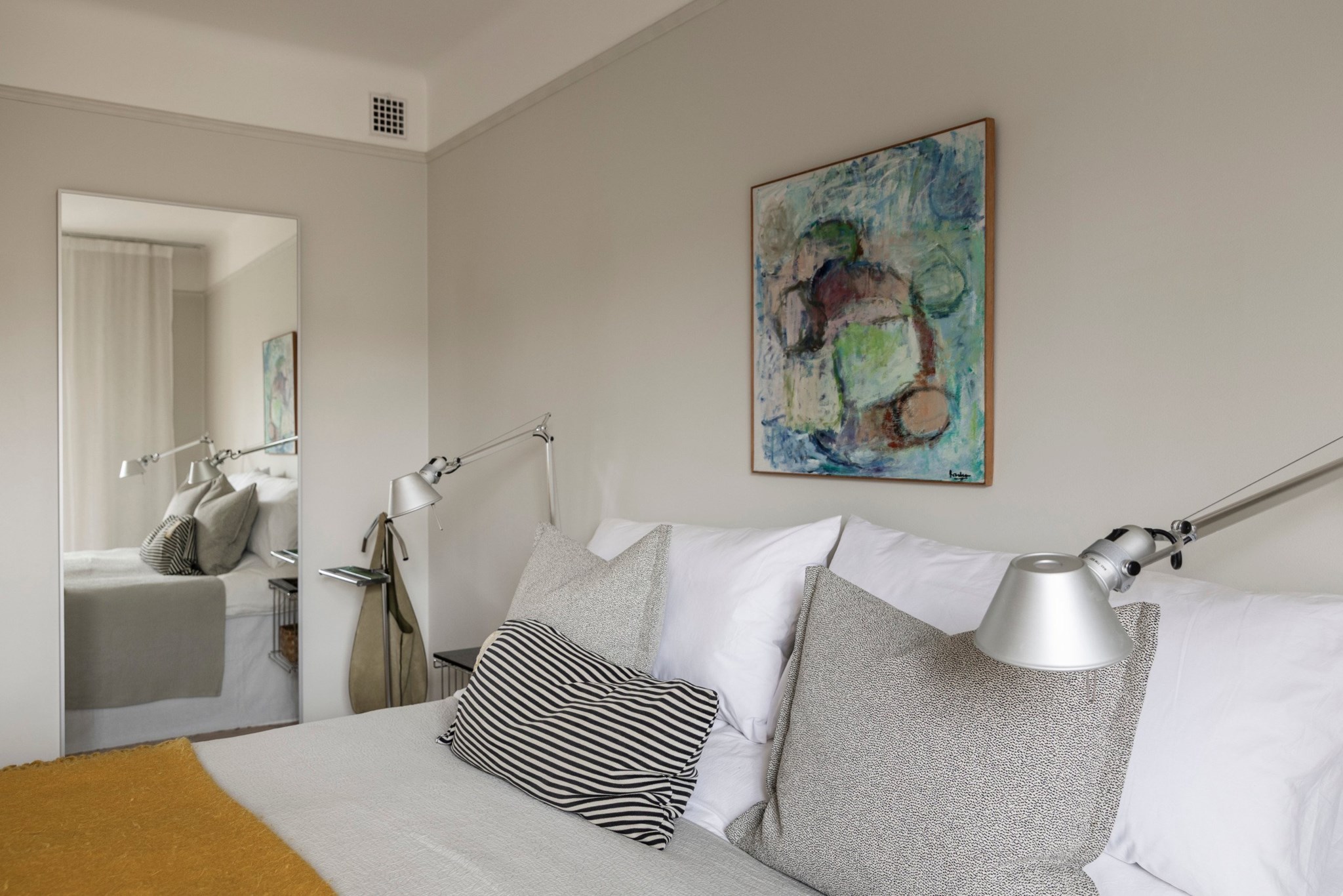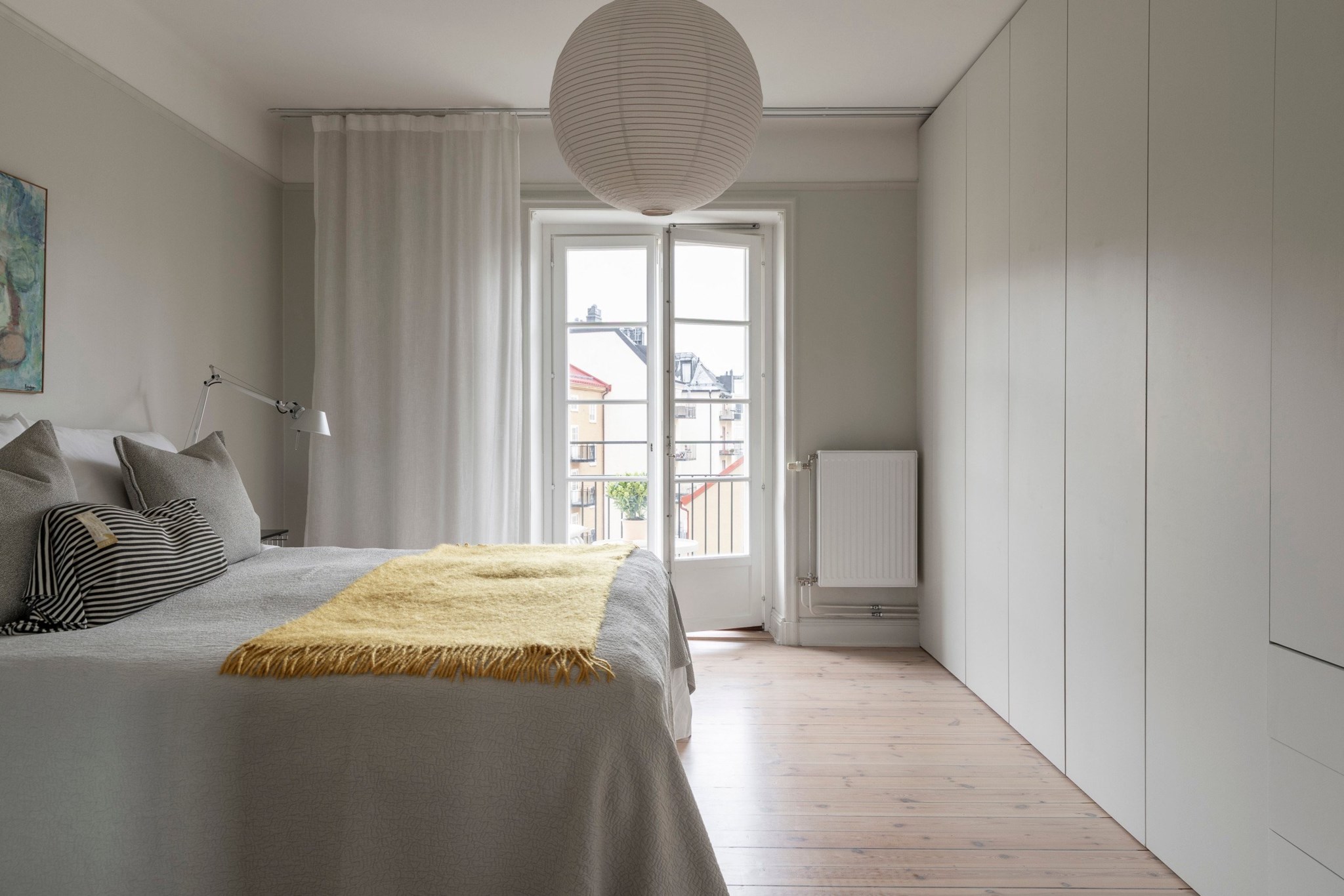 Rogivande sovrum mot den lugna innergården med utgång till balkong. Fin utsikt över takåsar och grönska. Rummet rymmer enkelt en dubbelsäng med tillhörande sängmöbler. En hel garderobsvägg ger gott om förvaring. Ljusa väggar och vackert trägolv skapar en harmonisk atmosfär.