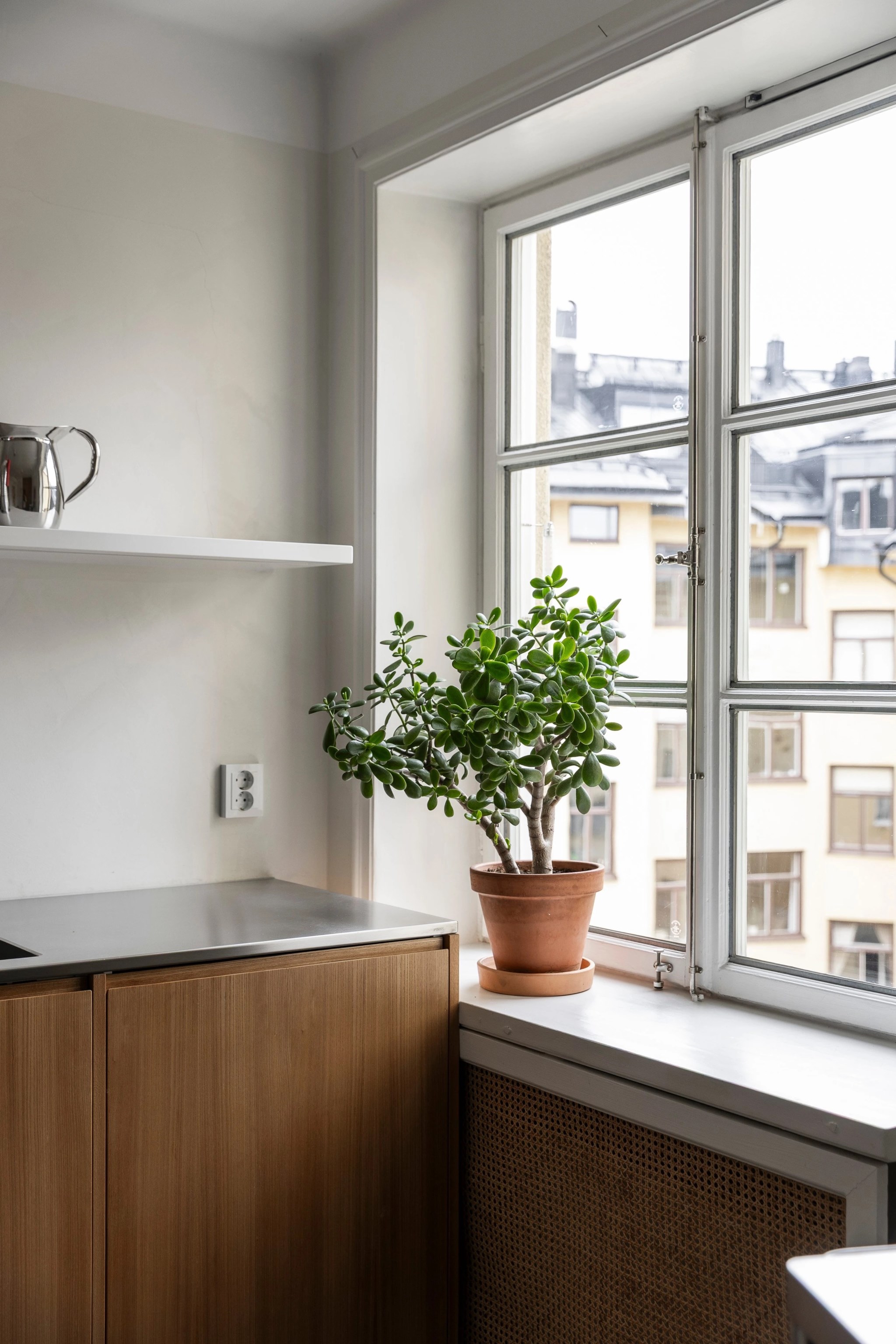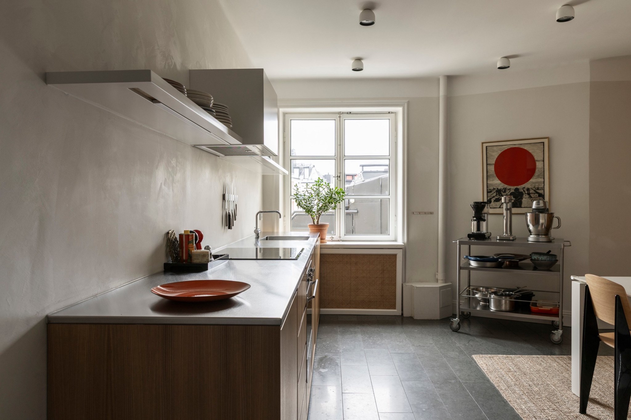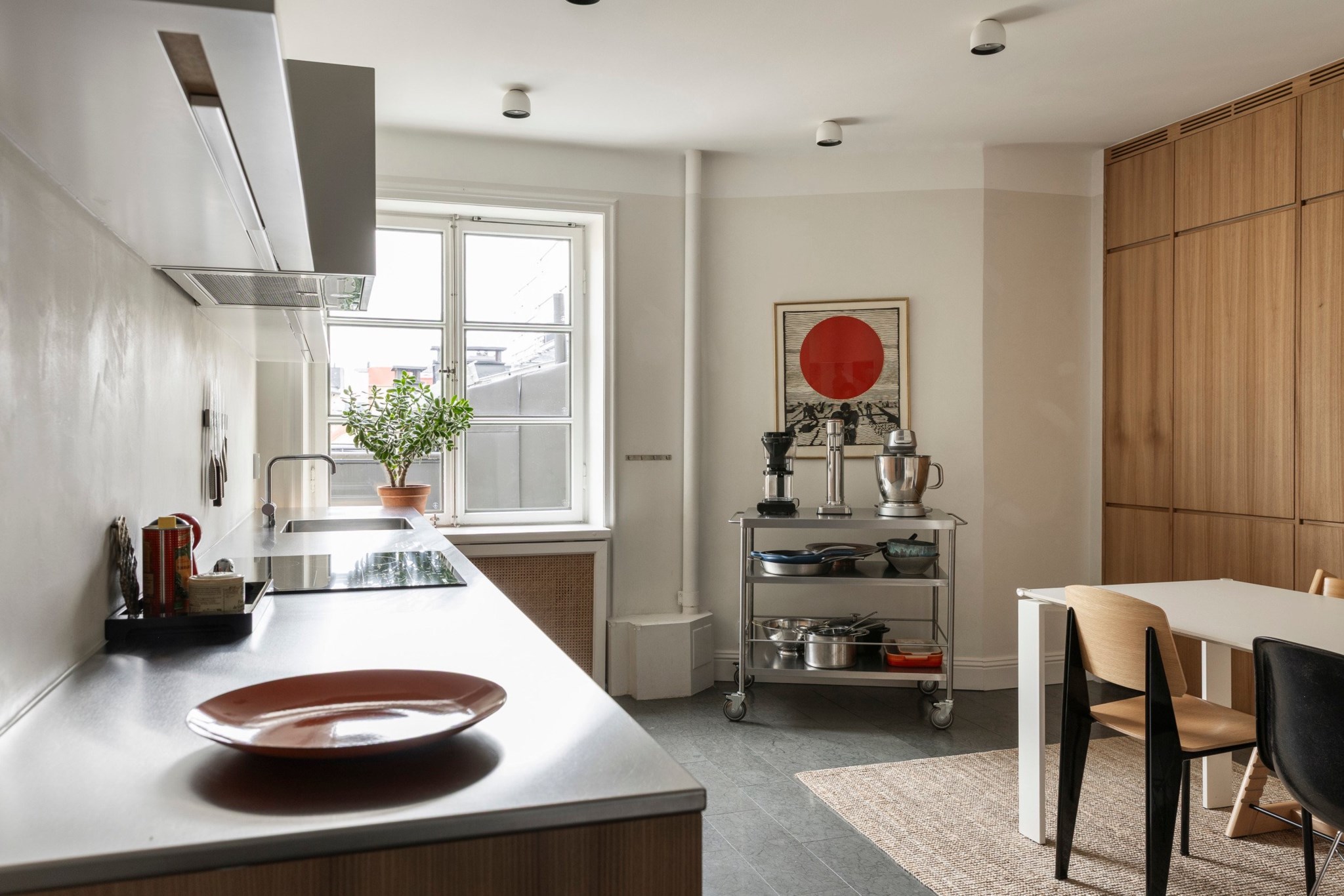 Ljust och rymligt kök med gott om förvaring och arbetsyta. Inredningen går i tidlös stil med träfanérade luckor, grå bänkskiva och öppna hyllor som ger en luftig känsla. Fullt utrustat med kyl/frys, diskmaskin, ugn, häll och fläkt. Generöst fönsterparti ger fint ljusinsläpp och utsikt mot den lugna innergården. Matplats för flera personer.
