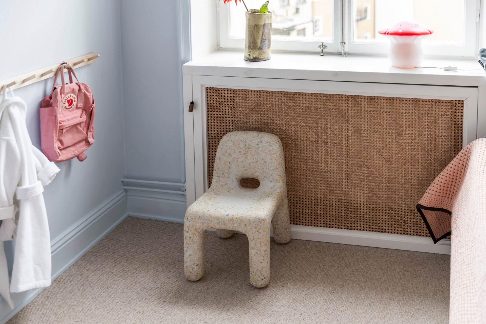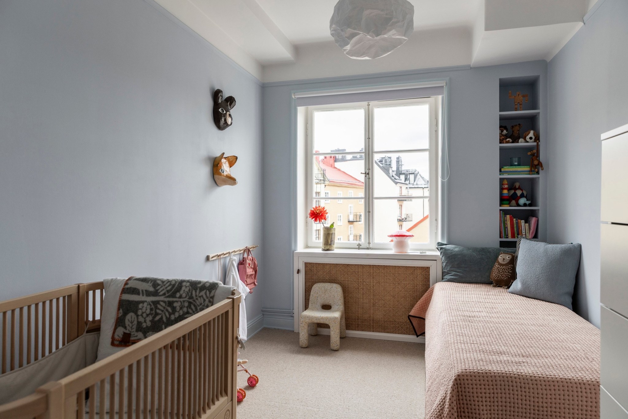 Ljust och charmigt sovrum som passar perfekt som barnrum, gästrum eller arbetsrum. Rummet har lugna blå väggar, stort fönster med utsikt över takåsar samt praktisk förvaring i både garderob och inbyggda hyllor.