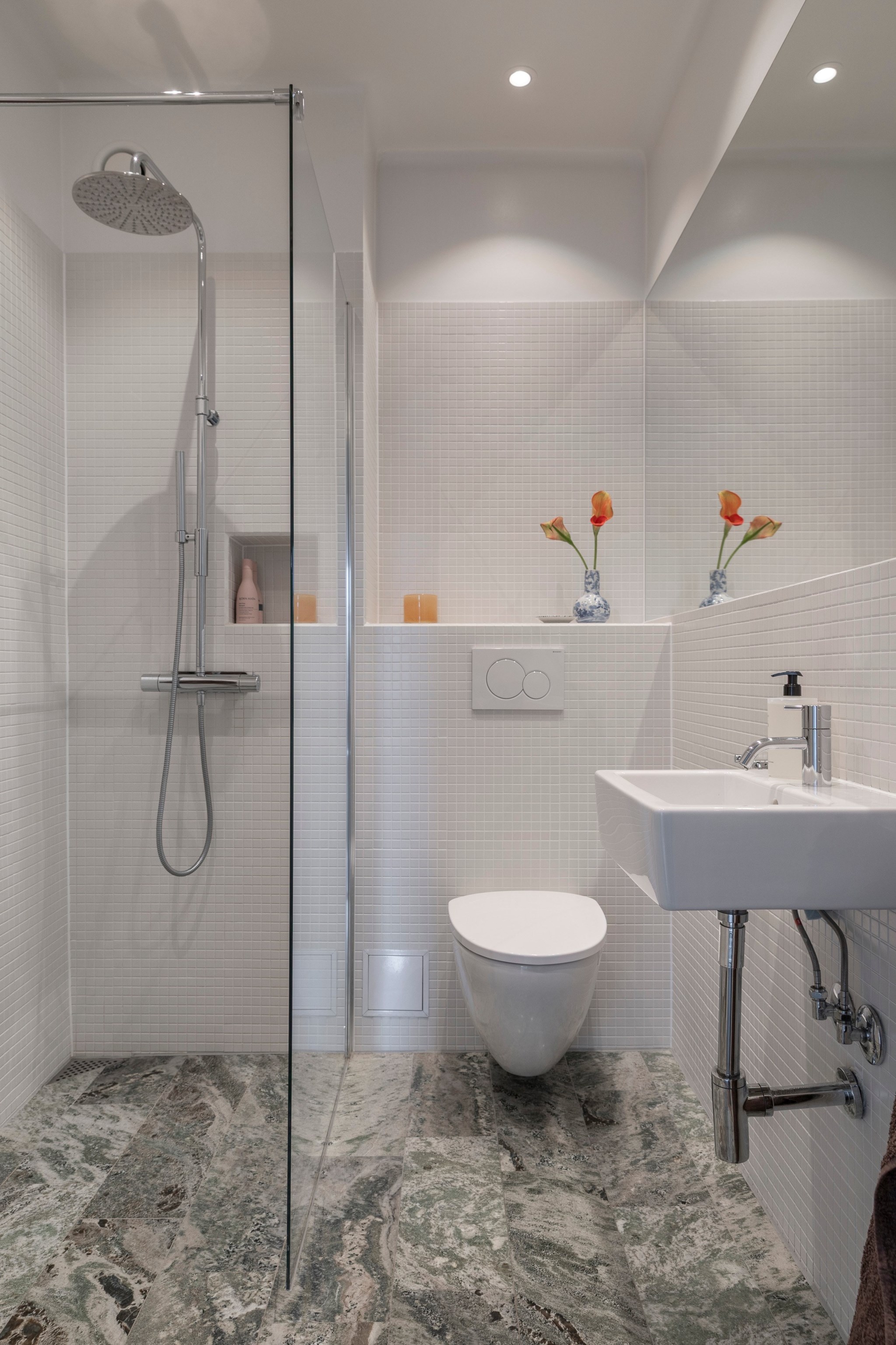 Badrummet är stilrent och påkostat med vitt kakel, exklusivt golv i natursten, dusch bakom glasvägg samt vägghängd WC och handfat med spegel ovan. Infällda spotlights i taket ger en mjuk och modern belysning.