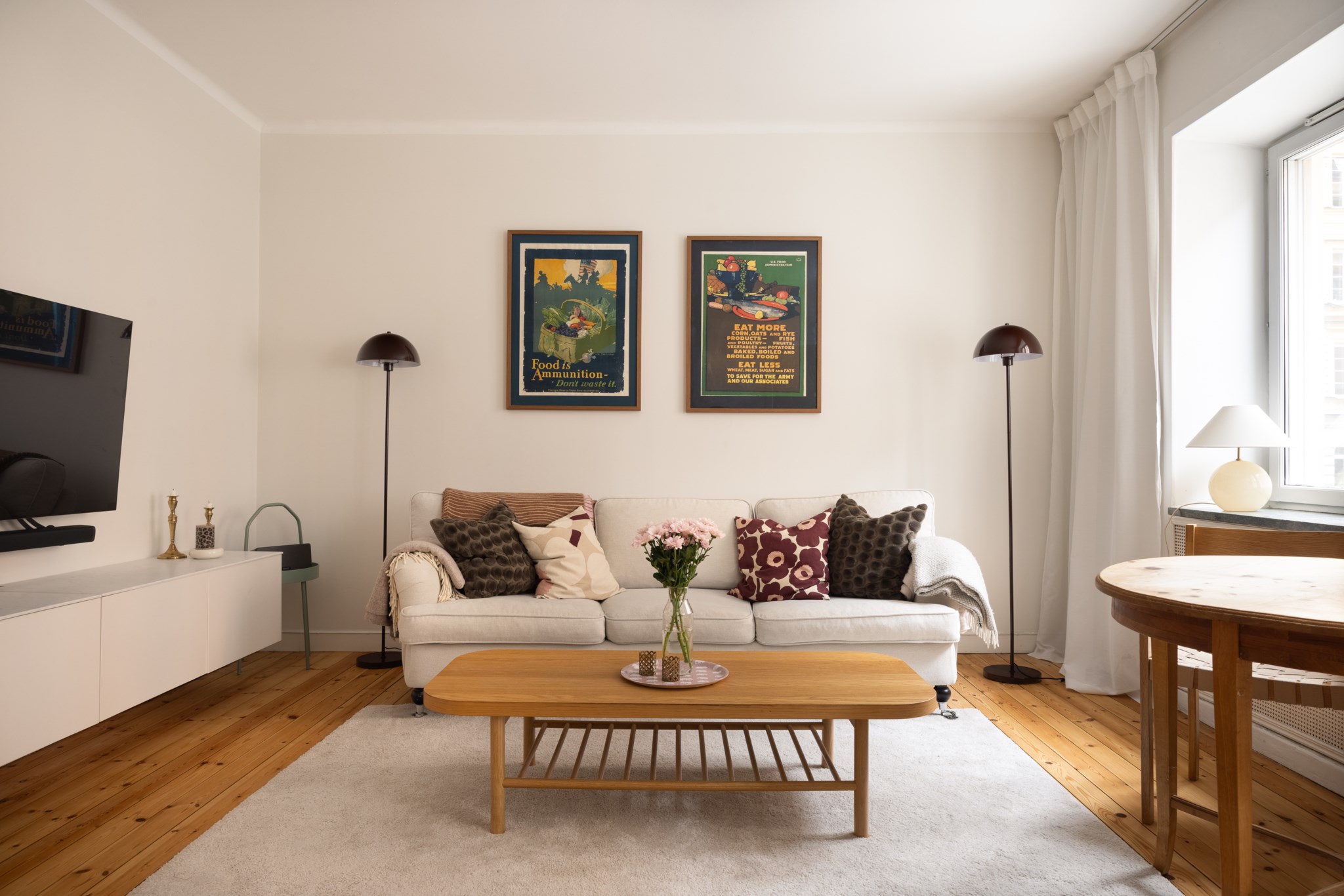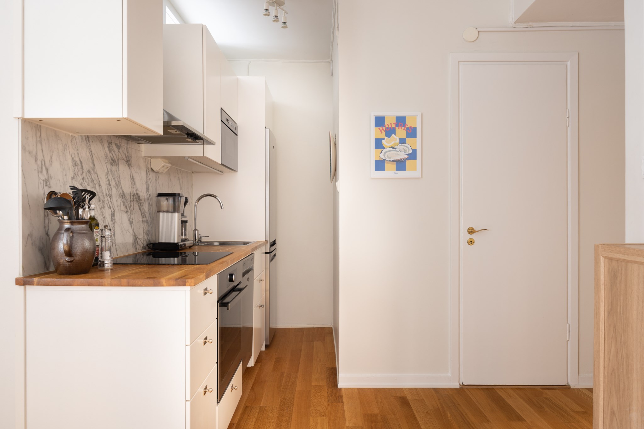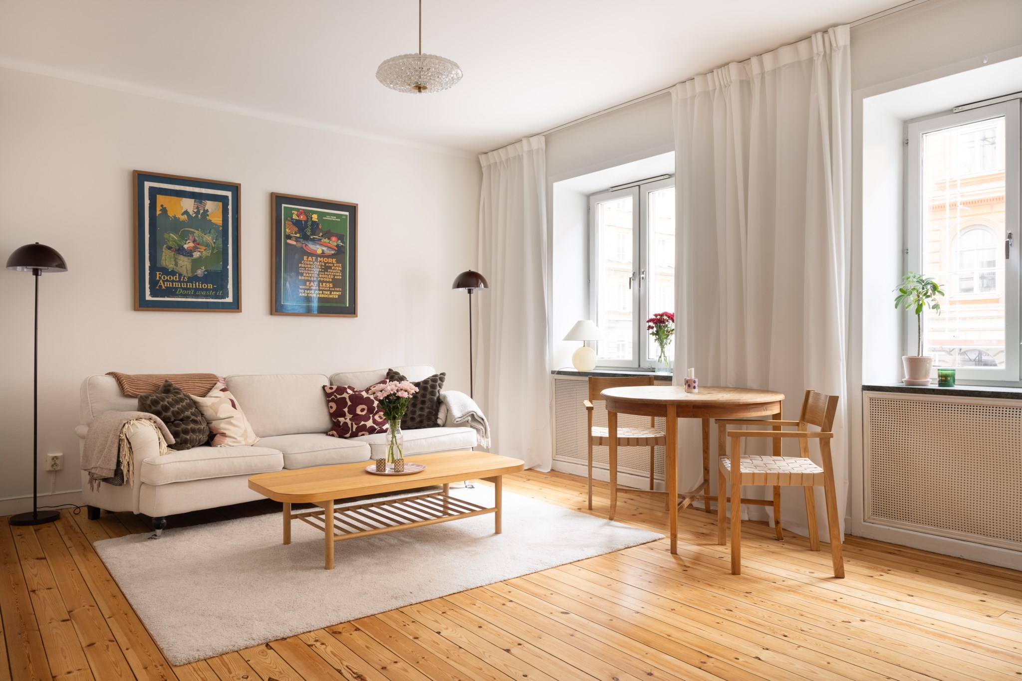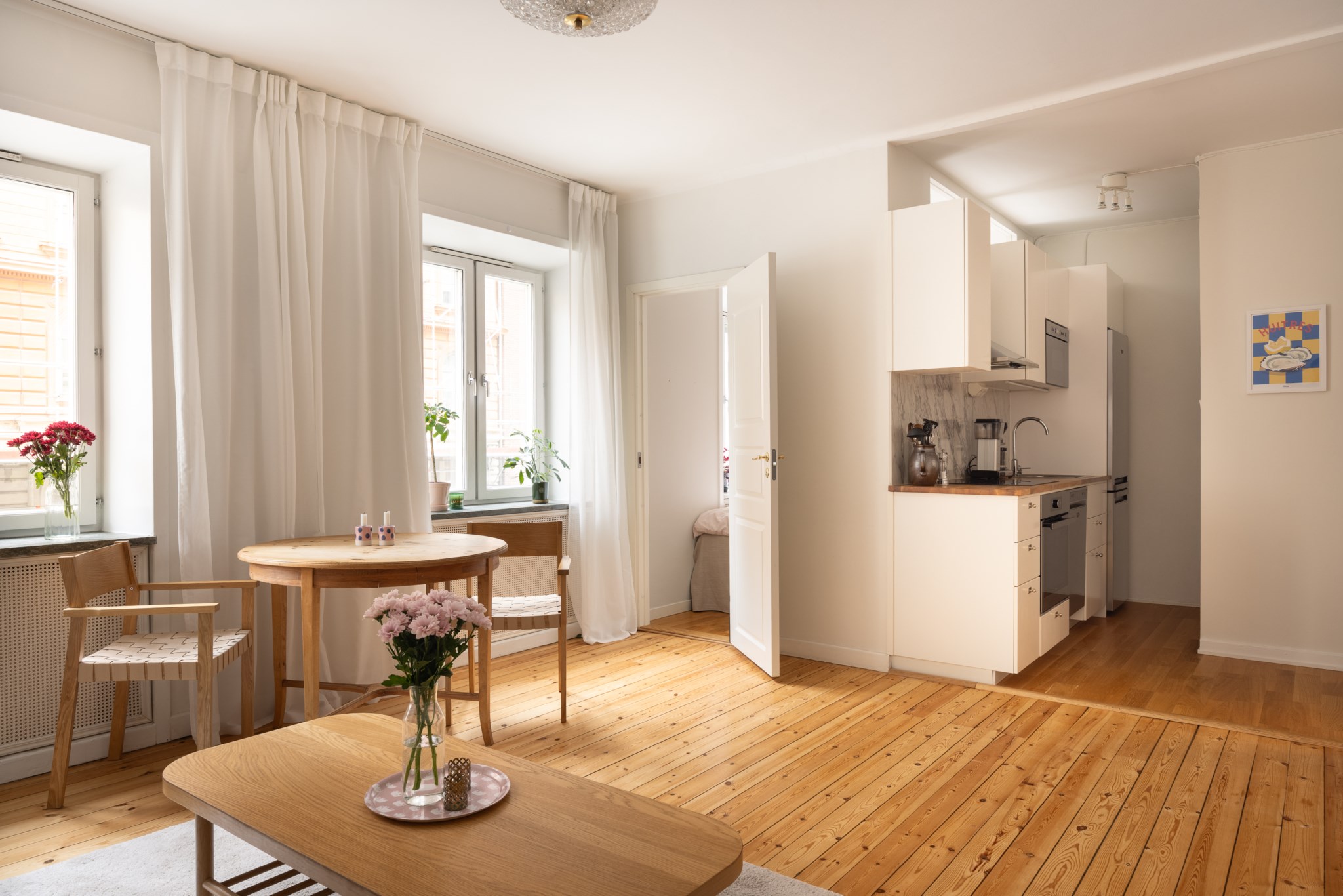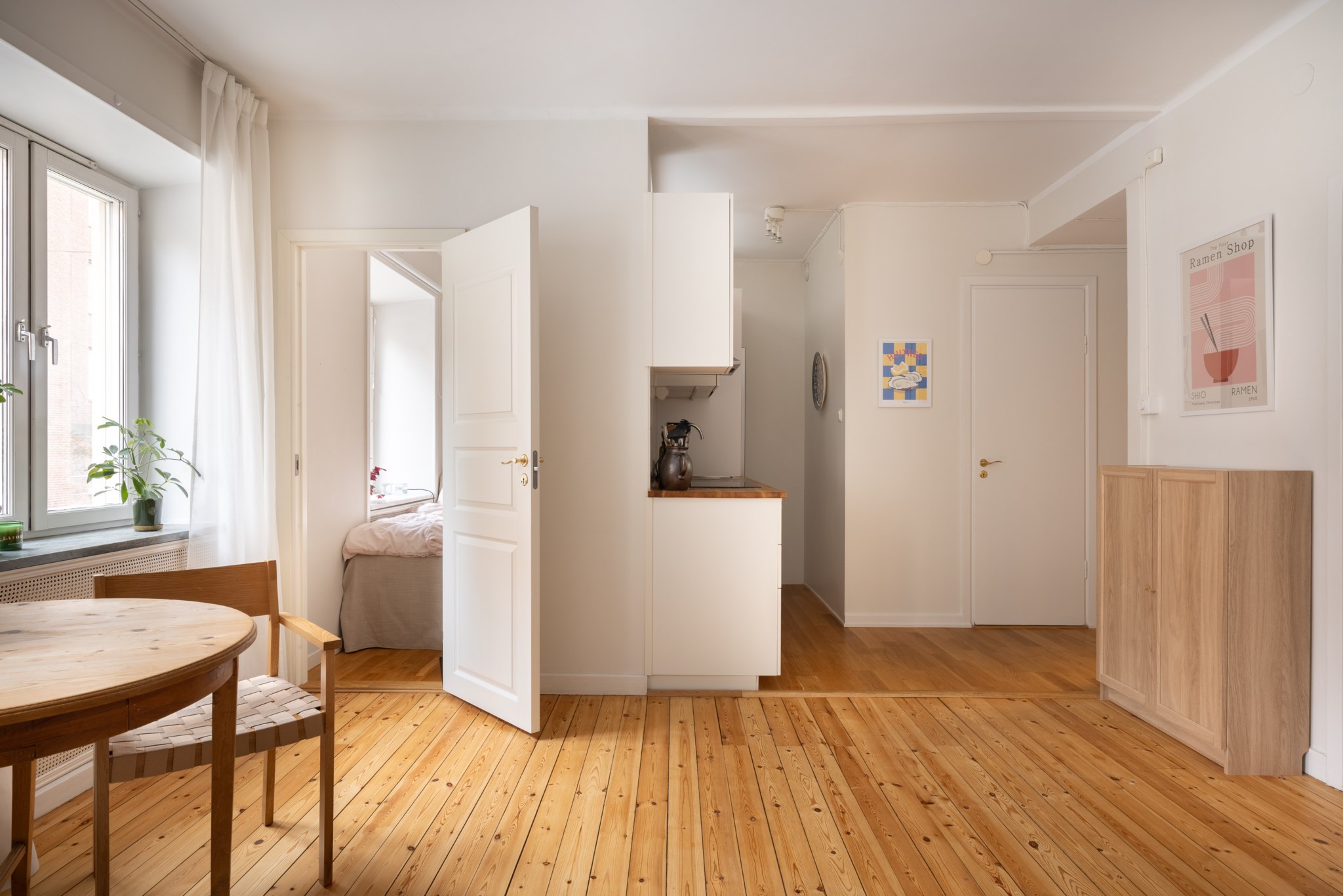 Den luftiga planlösningen skapar en härlig rymd där vardagsrum och kök samspelar på ett naturligt sätt. De generösa fönstren släpper in rikligt med ljus som dansar över de vackra originalgolven i trä. Köket är smakfullt renoverat med stilrena vita luckor, bänkskiva i trä och exklusiv marmorbård som ger en lyxig känsla. Det charmiga vardagsrummet rymmer både soffa och matplats, perfekt för både vardag och sociala tillställningar. Sovrummet är rofyllt med smart förvaring och plats för dubbelsäng. Badrummet är helkaklat i vitt med grå klinker på golv – stilrent, fräscht och tidlöst.