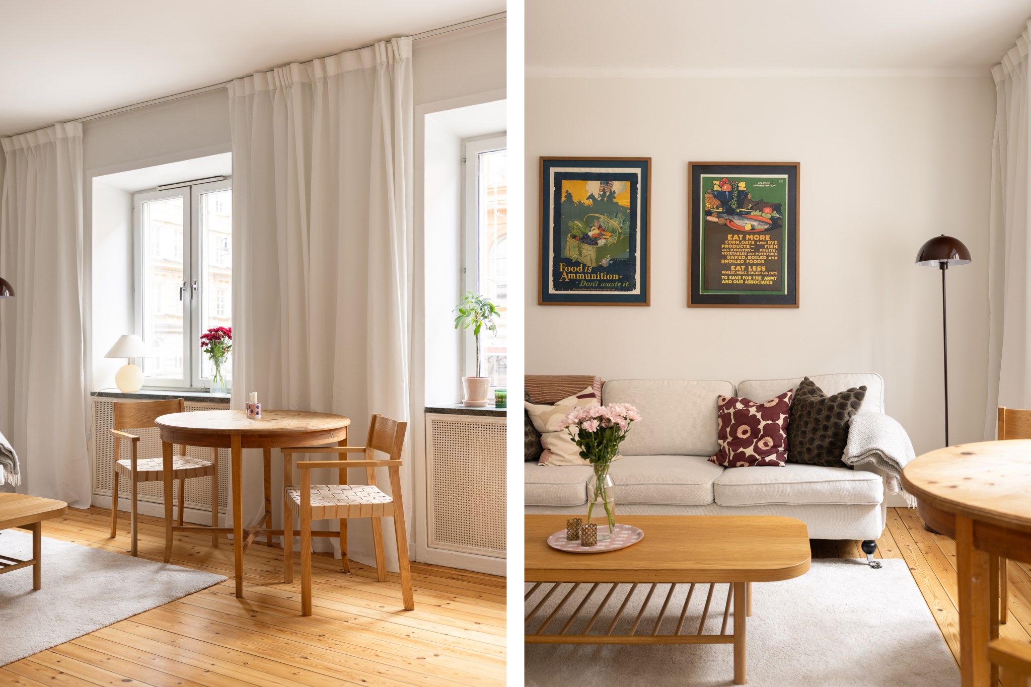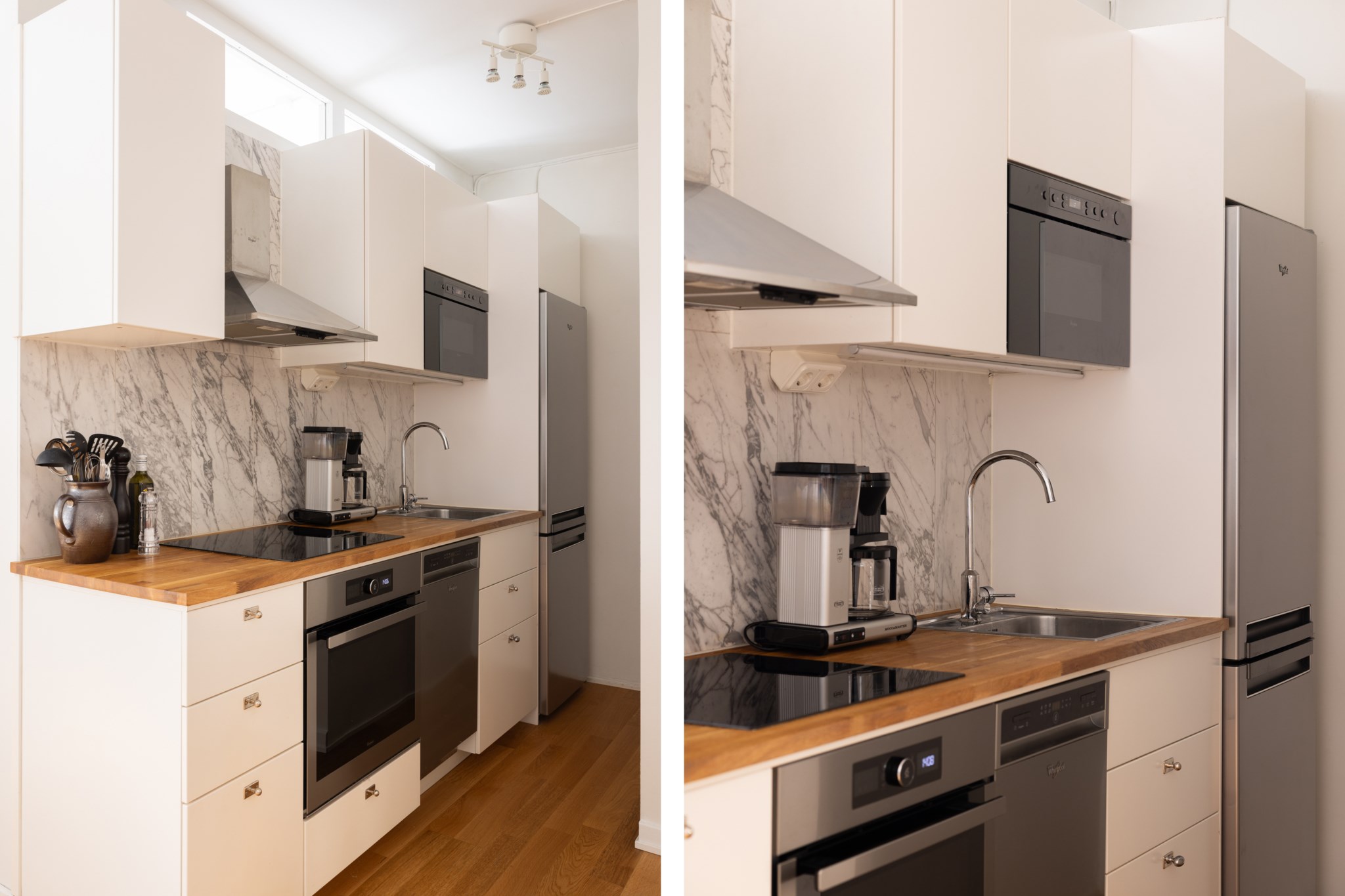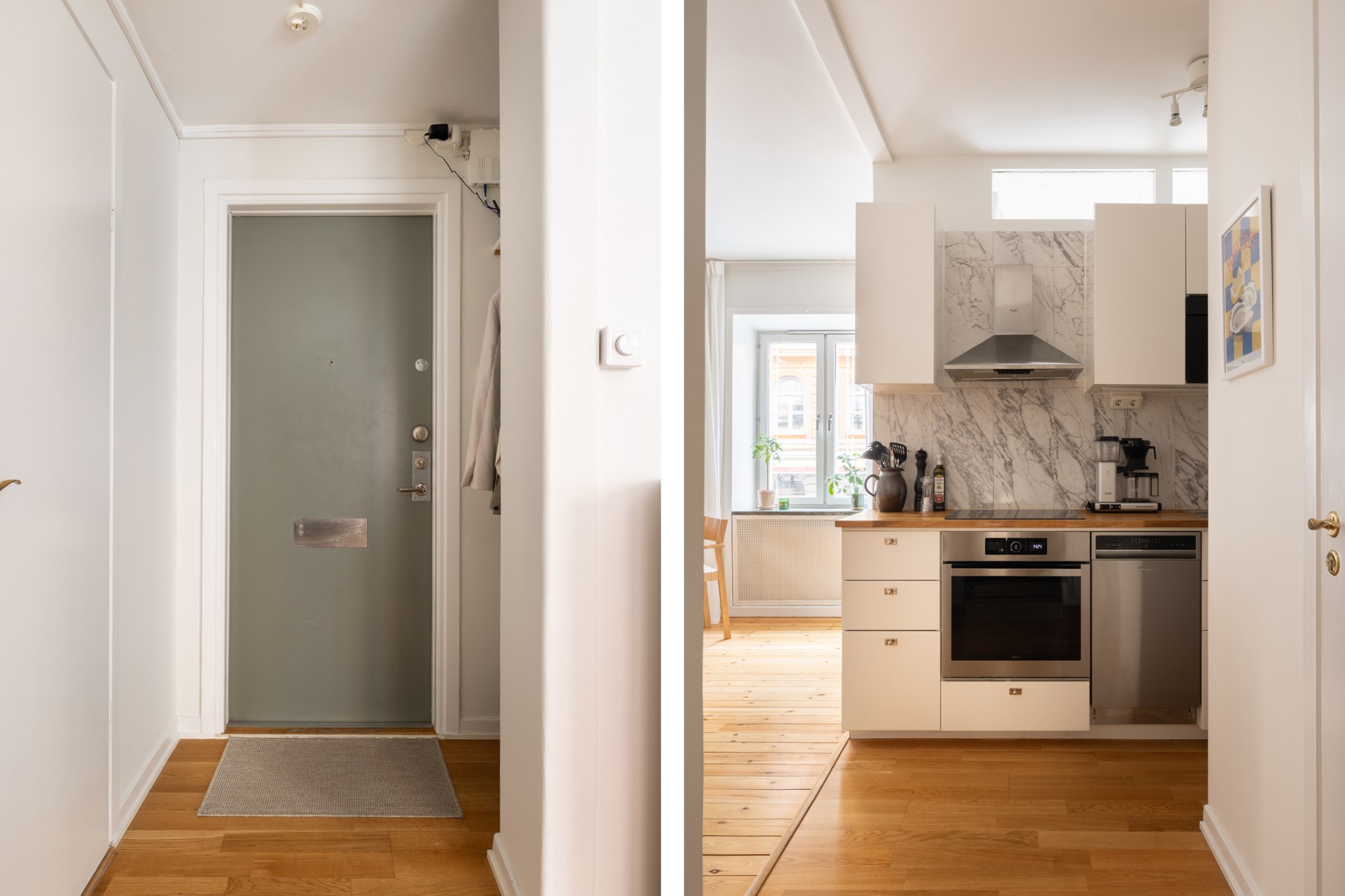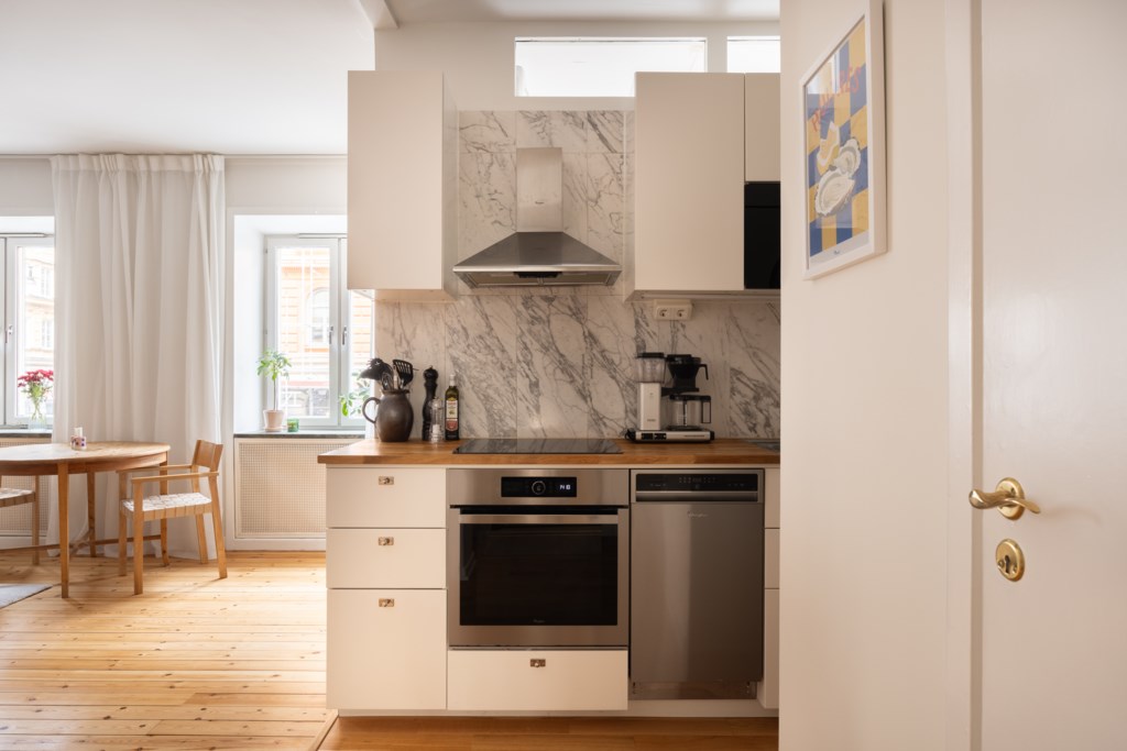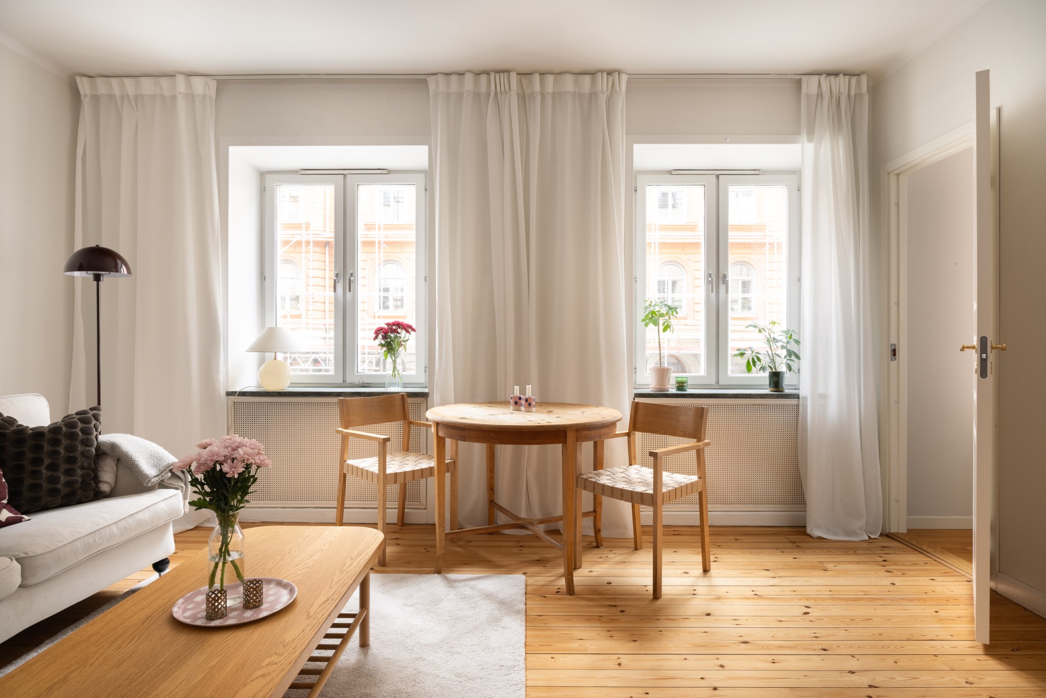 Den luftiga planlösningen skapar en härlig rymd där vardagsrum och kök samspelar på ett naturligt sätt. De generösa fönstren släpper in rikligt med ljus som dansar över de vackra originalgolven i trä. Köket är smakfullt renoverat med stilrena vita luckor, bänkskiva i trä och exklusiv marmorbård som ger en lyxig känsla. Det charmiga vardagsrummet rymmer både soffa och matplats, perfekt för både vardag och sociala tillställningar. Sovrummet är rofyllt med smart förvaring och plats för dubbelsäng. Badrummet är helkaklat i vitt med grå klinker på golv – stilrent, fräscht och tidlöst.