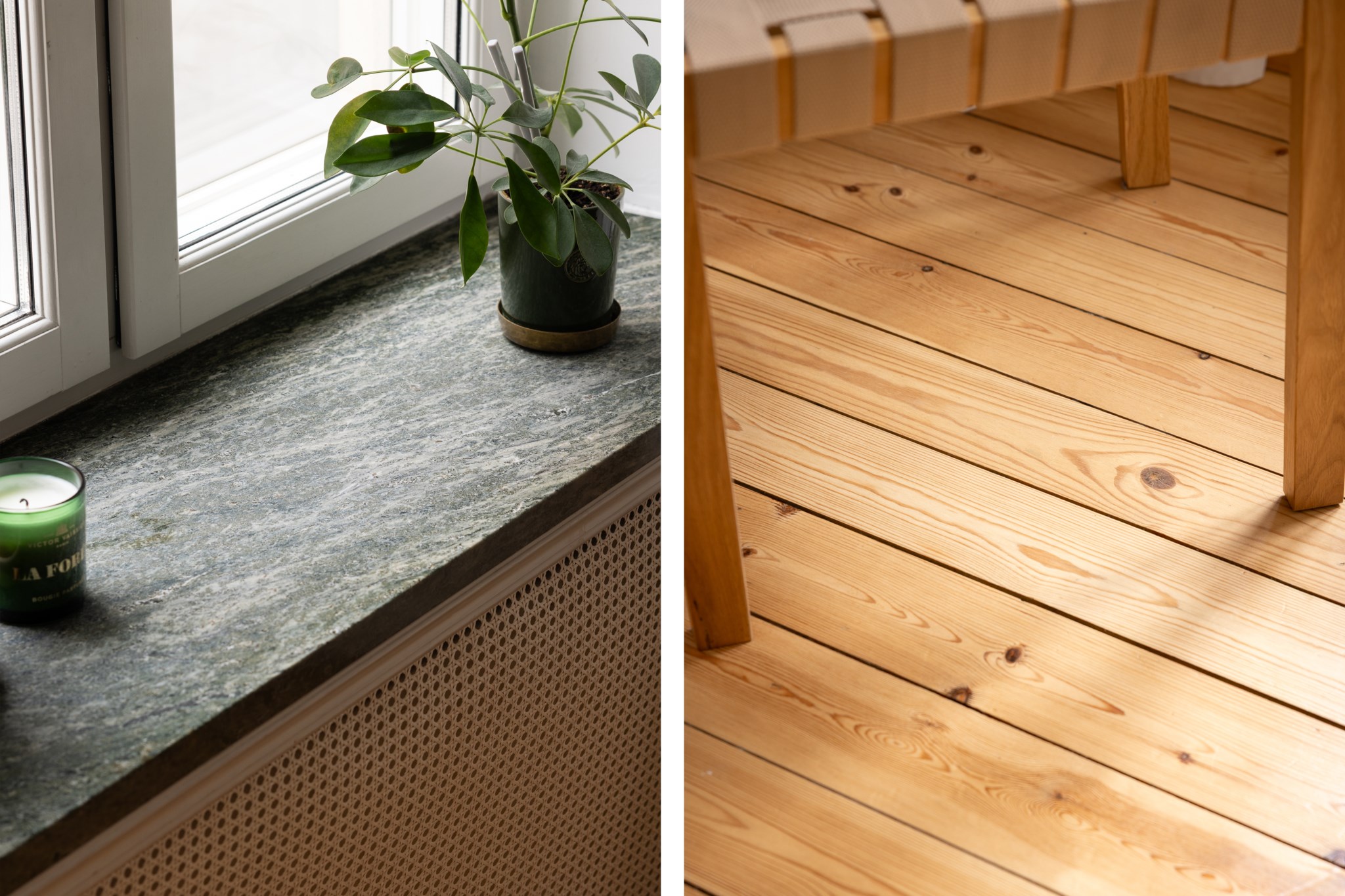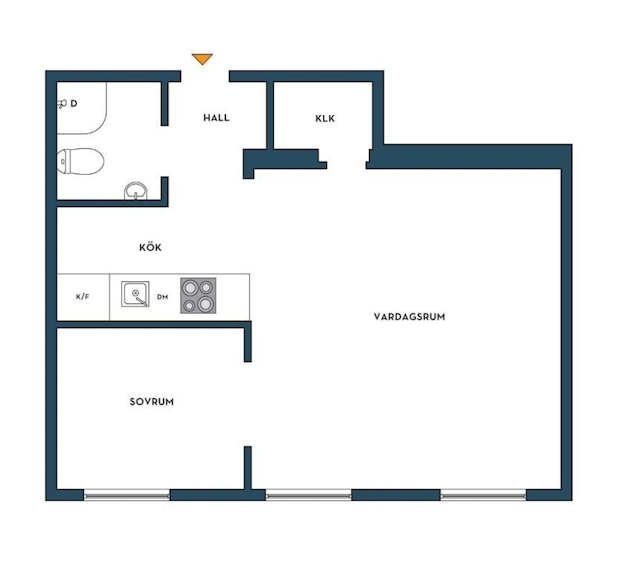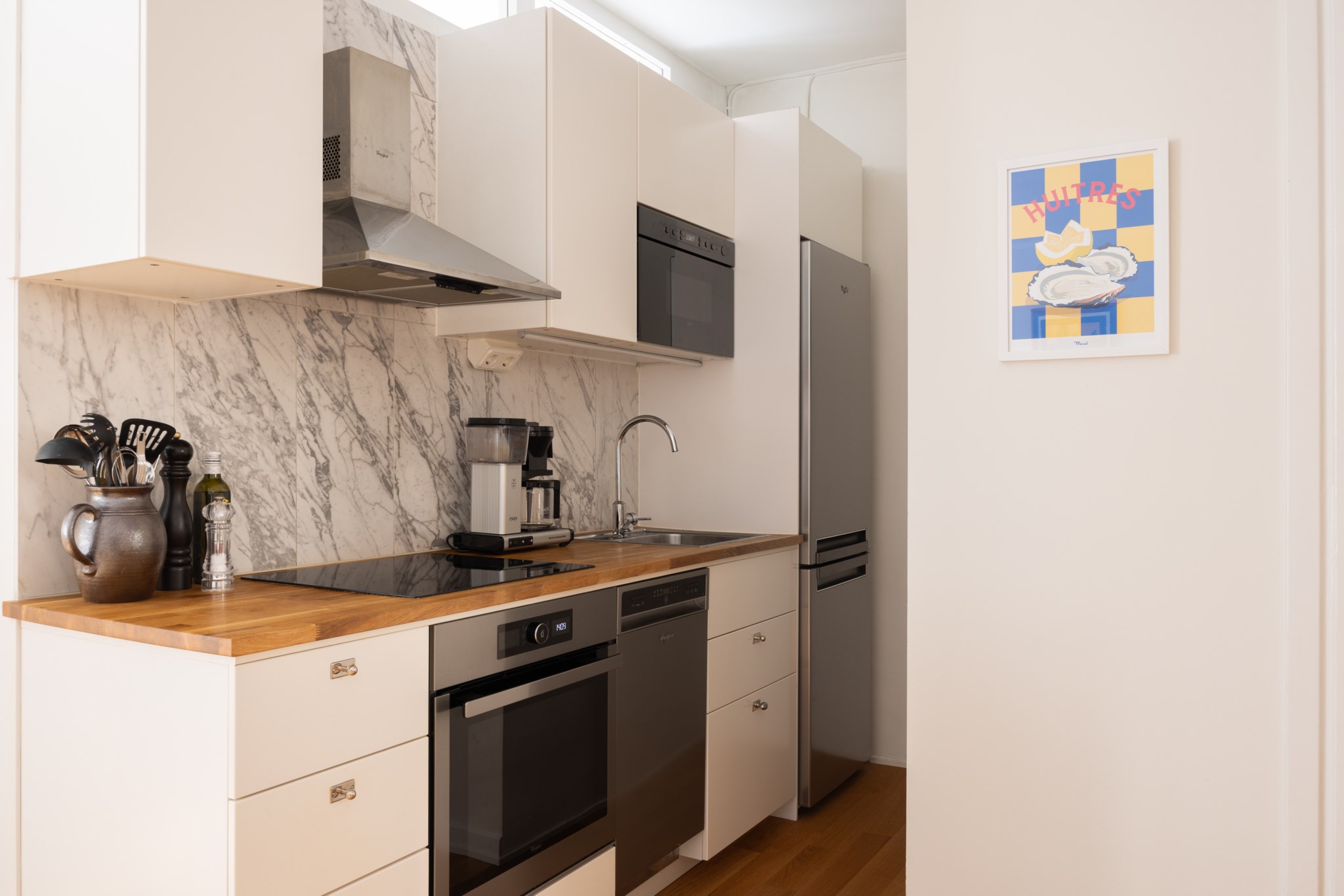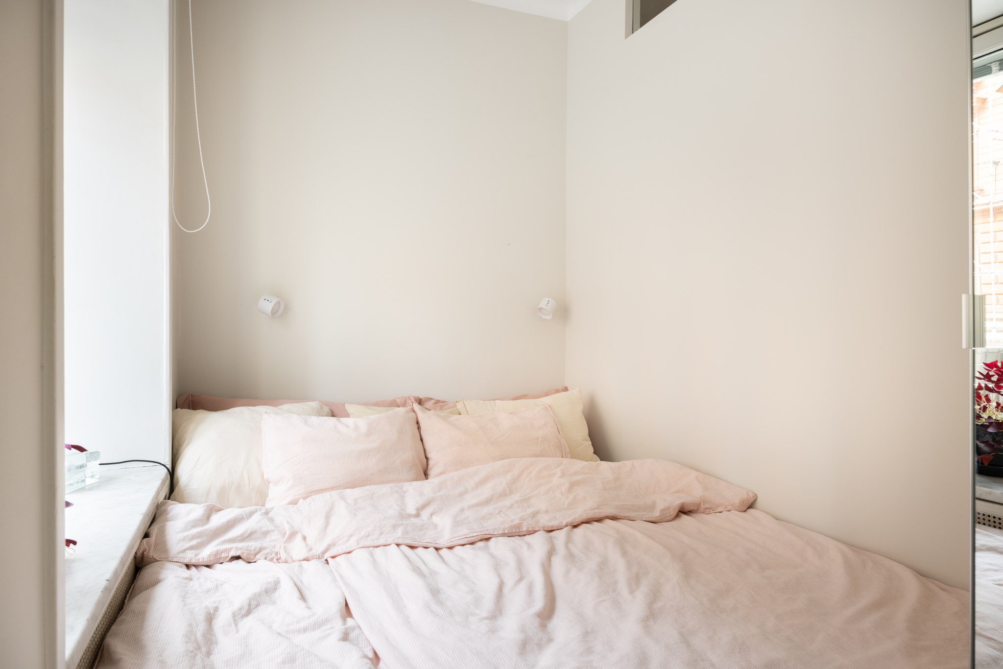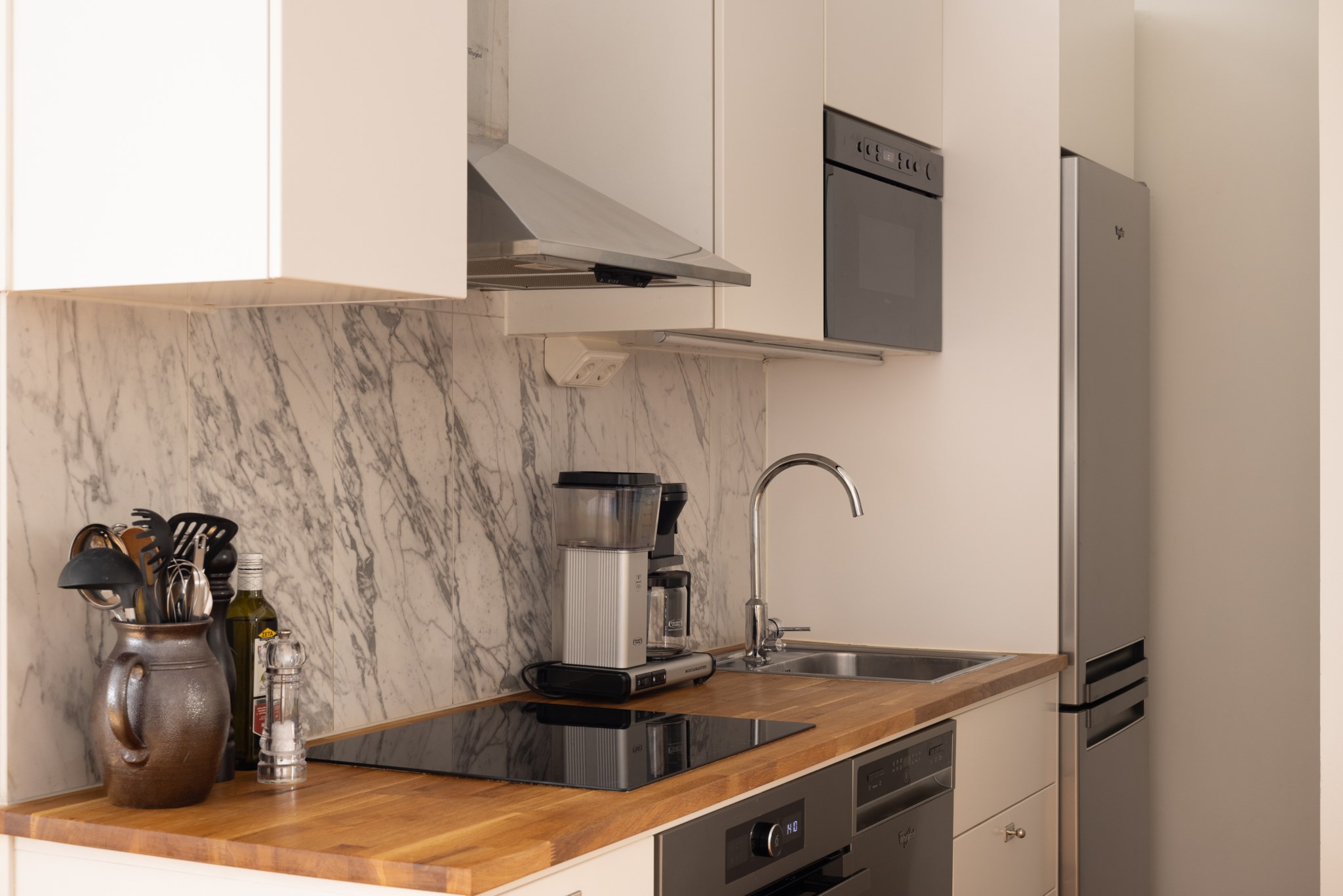 Den luftiga planlösningen skapar en härlig rymd där vardagsrum och kök samspelar på ett naturligt sätt. De generösa fönstren släpper in rikligt med ljus som dansar över de vackra originalgolven i trä. Köket är smakfullt renoverat med stilrena vita luckor, bänkskiva i trä och exklusiv marmorbård som ger en lyxig känsla. Det charmiga vardagsrummet rymmer både soffa och matplats, perfekt för både vardag och sociala tillställningar. Sovrummet är rofyllt med smart förvaring och plats för dubbelsäng. Badrummet är helkaklat i vitt med grå klinker på golv – stilrent, fräscht och tidlöst.