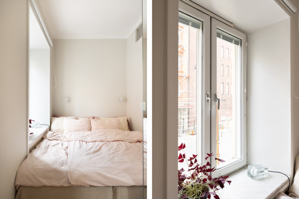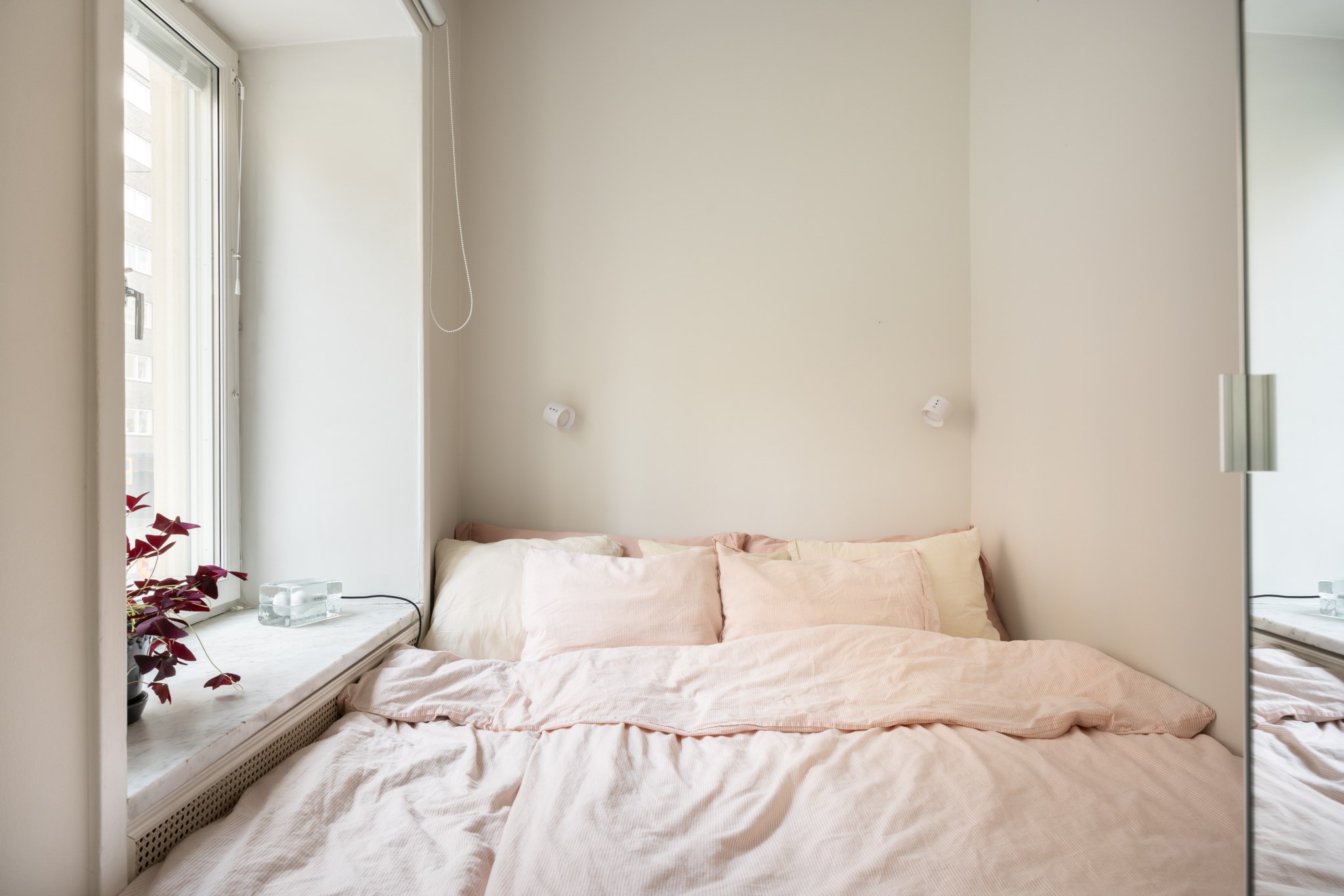 Mysigt sovrum med plats för säng. Ytskikten består av ljusa väggar och parkettgolv. Ett härligt ljusinsläpp tar sig in via stort fönster.