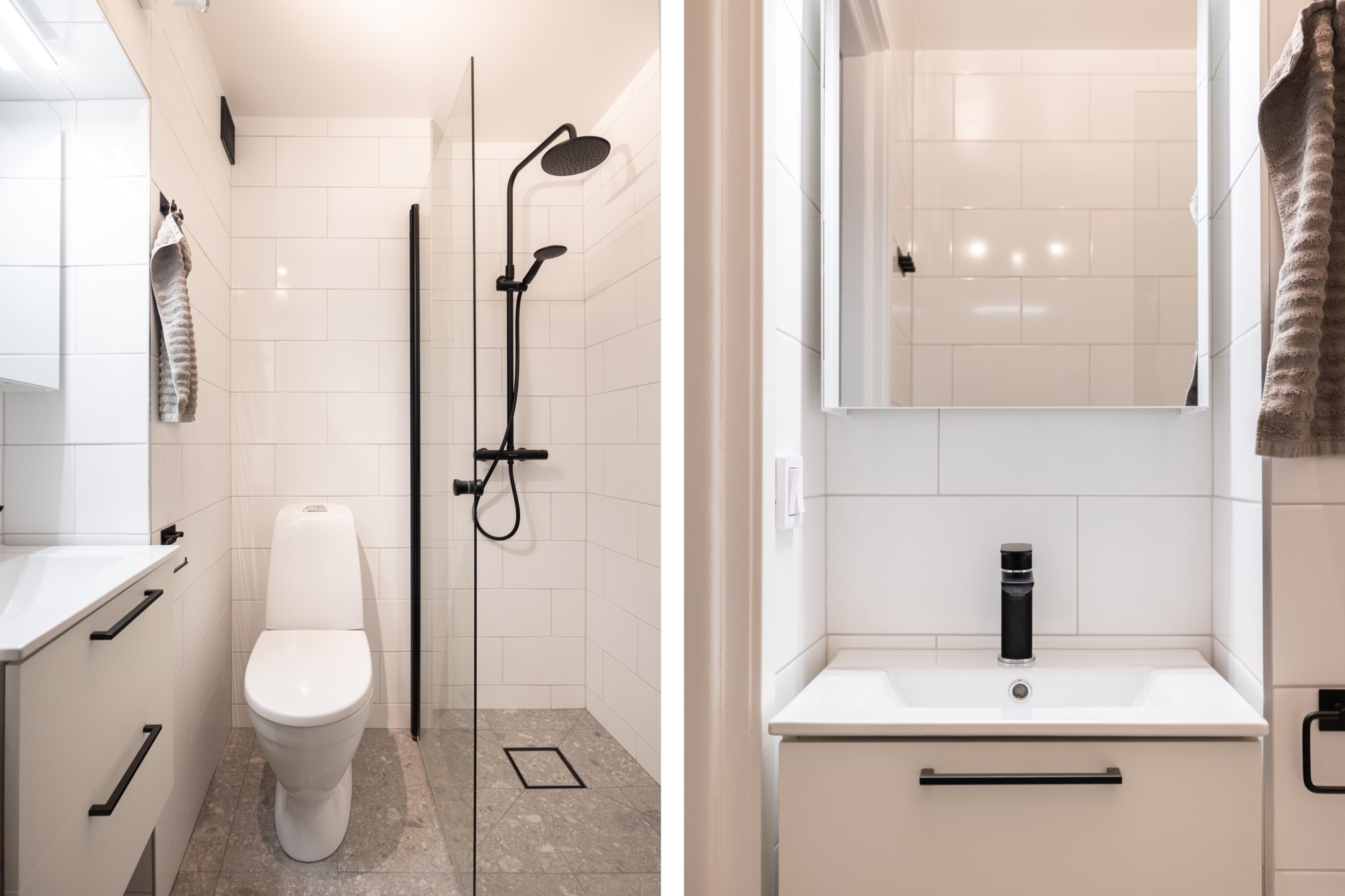 Rymligt badrum med smakfulla materialval bestående av vitt kakel och klinker i grå nyans. Badrummet är utrustat med WC, handfat med kommod, spegelskåp samt takdusch med glasvägg.