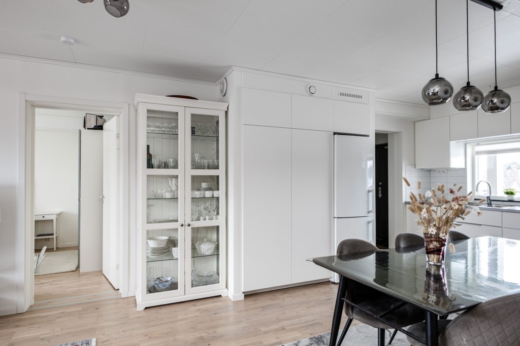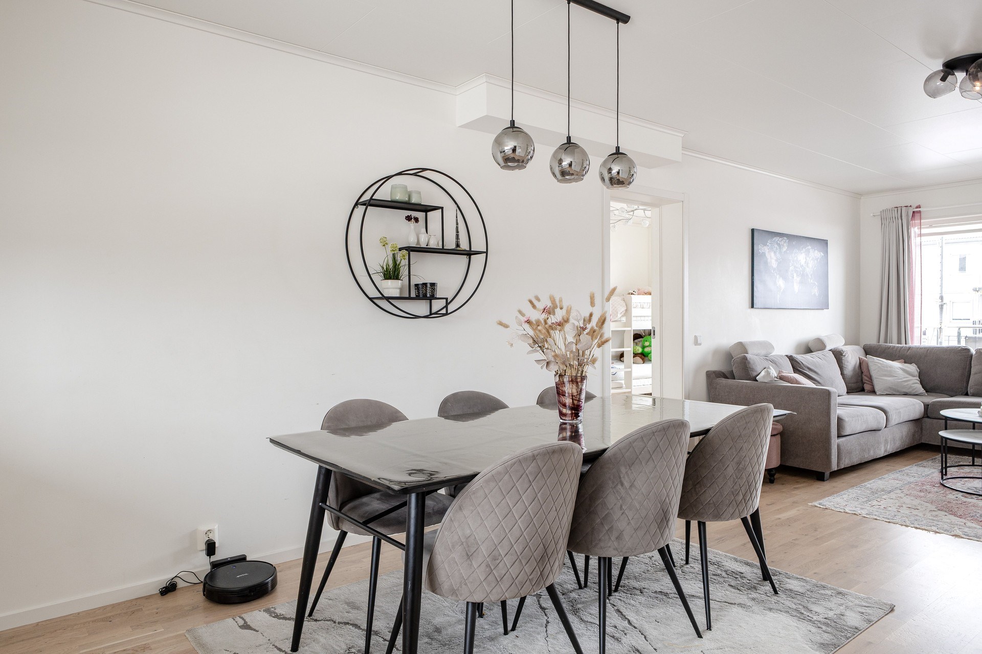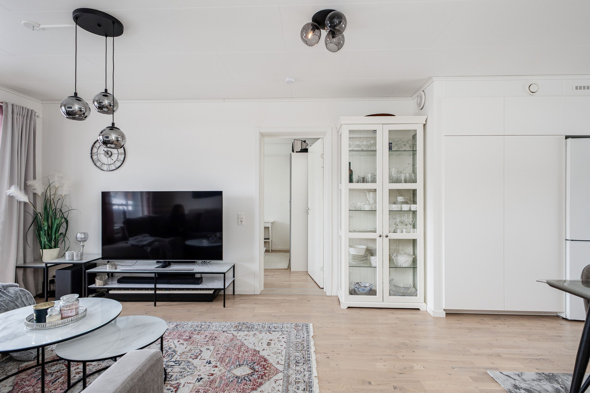 Ljust vardagsrum med social öppen planlösning mot köket. Generöst ljusinsläpp från två stora fönsterpartier samt utgång till bostadens balkong. Rummet rymmer både en bekväm sällskapsdel och matgrupp. Väggarna är målade och golvet belagt med parkettgolv.