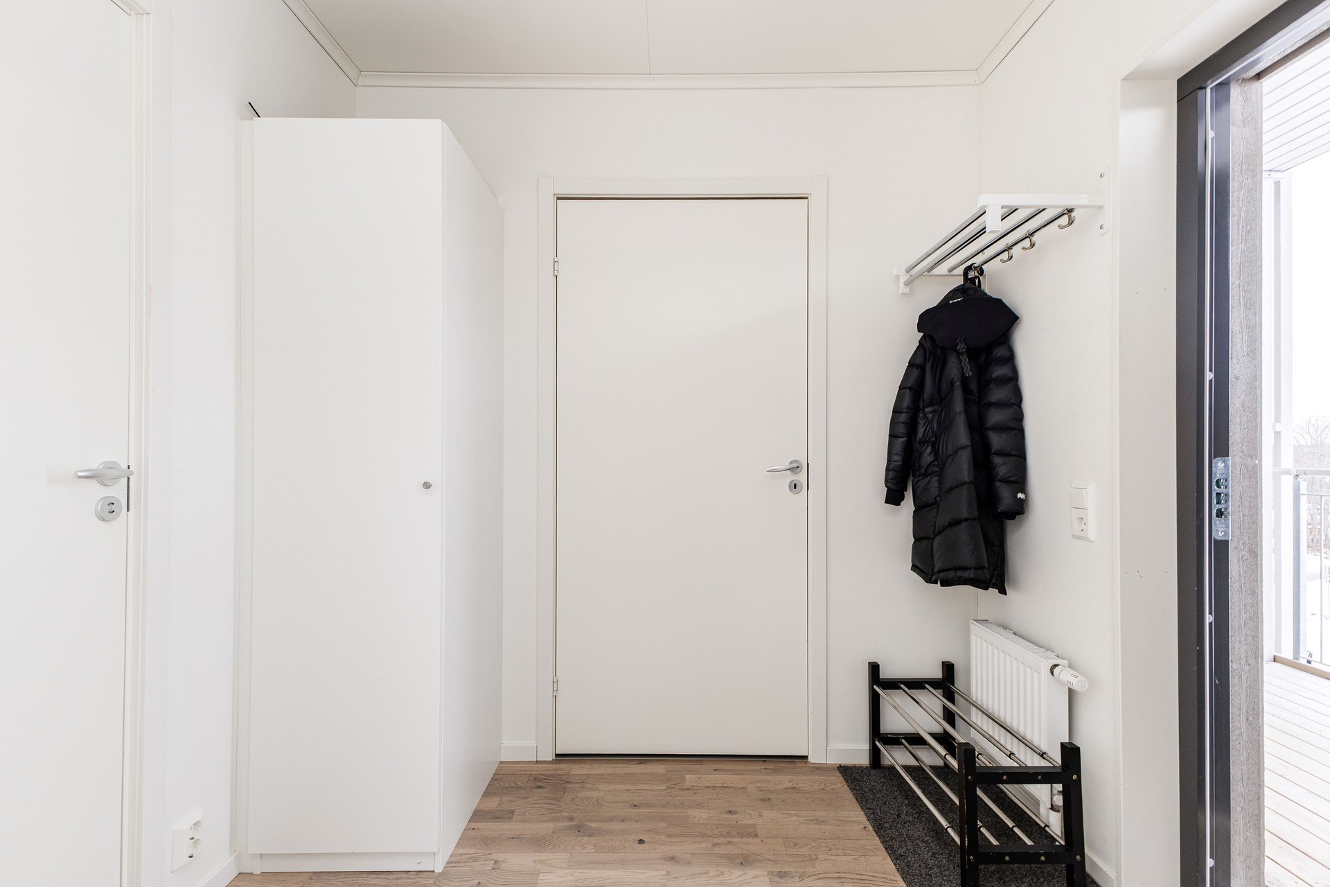 Välkomnande hall med ljust målade väggar och parkettgolv. Hallen erbjuder plats till avhängningsmöjligheter för ytterkläder och skor precis intill ytterdörren.